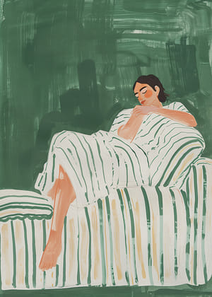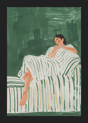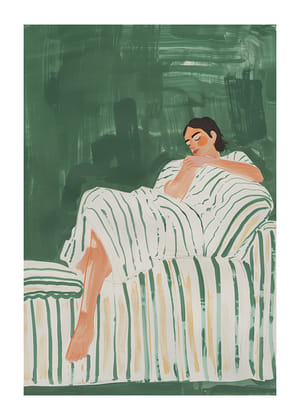 Ezek a poszterek a kikapcsolódás és a stílus harmonikus ötvözetét kínálják zöld tónusaikkal, amelyek körülölelik a nézőt. Az első rész egy csíkokba burkolt, pihenő alakot ábrázol, míg a második a modern dizájnt mutatja be egy elegáns székkel. Együttesen kiegyensúlyozott kifejezést alkotnak, amely elmélyíti a szobát és nyugalom érzetét kelti. Tökéletesen illik a modern otthonba, ez a poszter bármilyen teret átalakít.