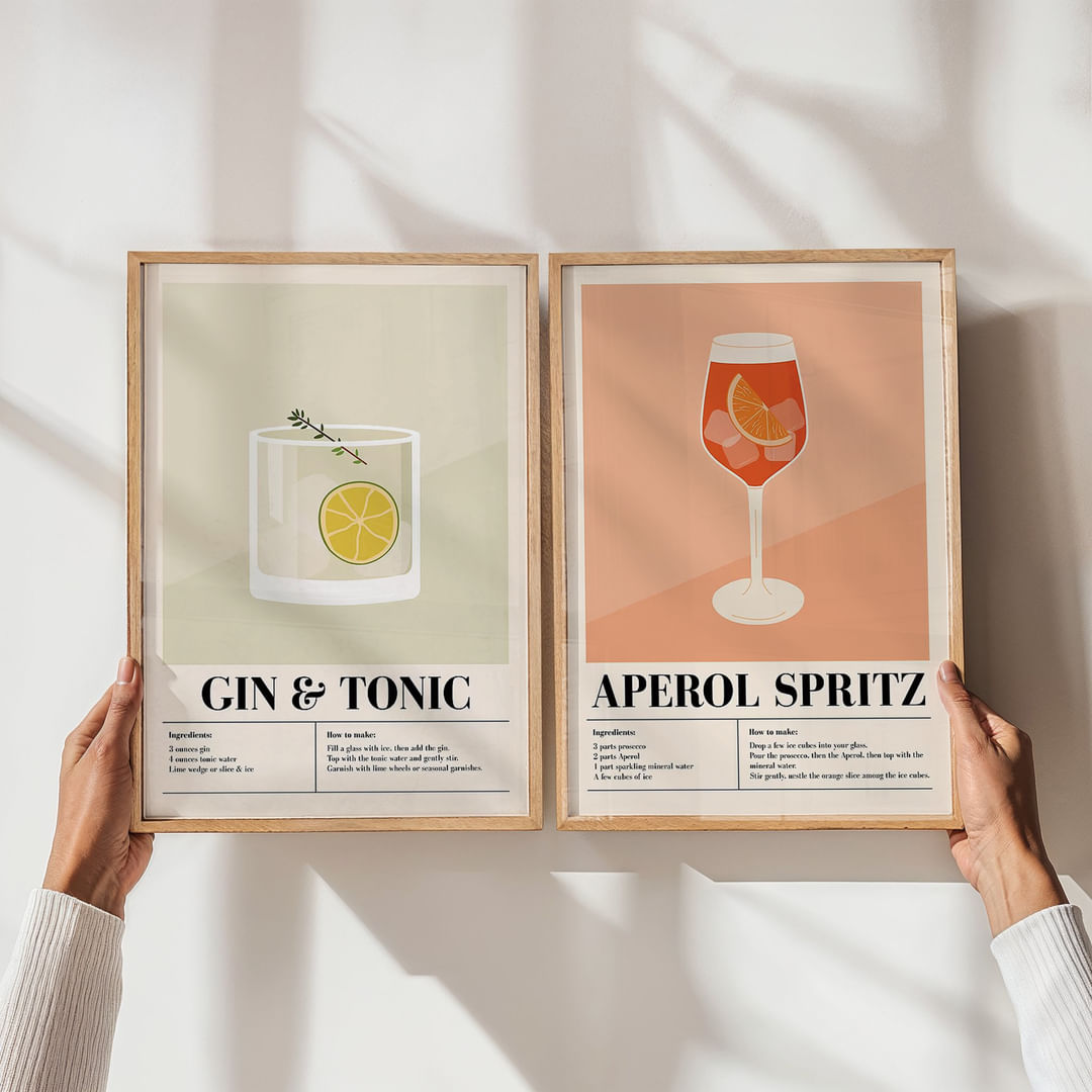Fedezd fel ezeknek a posztereknek az eleganciáját, ahol a klasszikus italok, mint például a Gin & Tonic és az Aperol Spritz, ízléses dizájnnal és kifinomult részletekkel vannak bemutatva. A letisztult vonalak és a harmonikus színek modern és időtlen hangulatot kölcsönöznek, amely bármilyen szobát feldob. Ezek a poszterek stílusos bárpulttá varázsolják a faladat, és beszélgetésre és csodálatra csábítják vendégeidet.