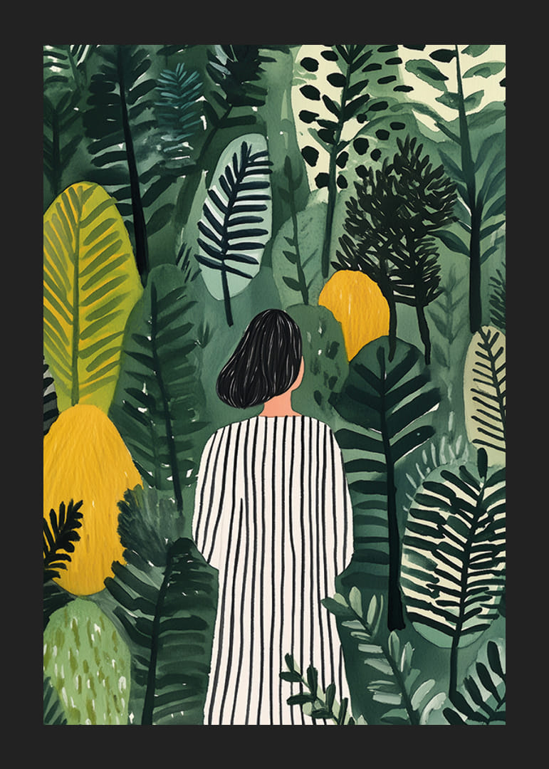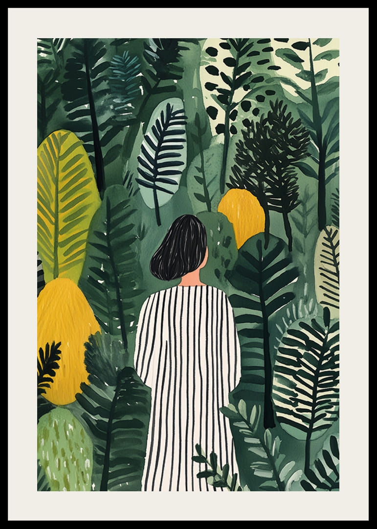 Ez a poszter azt a titokzatos és álomszerű érzést ragadja meg, amint egy csíkos ruhába öltözött nő besétál a zöld és sárga levelek buja erdőjébe. Úgy tűnik, minden lépéssel eggyé válik a természettel, körülvéve a lombok részletes és művészi kifejezésével.