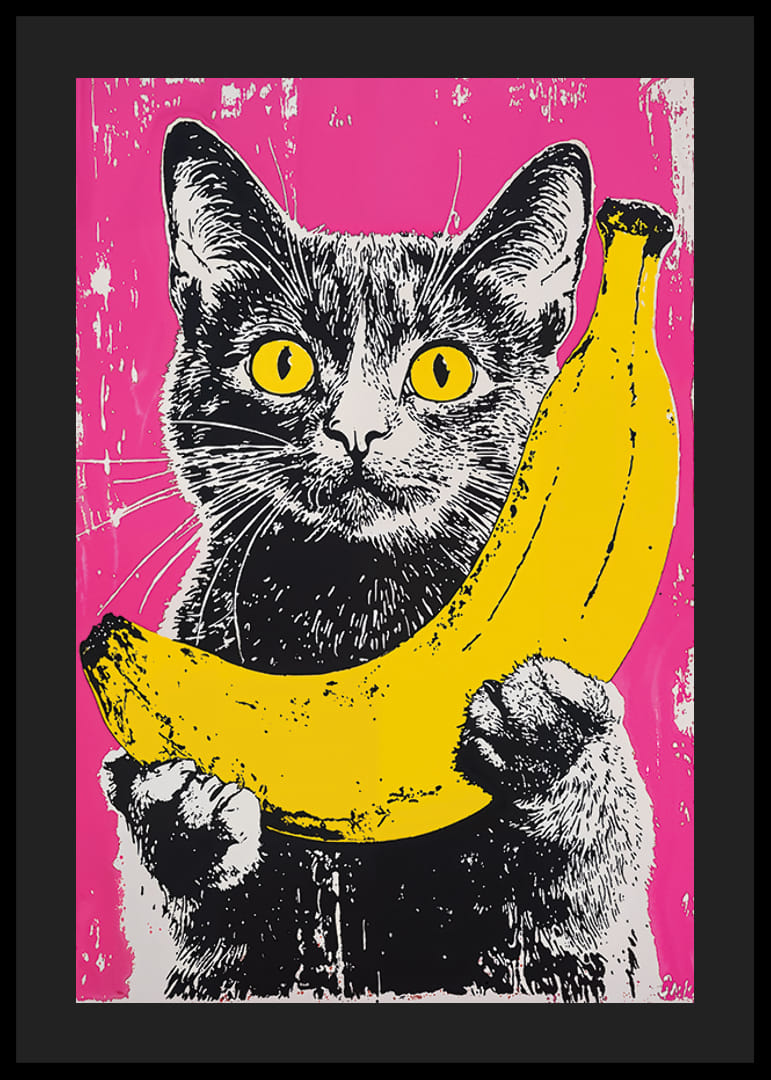 Ez a poszter erős kontrasztjaival és játékos motívumaival vonzza a tekintetet. A pop art stílusú macska élénksárga banánt tart az intenzív rózsaszín háttér előtt, amely egyszerre kelti fel a kíváncsiságot és az örömöt.