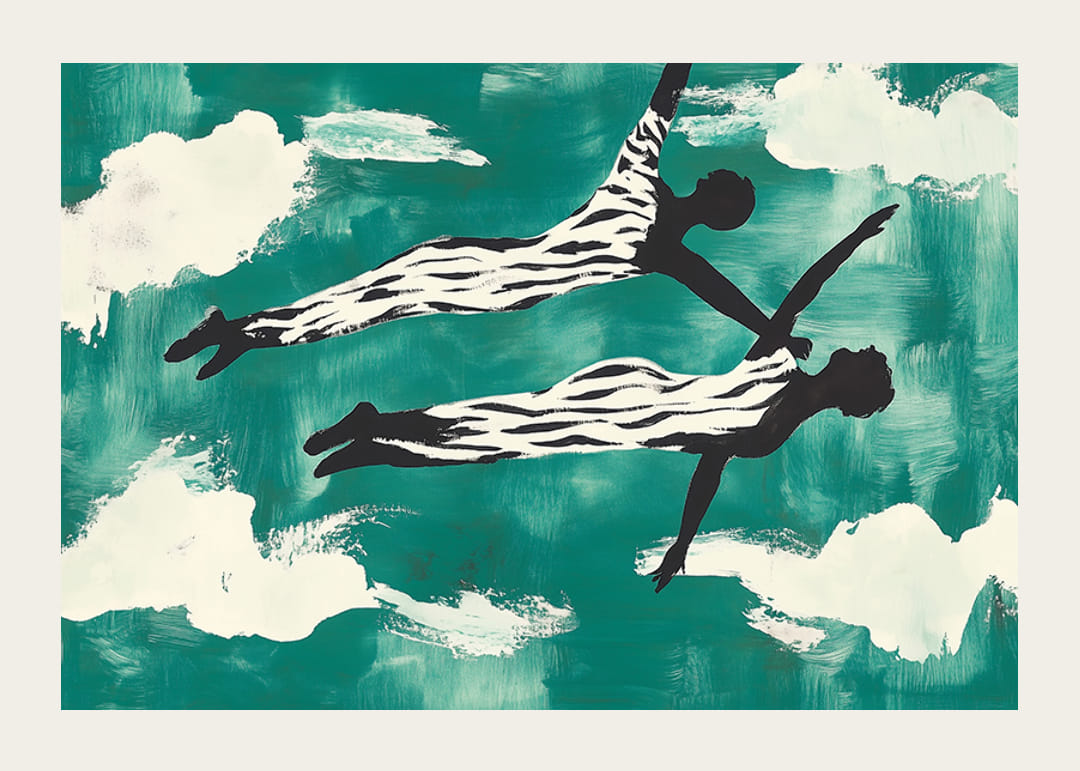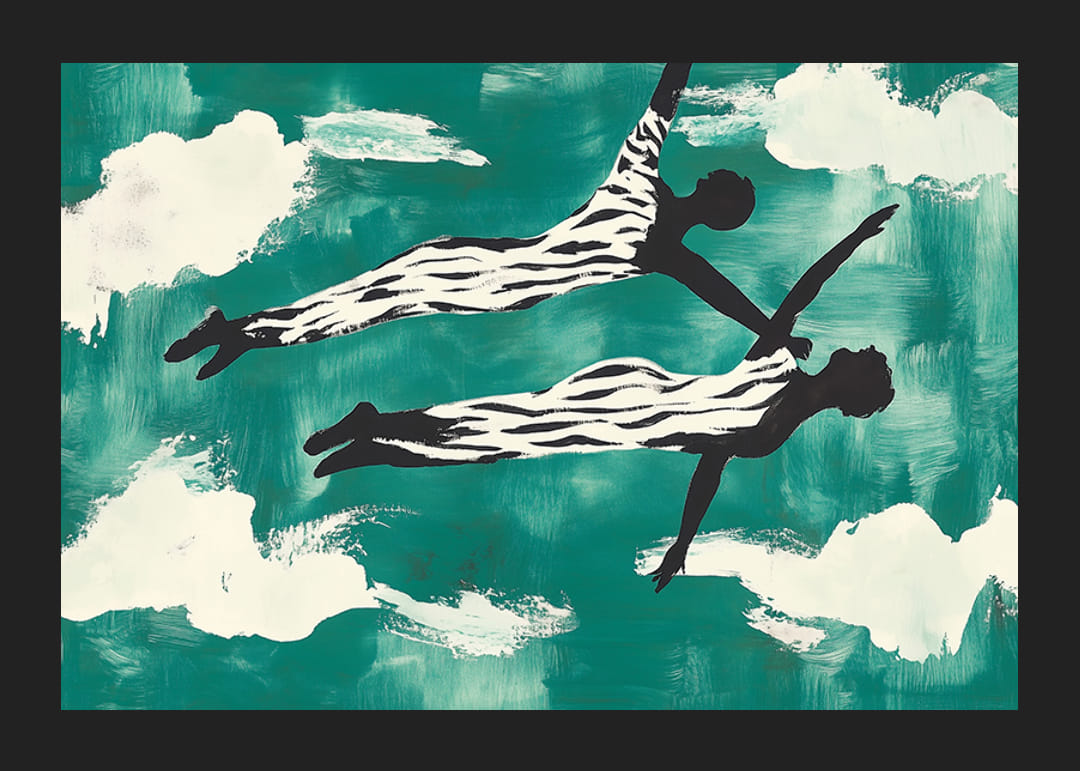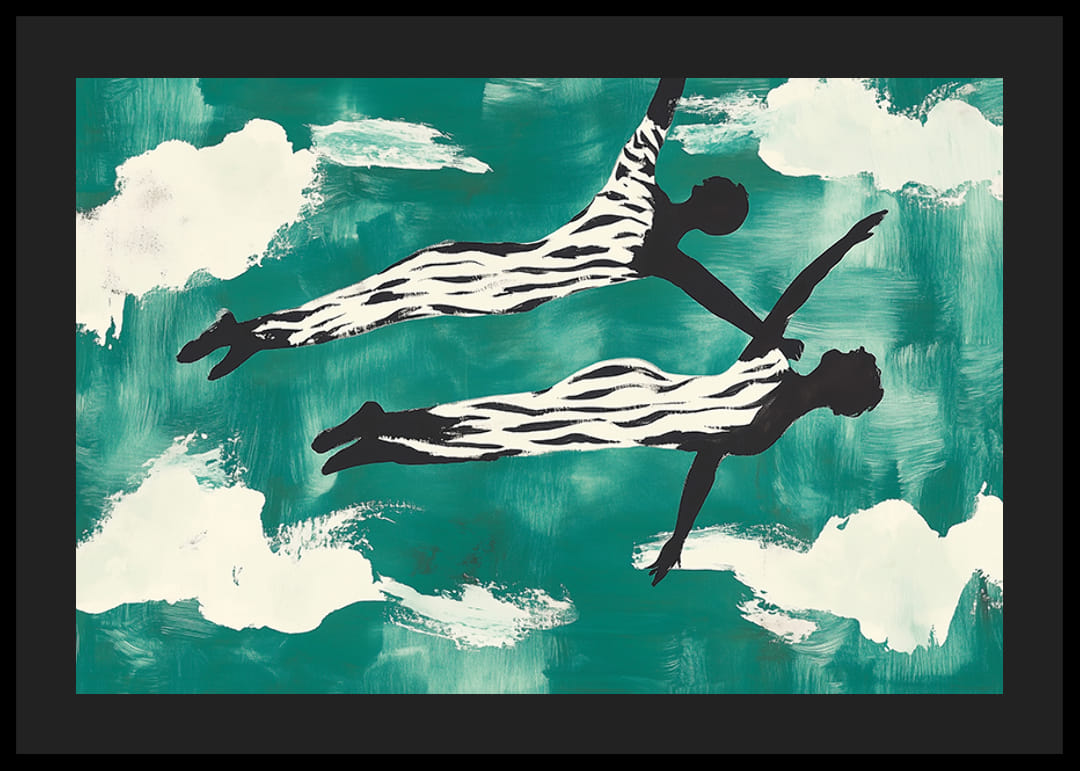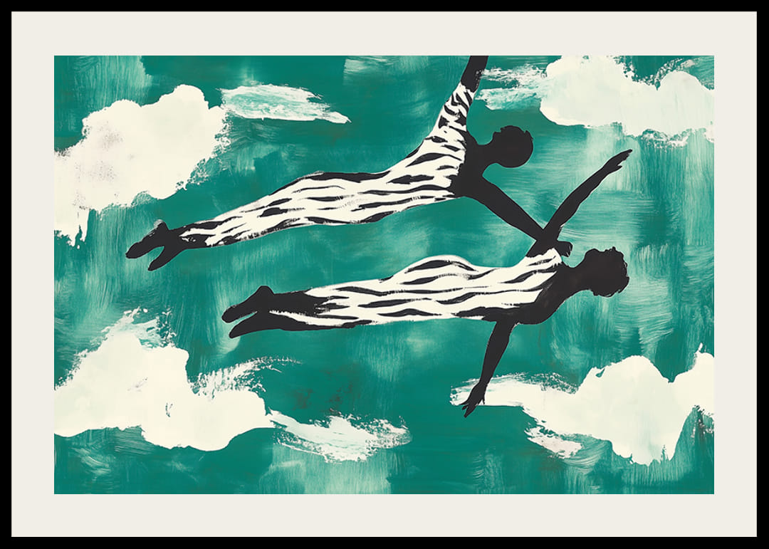 Ez a poszter a szabadság érzését ragadja meg két repülés közbeni sziluettel, mint táncosok a felhőkkel teli égen. A zöld-kék háttér fekete-fehér kontrasztjai hipnotikus hatást keltenek, ami az álmok korlátlan lehetőségeire emlékeztet.