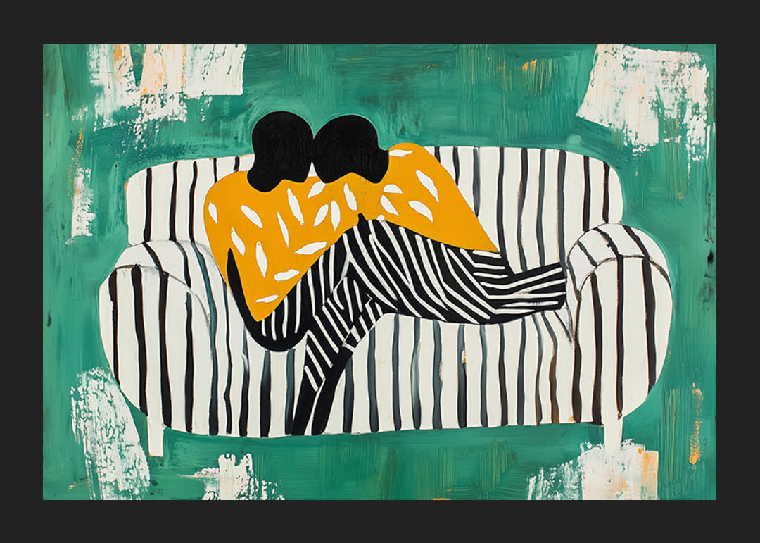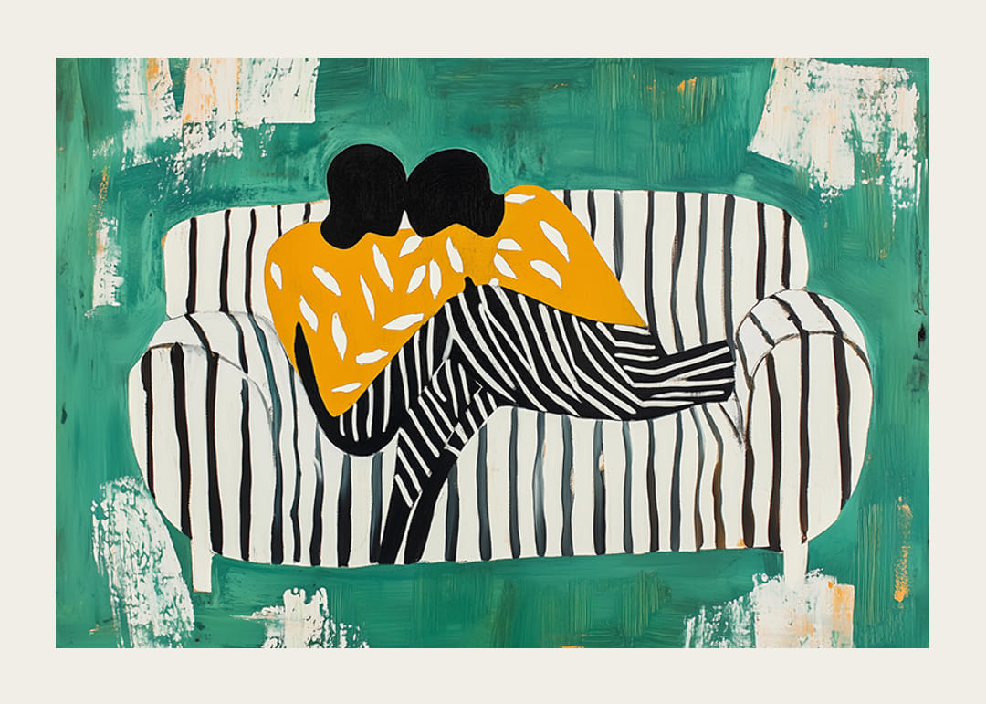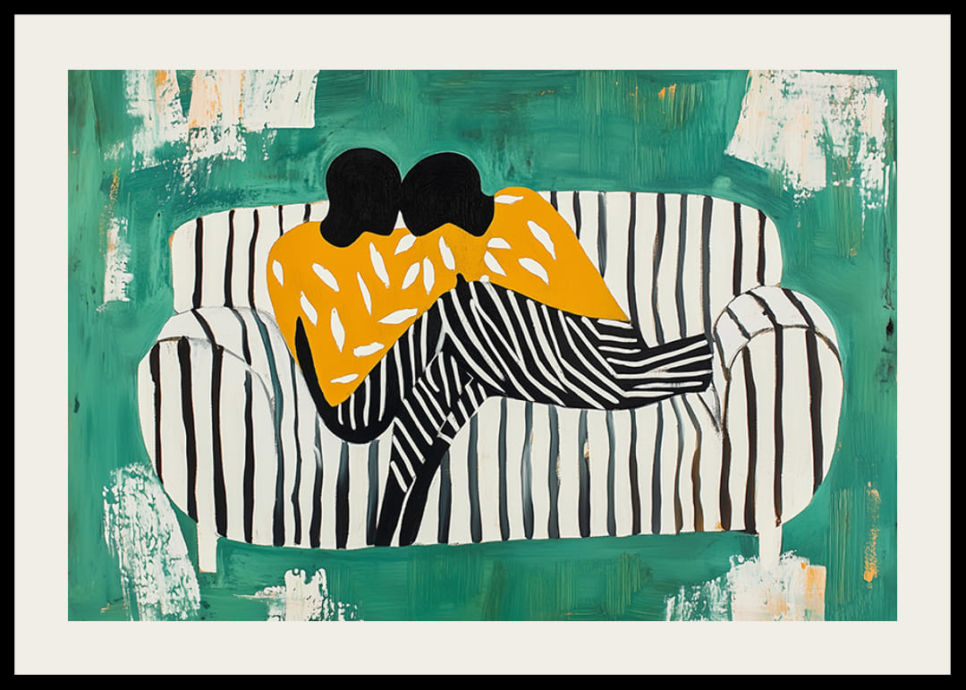 Ez a poszter azonnal megragadja a szemet a zöld háttér, valamint a kanapé és a figurák fekete-fehér csíkos mintájának merész kontrasztjaival. Két figura egymás karjába burkolózva élénk, narancssárga mintás ruhát visel.
