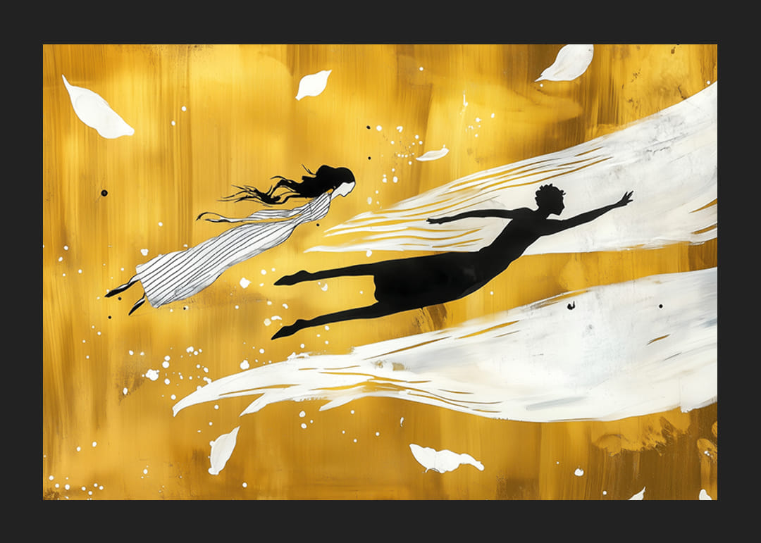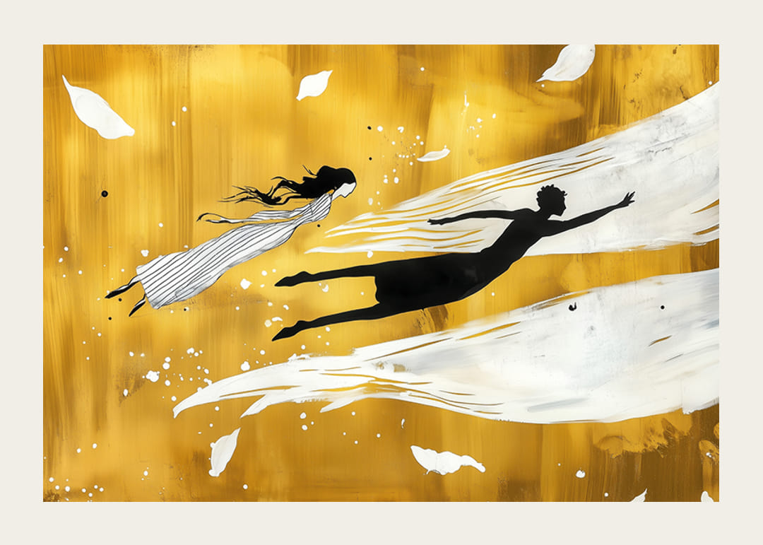 Egy elbűvölő poszter, ahol sziluettek lebegnek az arany háttér előtt, a szabadság és az álmok érzését keltve. A lágy, hullámzó formák a kontrasztos színekkel együtt a mozgás és a nyugalom harmóniájának élményét keltik.