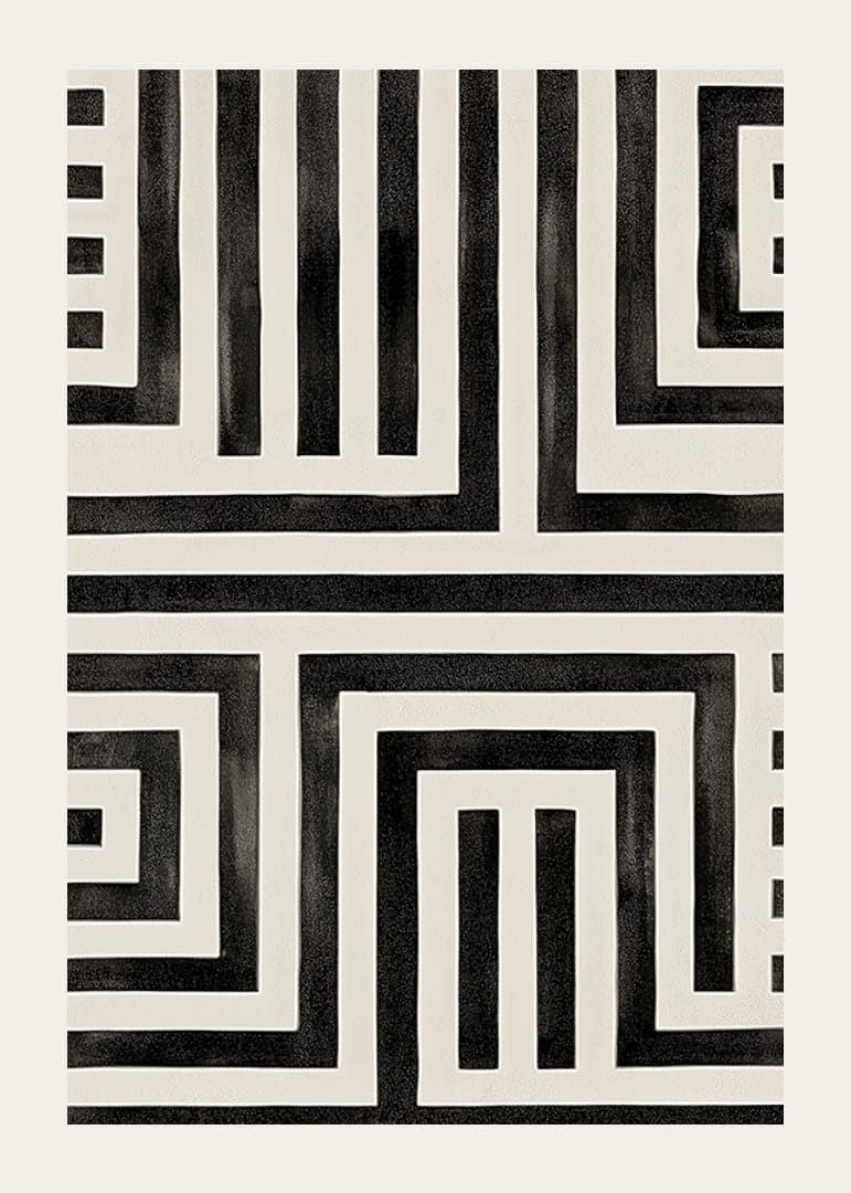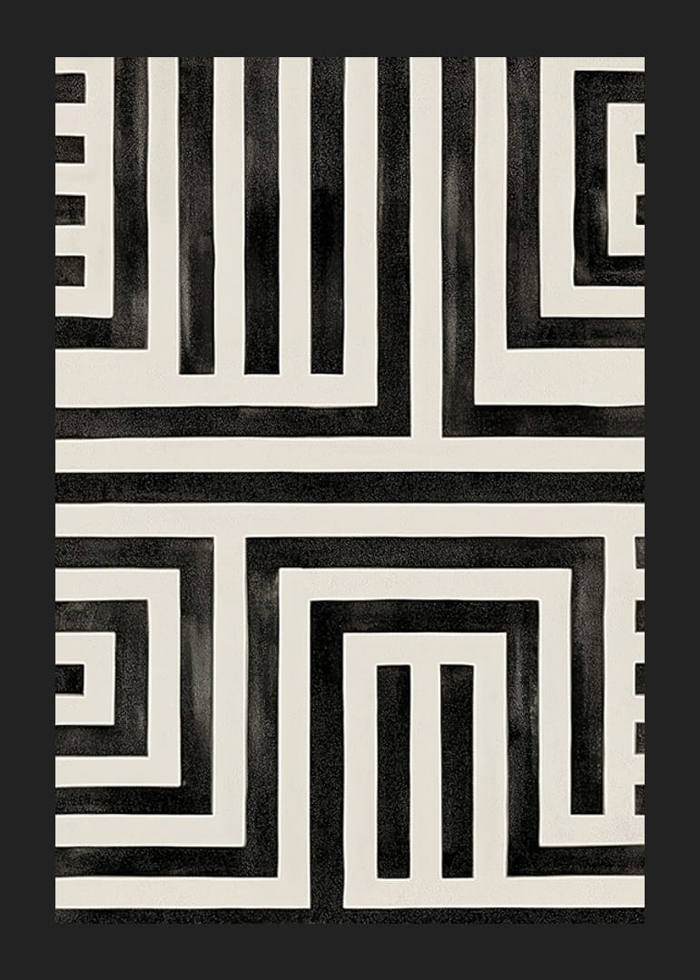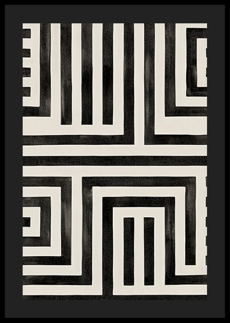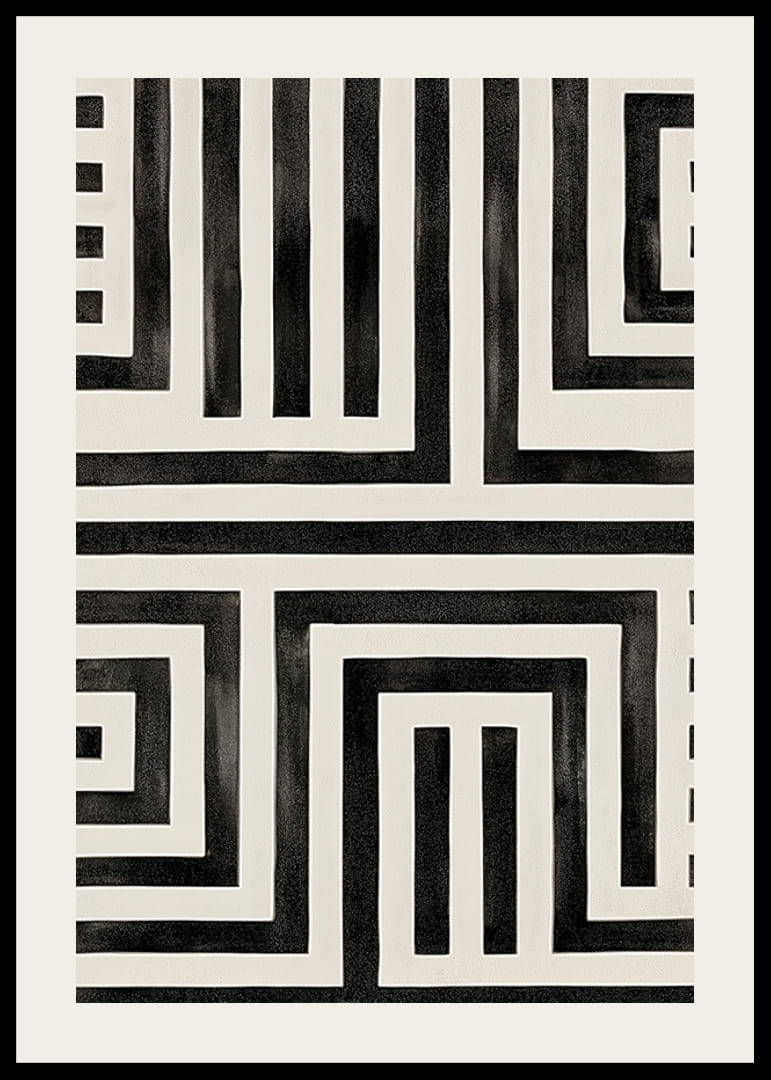 Ez a poszter a fekete-fehér vonalak csodálatos és hipnotikus keverékét kínálja, amely vizuális találkozások labirintusát hozza létre. A minta merész geometriája mélységet és mozgást ad, és minden helyiséget inspiráció és modern stílus hellyé varázsol.