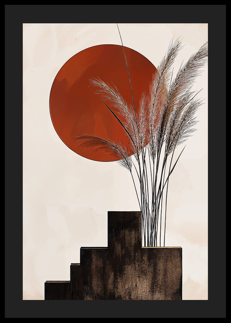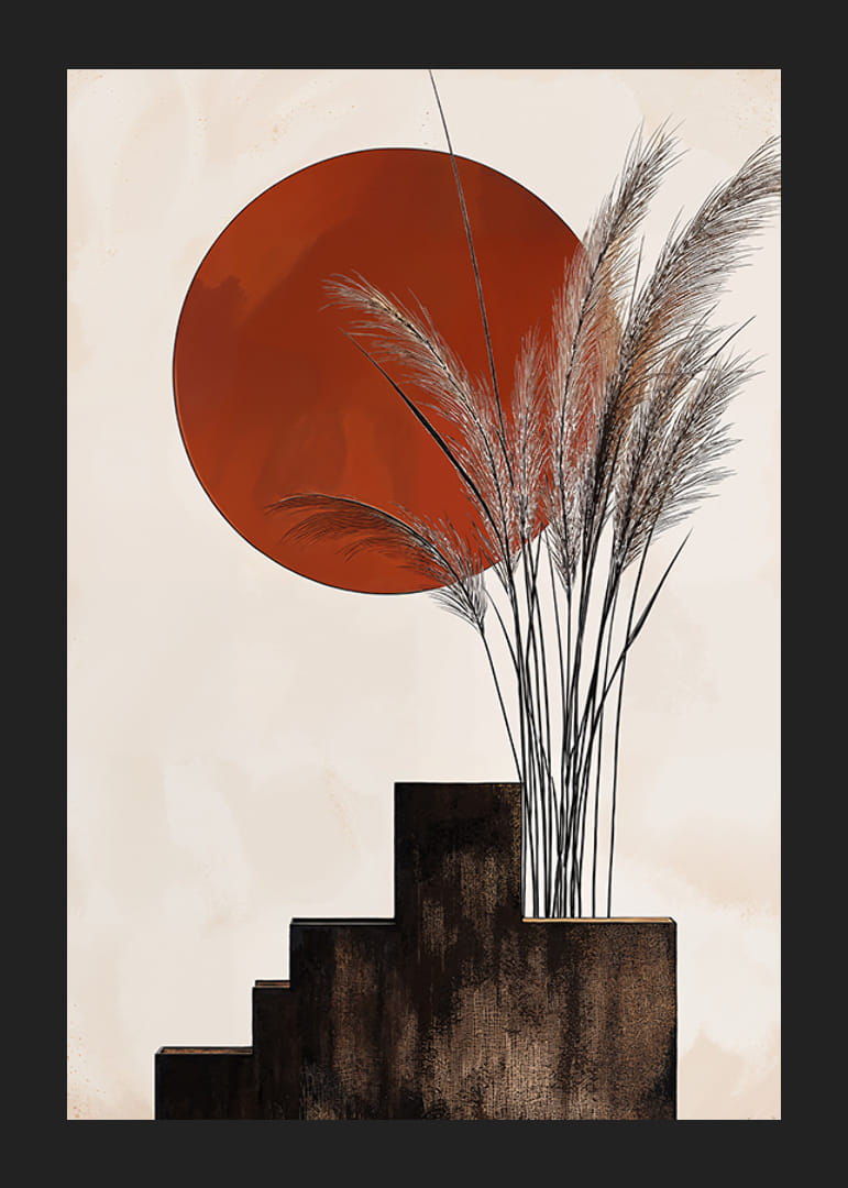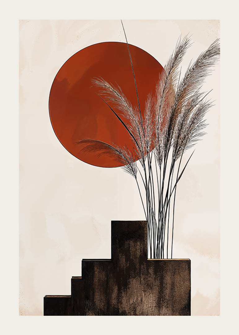 Ez a poszter vizuális szimfóniát kínál, ahol a rusztikus vörös nap egyensúlyoz az égen kecses, lejtős fűszálak fölött. A lágy, organikus vonalak gyönyörű kontrasztot alkotnak az előtérben lévő lépcső szigorú, geometrikus formáival.