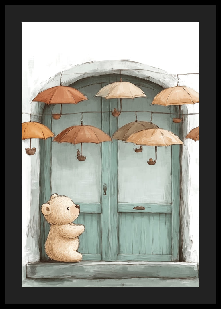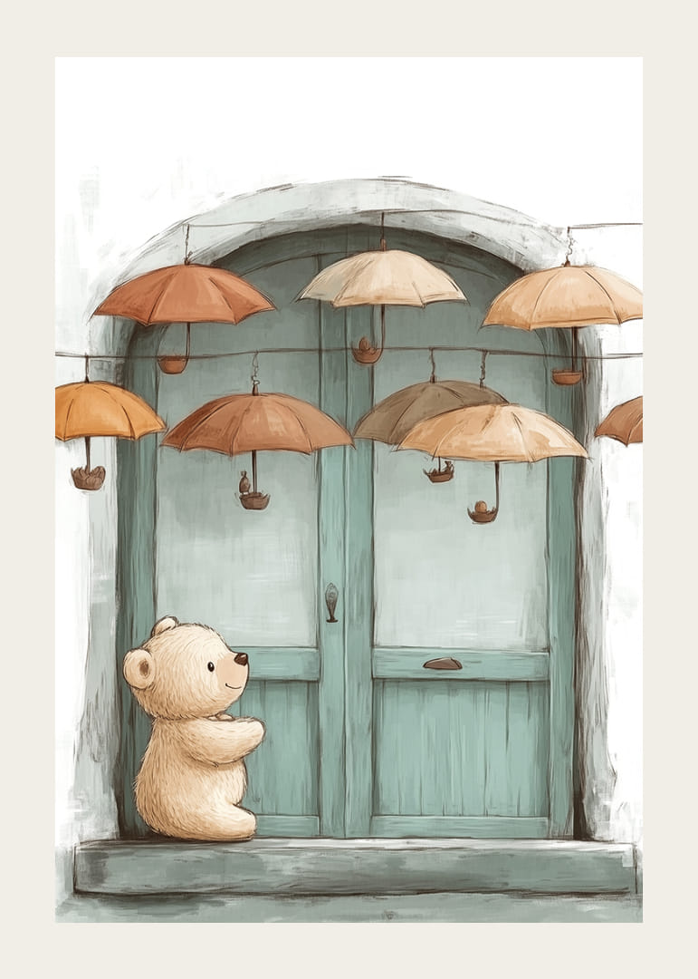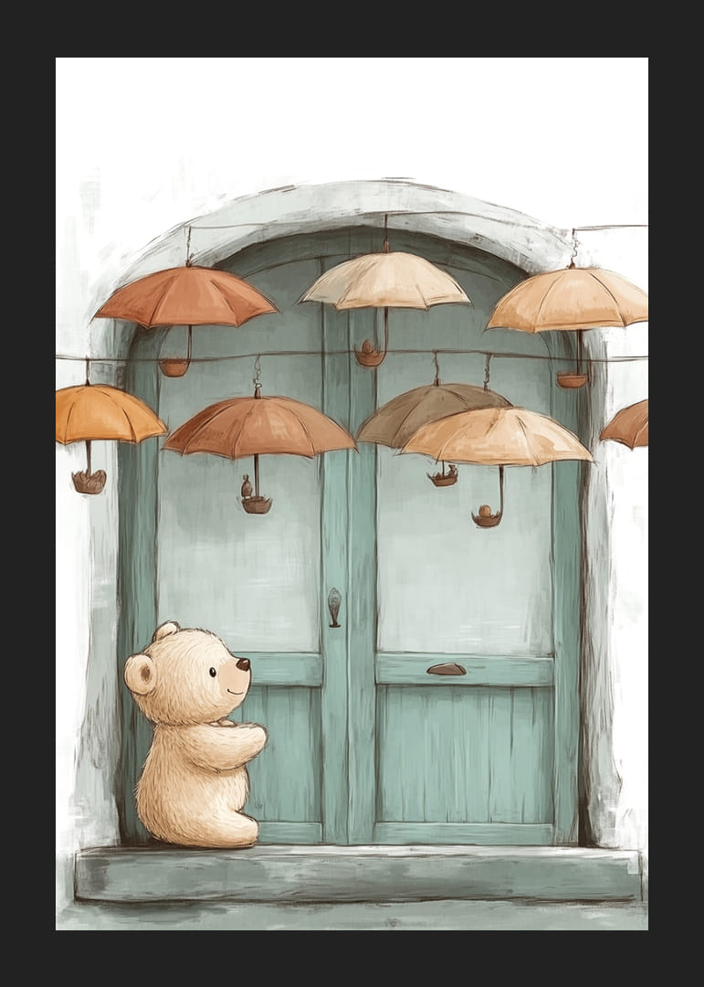Ez a poszter egy aranyos plüssmackó és a lebegő esernyők varázslatos találkozását örökíti meg lágy barna és narancssárga árnyalatokban. Ez az álomszerű jelenet biztonságérzetet és kíváncsiságot áraszt, míg a nyugodt légkör a képzeletet és a játékosságot hívja elő. Stílusos színpalettájával és egyedi motívumával a poszter bármilyen szobát meleg és bájos hellyé varázsol, ideális a meghittség és az inspiráció megteremtéséhez.