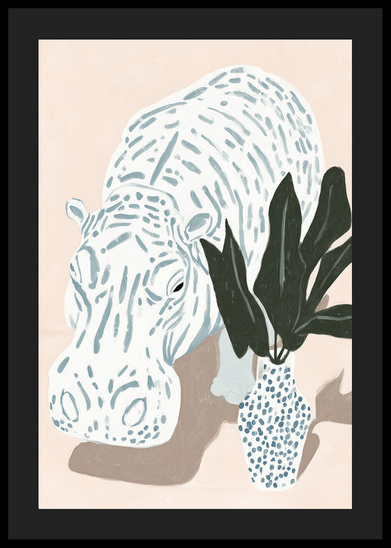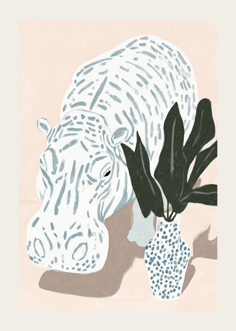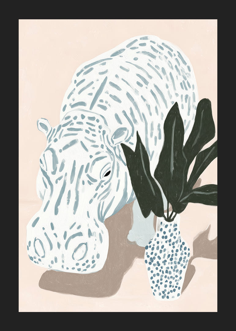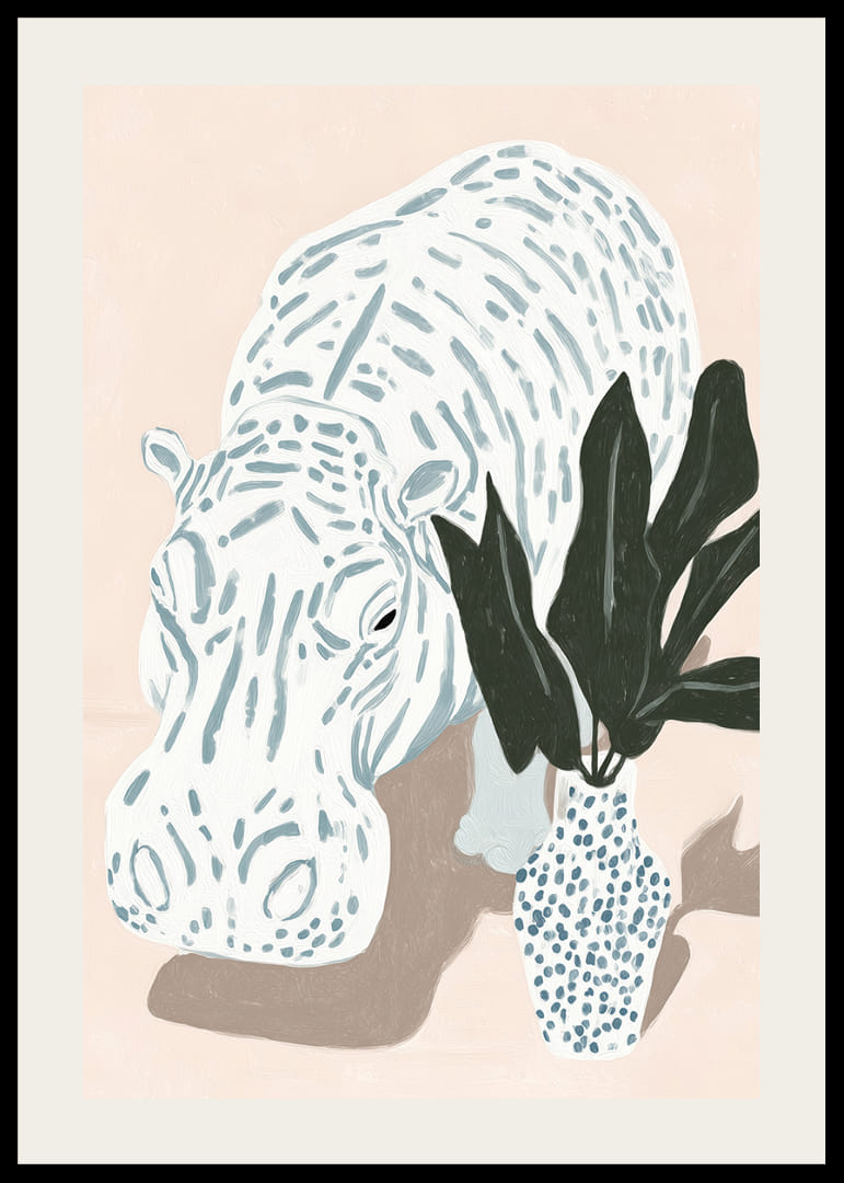 Ez a poszter egy bájos vízilovat ábrázol lágy fehér és szürke árnyalatokban, amelyet egy elegáns, pöttyös tégelyben elhelyezett növénnyel vesz körül. A nyugodt pasztell háttér kiemeli az állat szelíd arckifejezését. A természet és a művészet egyedi kombinációjával ez a poszter békés és stílusos részletté válik, amely bármely szobát a nyugalom és a szépség oázisává varázsol. Finom kifejezéssel díszíti a falakat.