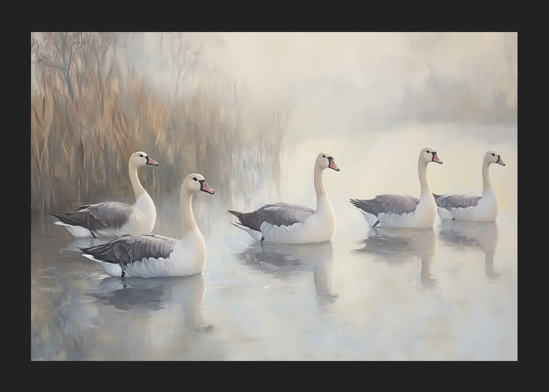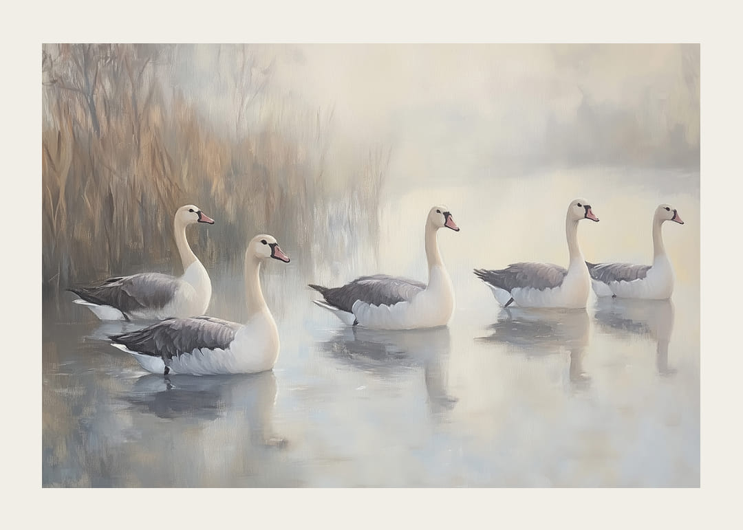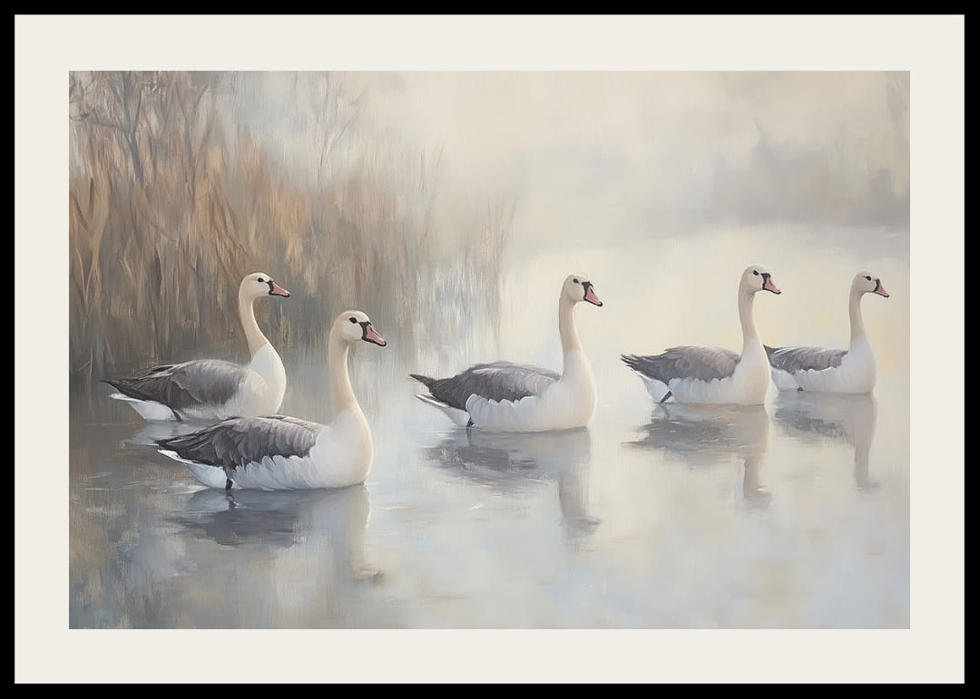 Ezen a poszteren öt fenséges hattyút látunk, amint egy tükörsima tó felett siklanak, lágy köd veszi körül. Az elegáns madarak kecses mozgásukkal békés és harmonikus hangulatot teremtenek. A táj visszafogott színei kiemelik a hattyúk fehér tollazatát, a lágy fény pedig fokozza szépségüket. Ez a poszter a nappalidat a nyugalom és a természetes elegancia oázisává varázsolja.