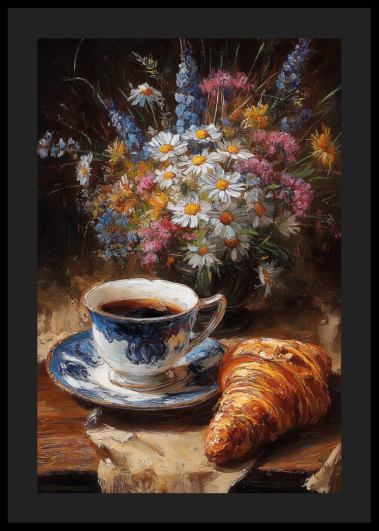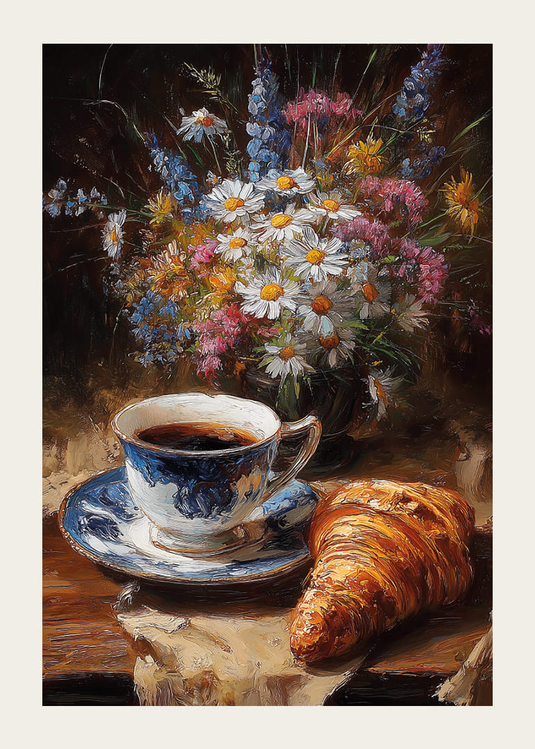 A reggel nyugalmát elegánsan ragadja meg ez a poszter, amely egy klasszikus csésze kávét ábrázol egy tökéletesen sült croissant-nal, színes vadvirágcsokorral keretezve. A porceláncsésze finom kék és fehér mintázata, valamint a virágok élénk színei közötti kontraszt fokozza a képet. Ez a poszter meleg és barátságos hangulatot teremt, amely időtlen bájjal gazdagítja otthonod bármely helyiségét.