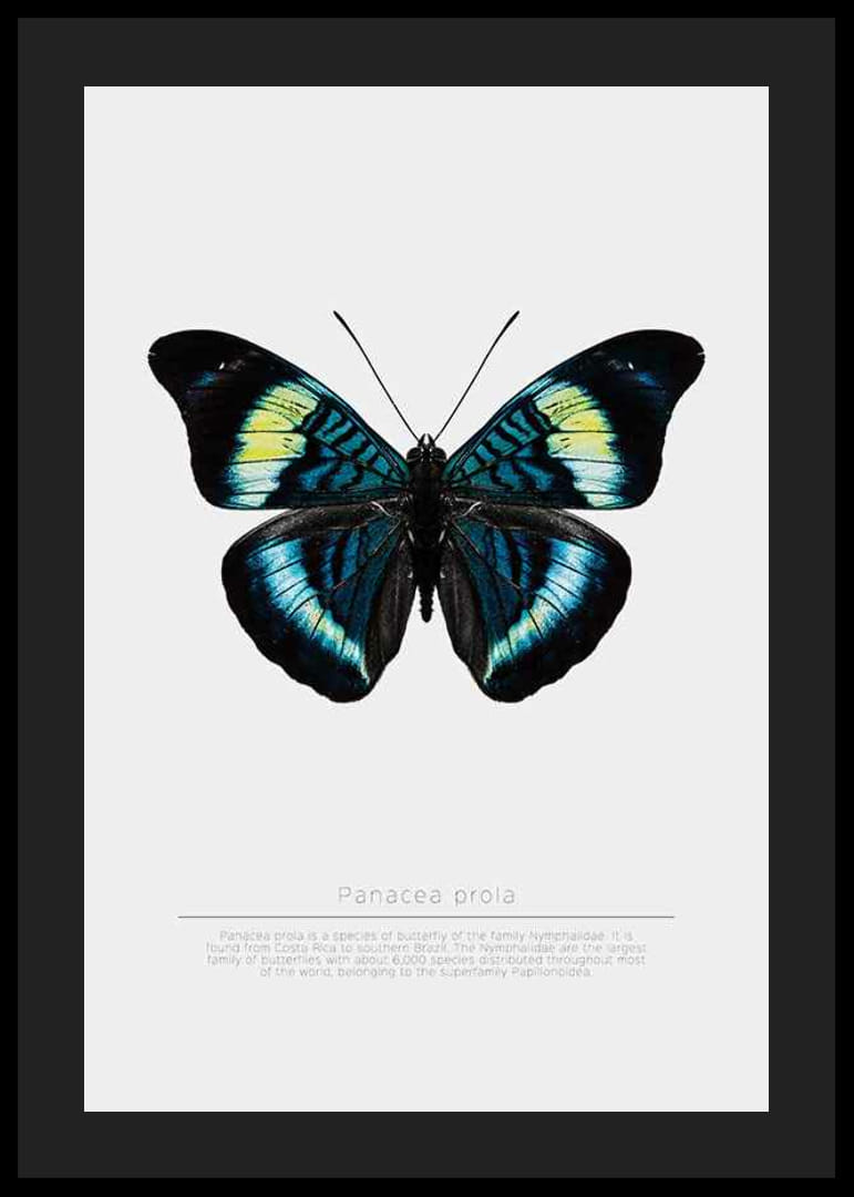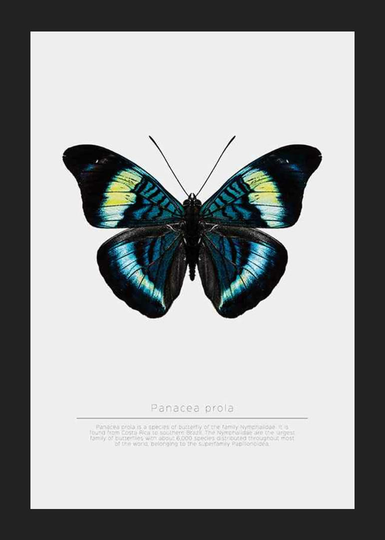 A motívum egy jól láthatóan ábrázolt pillangó, a Panacea prola, szimmetrikus szárnyakkal kék, türkiz és sárga árnyalatokban, teljesen fehér háttér előtt. A pillangó alatt a faj neve és a leíró szöveg diszkrét tipográfiával található. A stílusos és természet ihlette hangulatnak köszönhetően ez a poszter könnyen elhelyezhető például egy nappaliban, dolgozószobában vagy előszobában.