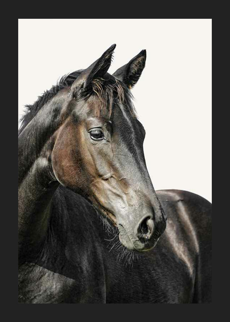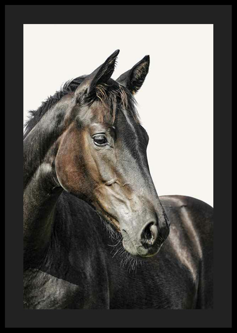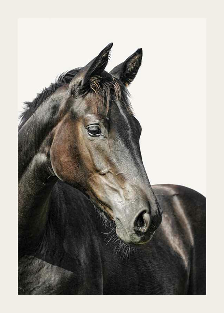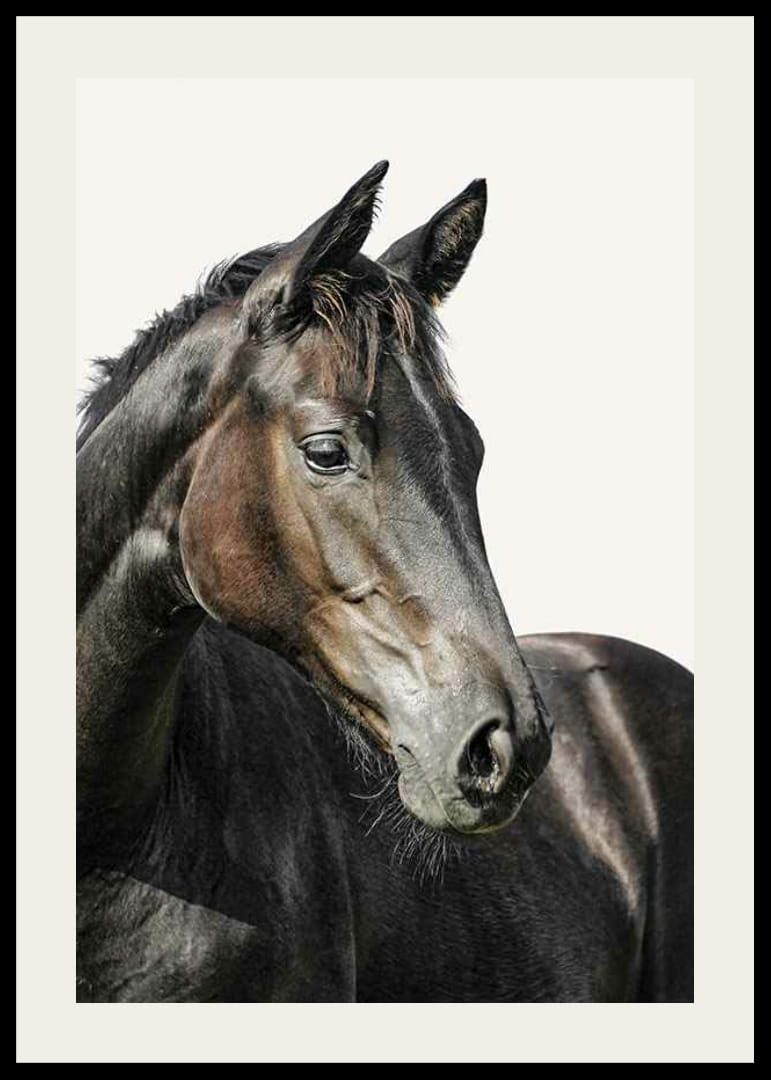 Közeli kép egy barna lóról, jellegzetes arcvonásokkal és fényes szőrzettel. A ló profilból áll világos, semleges háttér előtt, amely kiemeli az állat arckifejezését és részleteit. Ez az időtlen poszter kiemeli a ló erejét és szépségét, és ugyanolyan jól illik a nappalikba, mint az állatos vagy természeti témájú irodákba.