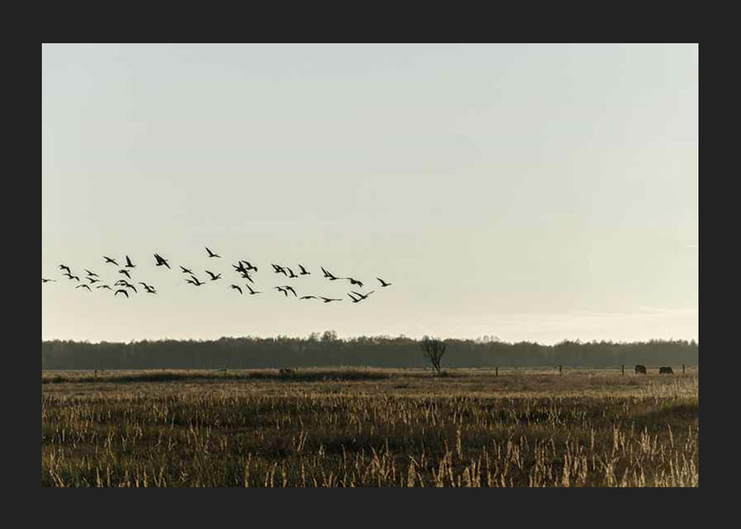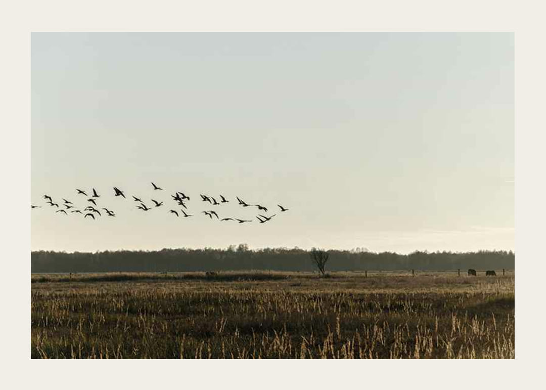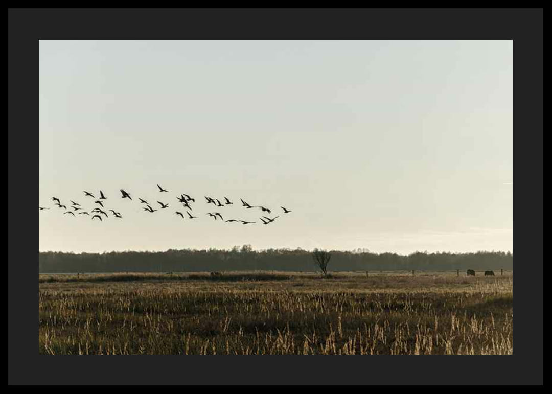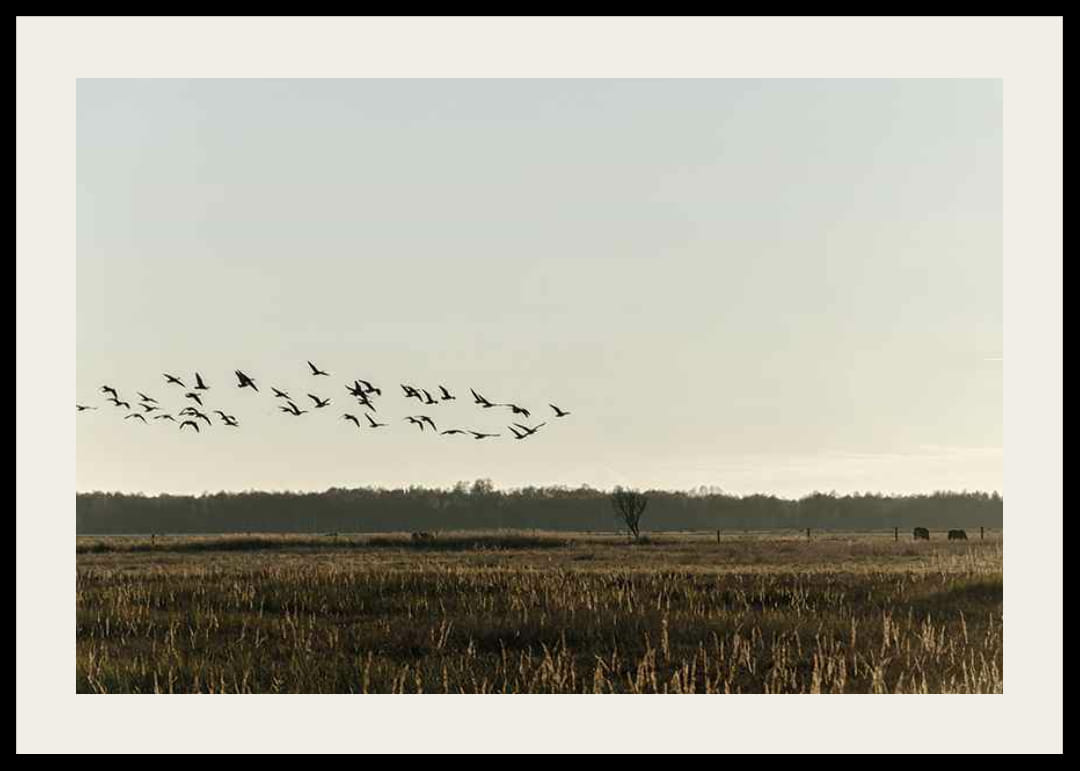 Egy madárraj sziluettje látszik, amint alacsonyan repülnek egy magas fűvel borított, aranyló, nyílt mező felett. A háttérben az erdő széle, egy magányos fa és néhány legelésző állat látható a lágy, őszi árnyalatú ég alatt. Ez a poszter természetes hangulatot kölcsönöz, és jól illik olyan helyiségekbe, ahol a nyugalom és a tér fontos.