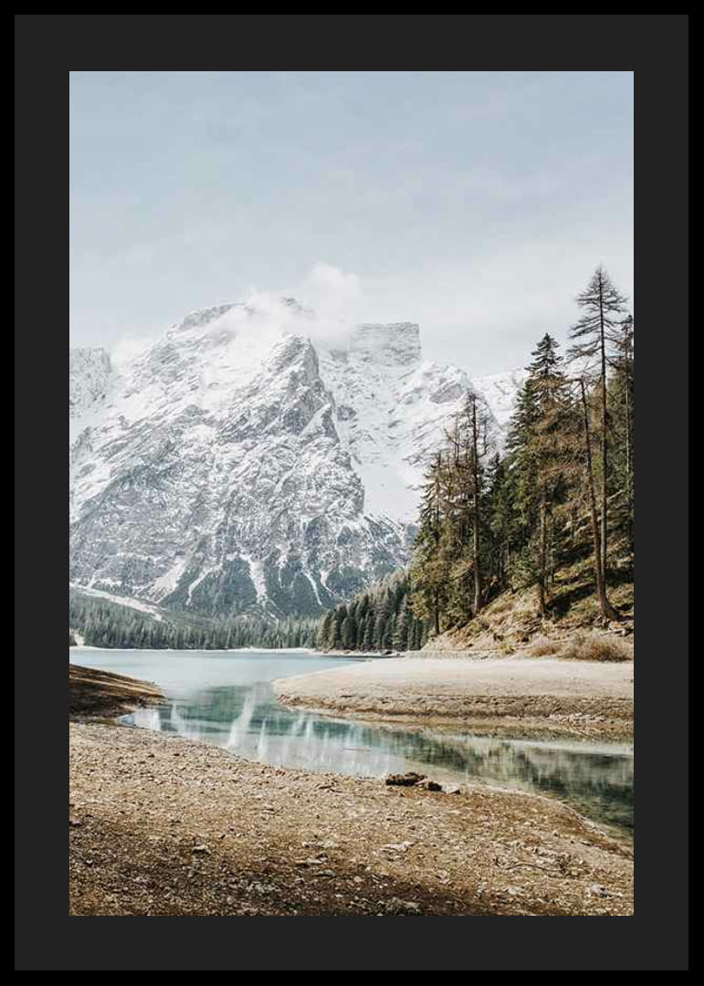Hófödte alpesi csúcsok magasodnak drámaian a háttérben, előtérben egy kristálytiszta kék tó kanyarog. A vízvonalat fenyvesek szegélyezik, kontrasztot alkotva a fehér hegyekkel. A természetes földszínek és a lágy nappali fény időtlen hangulatot kölcsönöznek ennek a poszternek, különösen szép egy nappaliban vagy dolgozószobában.