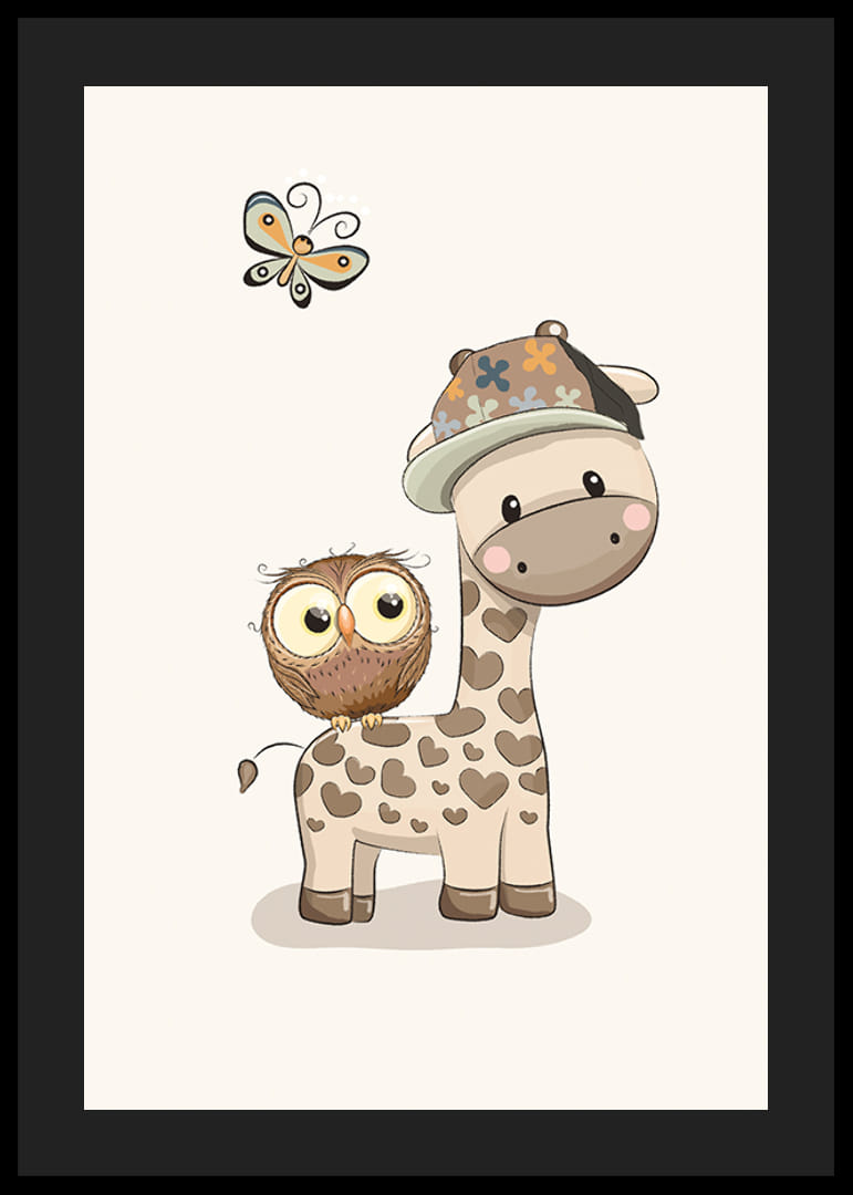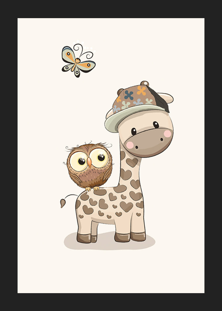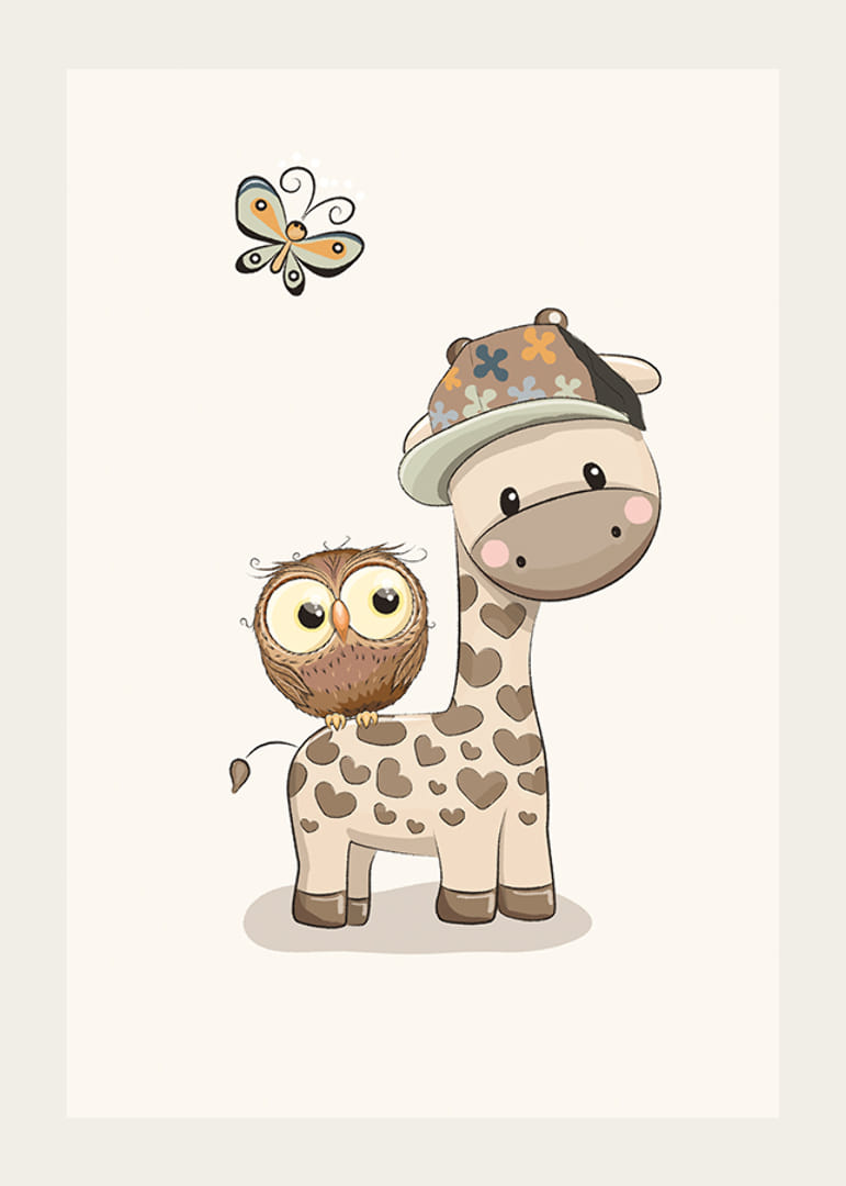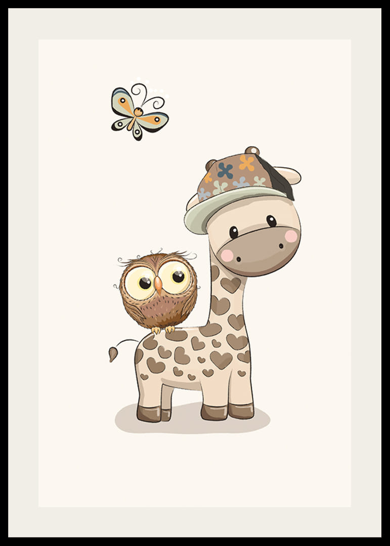 A poszter motívuma egy stilizált, szív alakú pöttyös és sapkás zsiráf, amely mellett egy kis bagoly ül. Felettük egy pillangó lebeg, mindezt visszafogott, lágy színekkel, világos háttér előtt. Ez a poszter jól illik a gyerekszobákba, ahol a játékos és barátságos állatmotívumok nagyra értékelik.