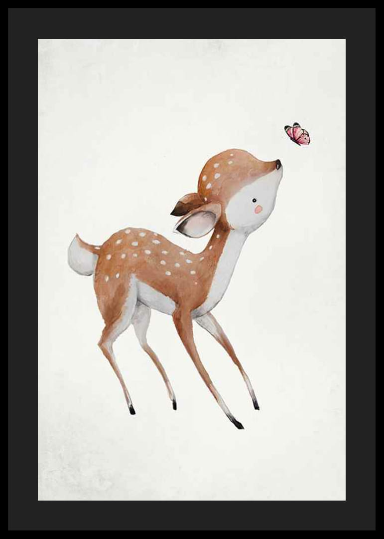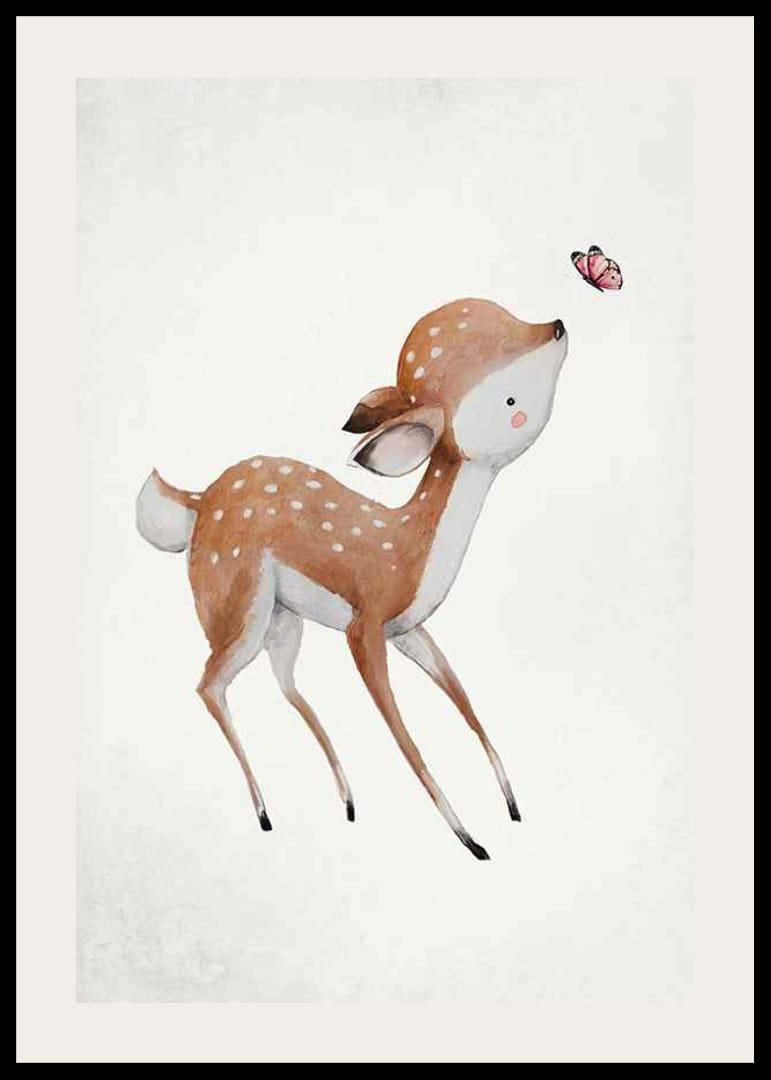 A poszter motívuma egy kis szarvas, amely egy rózsaszín pillangó után nyúl világos, enyhén texturált háttér előtt. A szőrzet lágy barna és fehér árnyalatai, valamint a szarvas kifejező szeme barátságos benyomást kelt. Ez a poszter játékos hangulatot kölcsönöz, és tökéletes egy gyerekszobába.