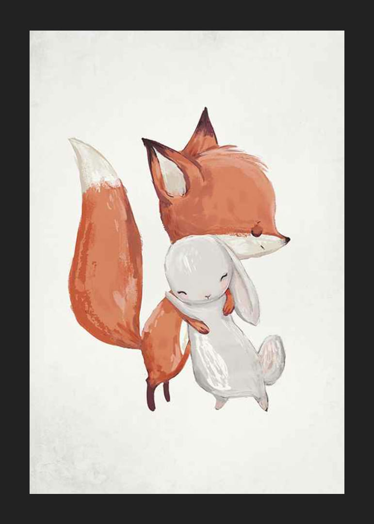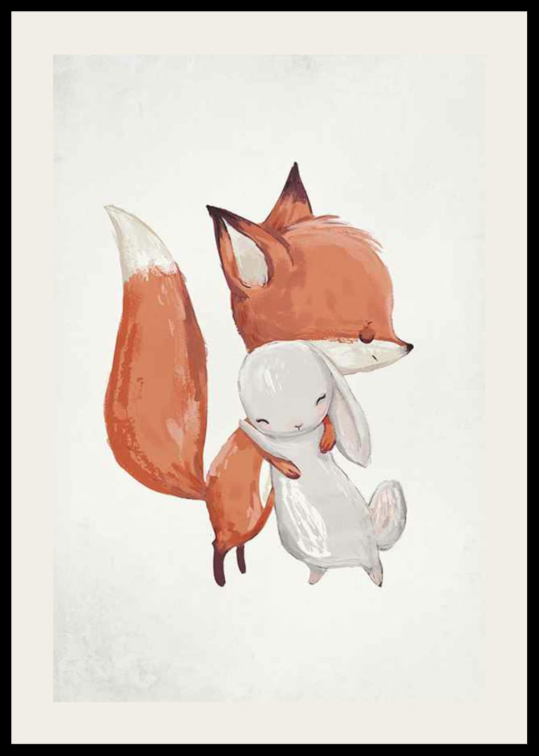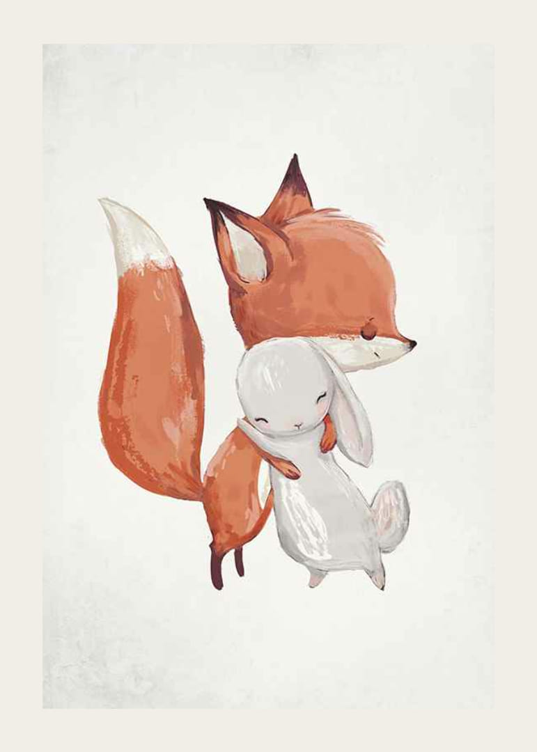 A motívum egy vörösesbarna róka és egy világosszürke nyúl, akik csukott szemmel ölelik egymást, lágy akvarell stílusban festve. A lágy színátmenetek és a világos háttér kellemes és barátságos kifejezést kölcsönöznek. Egy poszter, amely meleg és játékos érintéssel emeli a gyerekszoba hangulatát.