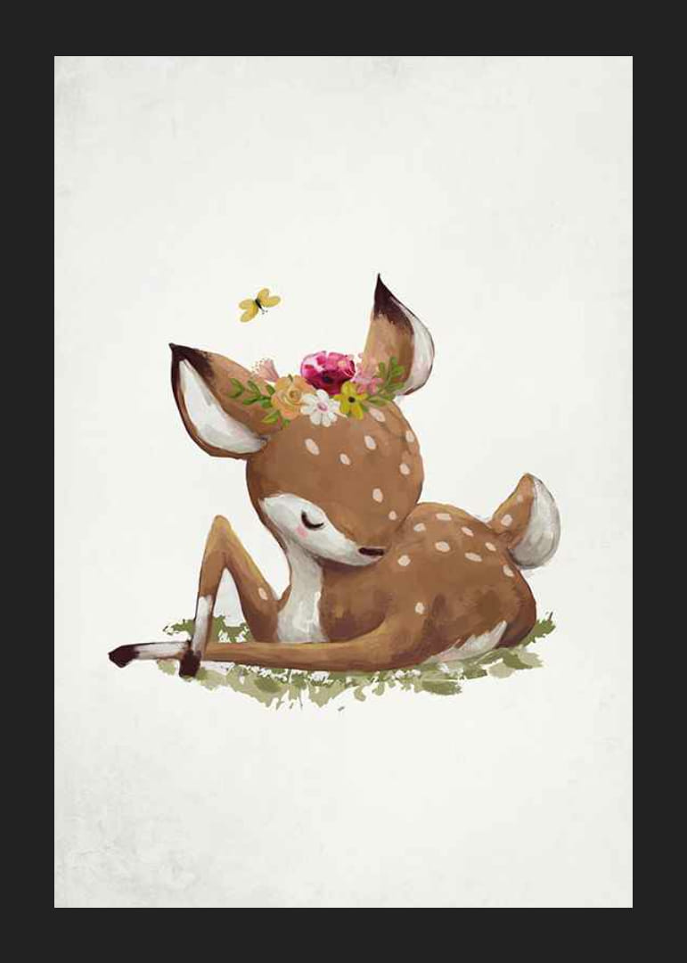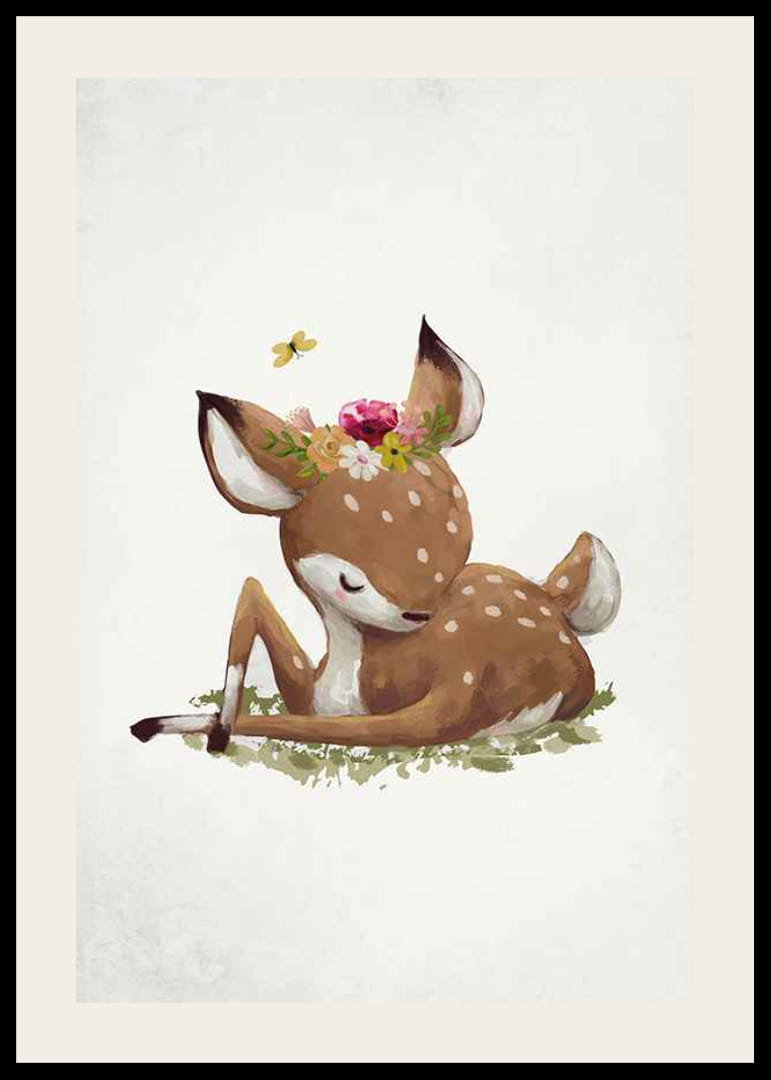 Egy pihenő, fehér foltos, csukott szemű szarvasborjút lágy akvarellszínekkel ábrázoltak. A fején egy színes virágkoszorú látható, mellette pedig egy sárga pillangó repül. A világos, strukturált háttér nyugodt érzetet kelt. Ez a poszter különösen alkalmas gyerekszobákba, és játékos, meleg hangulatot teremt.