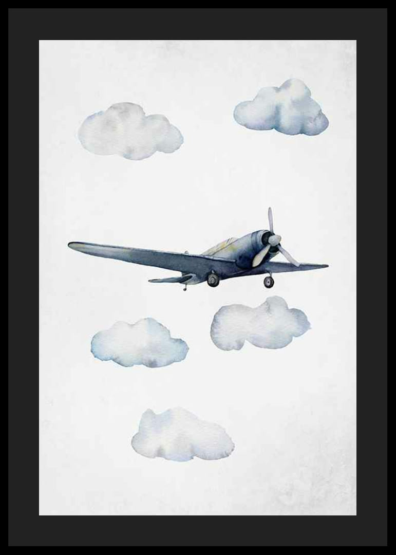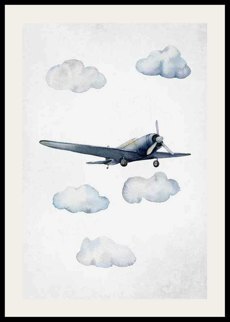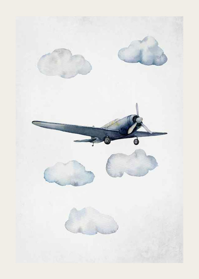 Egy akvarell technikával készült kék propelleres repülőgépet lágy felhők vesznek körül, különböző kék és szürke árnyalatokban, világos, enyhén texturált háttér előtt. A motívum egyszerű formákkal és lágy színárnyalatokkal rendelkezik, így ez a poszter nyugodt és barátságos elem lehet egy gyerekszobában vagy más kreatív környezetben.