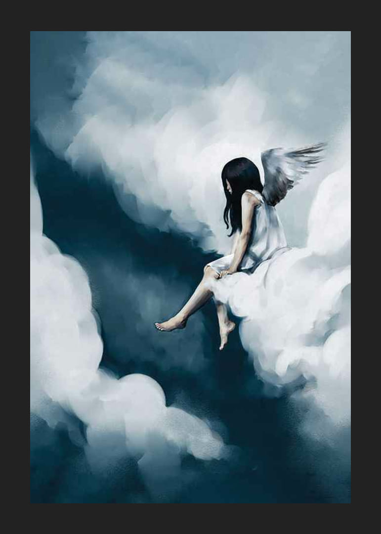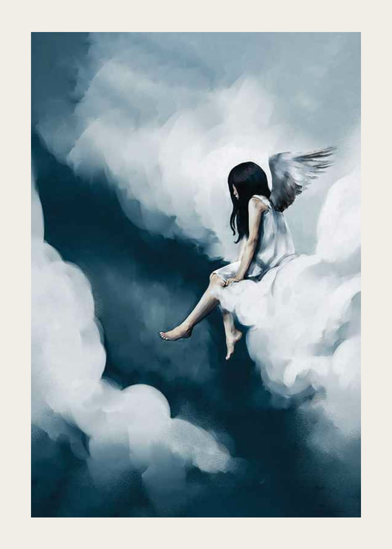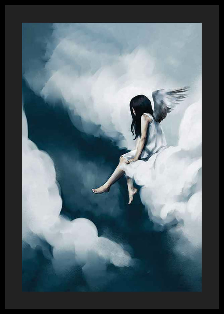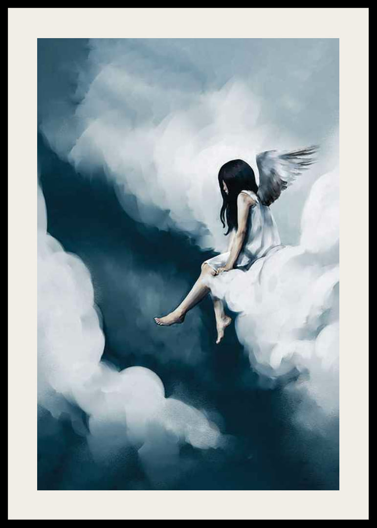 Egy sötét hajú, fehér angyalszárnyú lány egyedül ül egy felhőn, kék és fehér árnyalatú, lágy, lebegő formák veszik körül. A festmény álomszerű és légies hangulatú, ahol az ég és a felhők kontrasztja tisztán kirajzolódik. A motívum alkalmas gyerekszobákba, és a poszteren keresztül költői hangulatot kölcsönöz a szobának.
