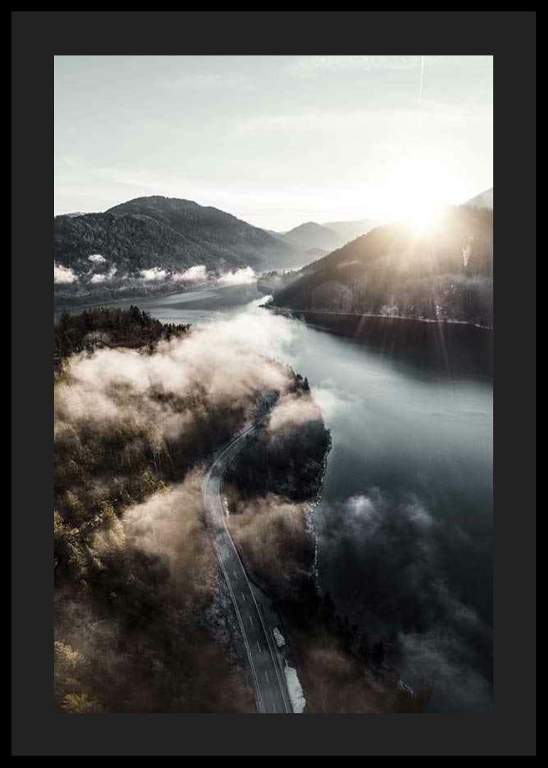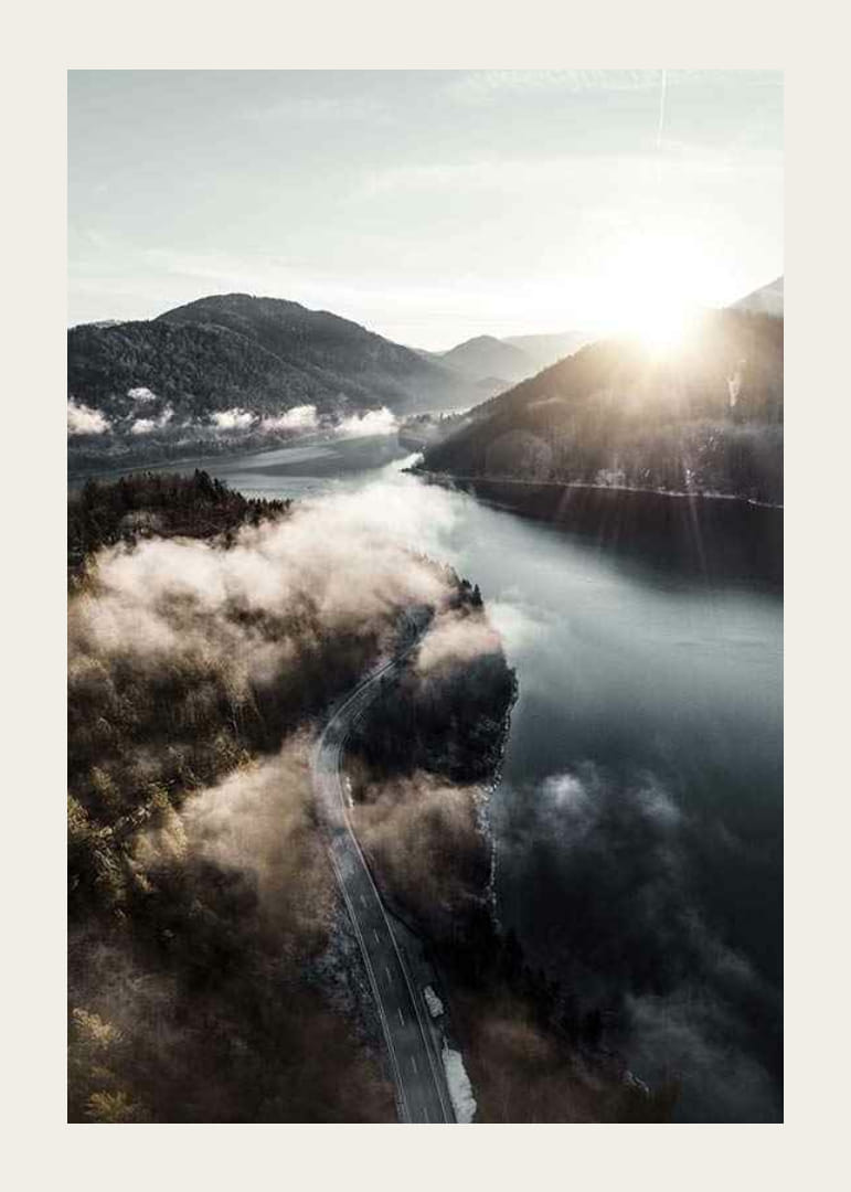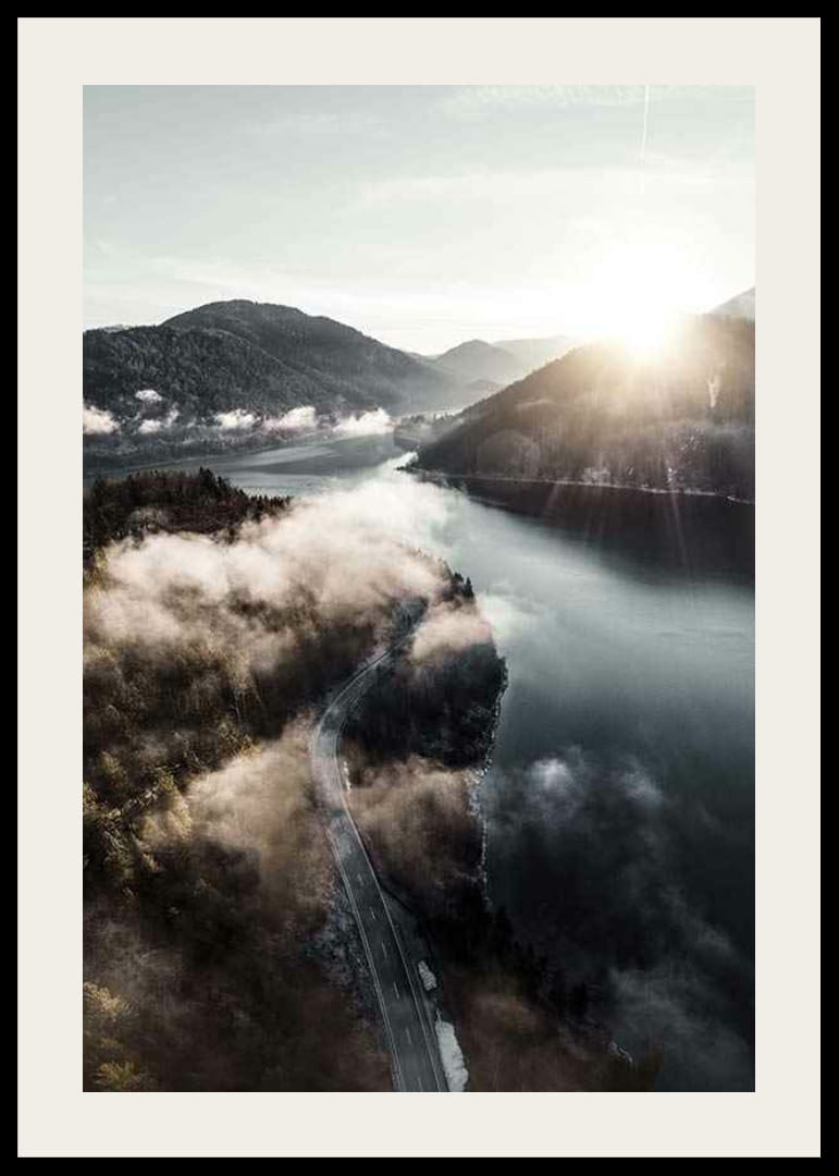 Tájkép egy kanyargós úttal egy nyugodt tó mentén, erdős hegyek ölelésében, vékony felhőfátyol alatt. A nap a horizonton emelkedik, és lágy fényt vet a víz felszínére. A természetes tónusok és a békés hangulat teszi ezt a posztert megfelelő elemmé egy nappaliban vagy dolgozószobában, ahol természetes hangulatra vágyunk.