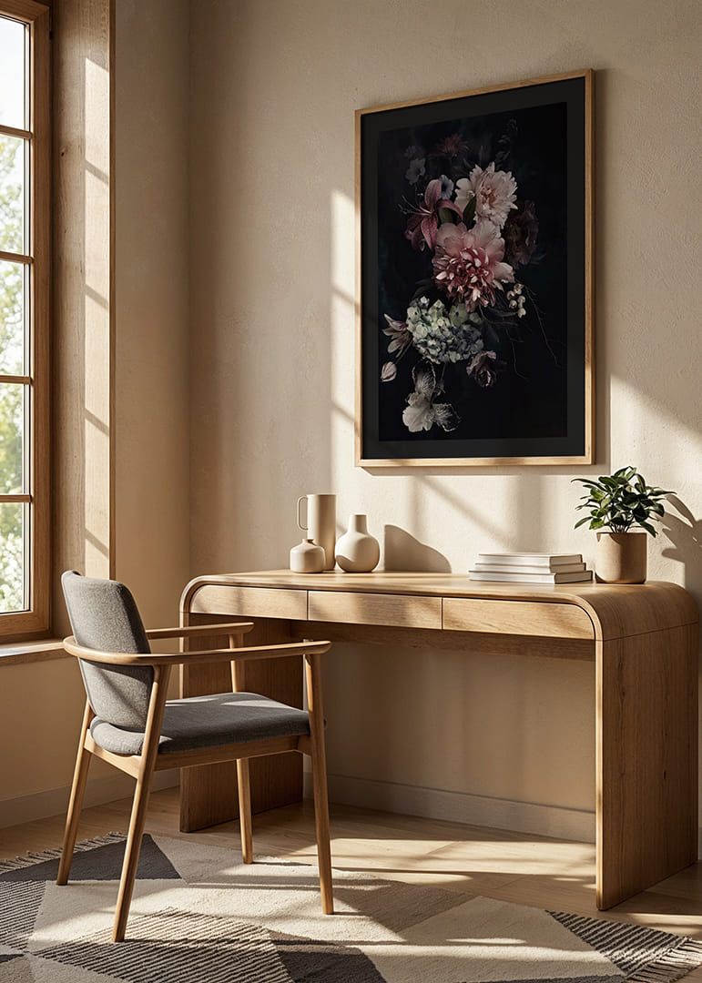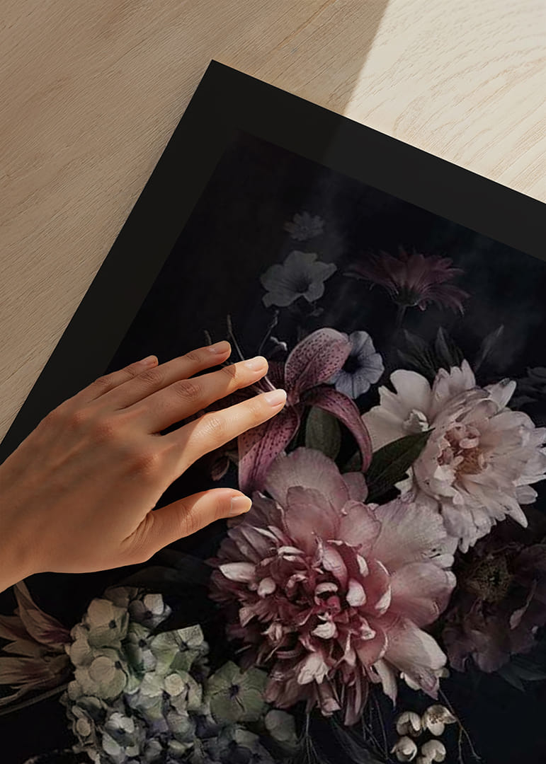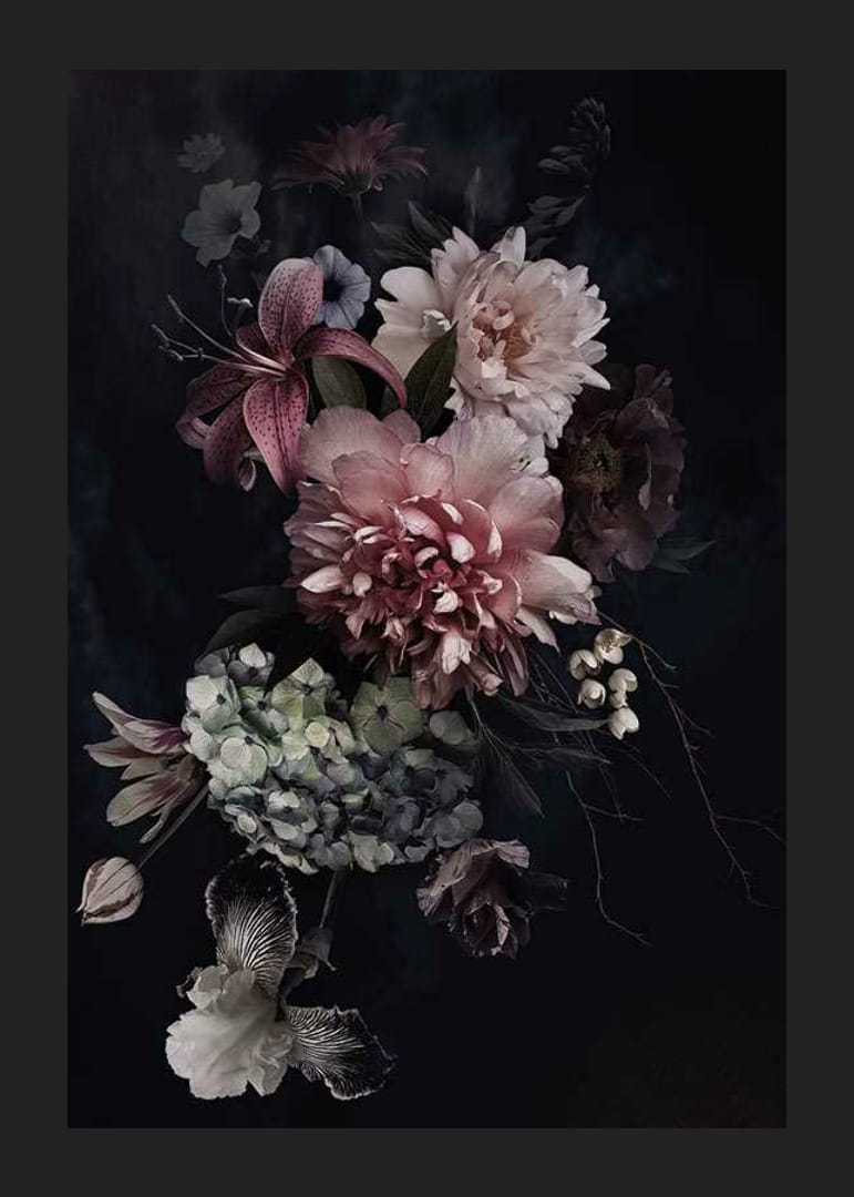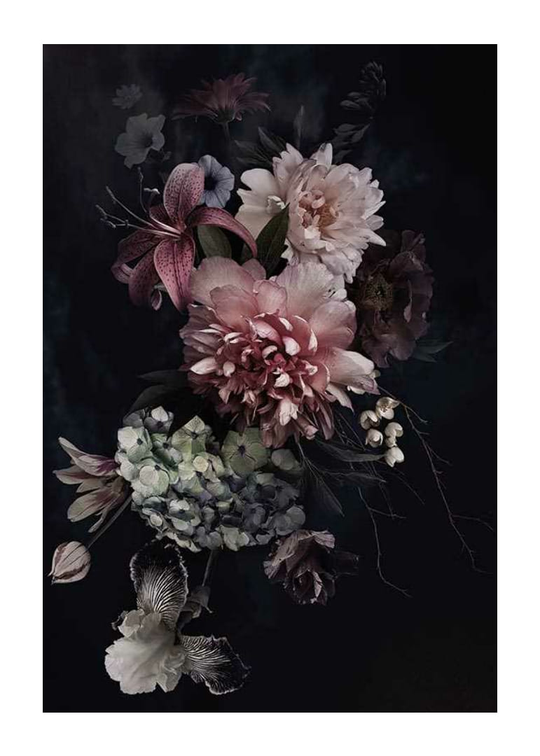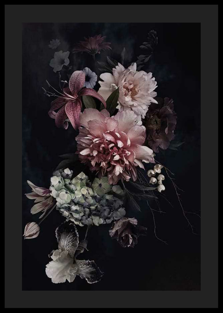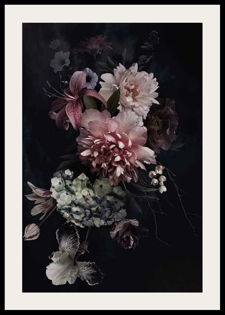 Nagy pünkösdi rózsák, liliomok és hortenziák rózsaszín, fehér és lila színben drámai virágkompozíciót alkotnak egyszínű fekete háttér előtt. A tompa színek és a fókuszált fény klasszikus és időtlen hangulatot kölcsönöz a poszternek. Nappaliba vagy előszobába illik, stílusos botanikai hatást keltve.