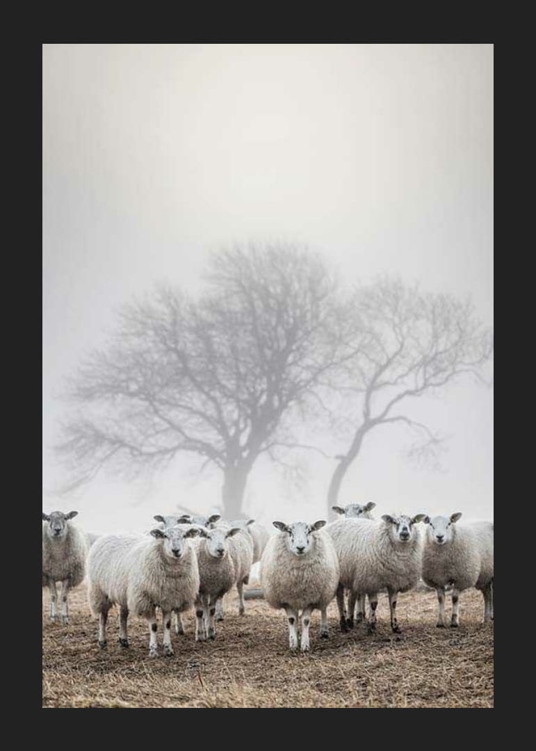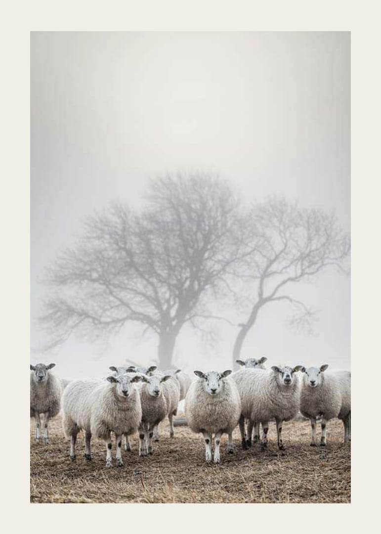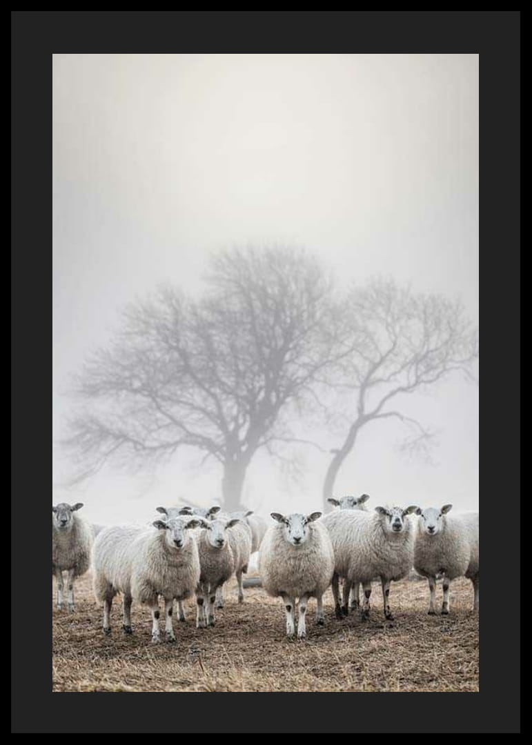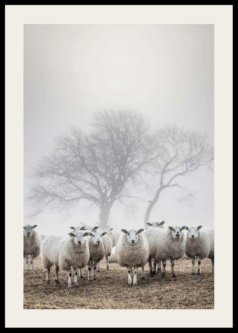 Egy csapat fehér birka áll együtt egy barna mezőn, miközben sűrű köd borítja a tájat. Az állatok mögött csupasz fák sziluettje látszik, amint elhalványulnak a lágy fényben. A természet motívum földszínű sémája és nyugodt kompozíciója stílusos és békés kiegészítője lehet a poszternek a nappaliban, a folyosón vagy a hálószobában.