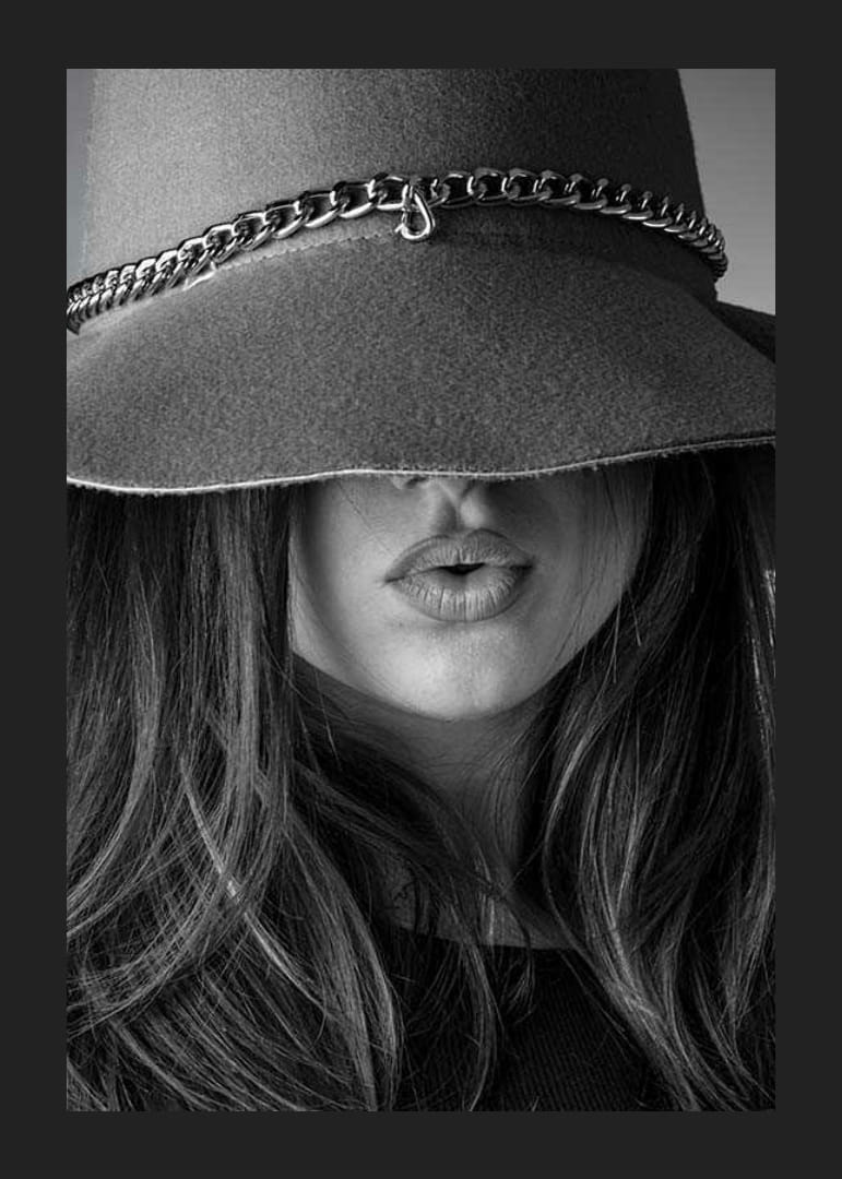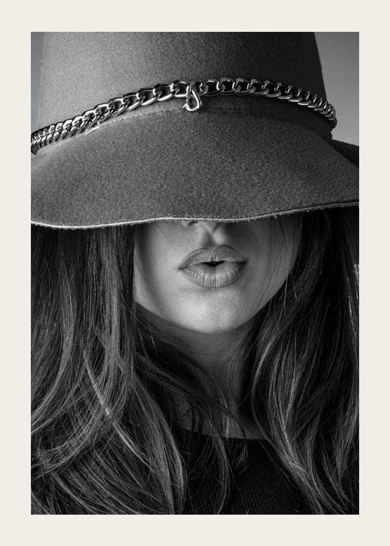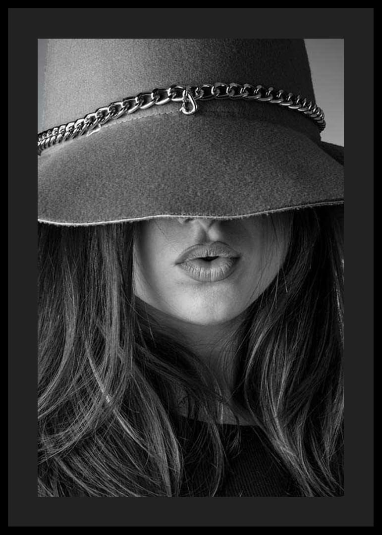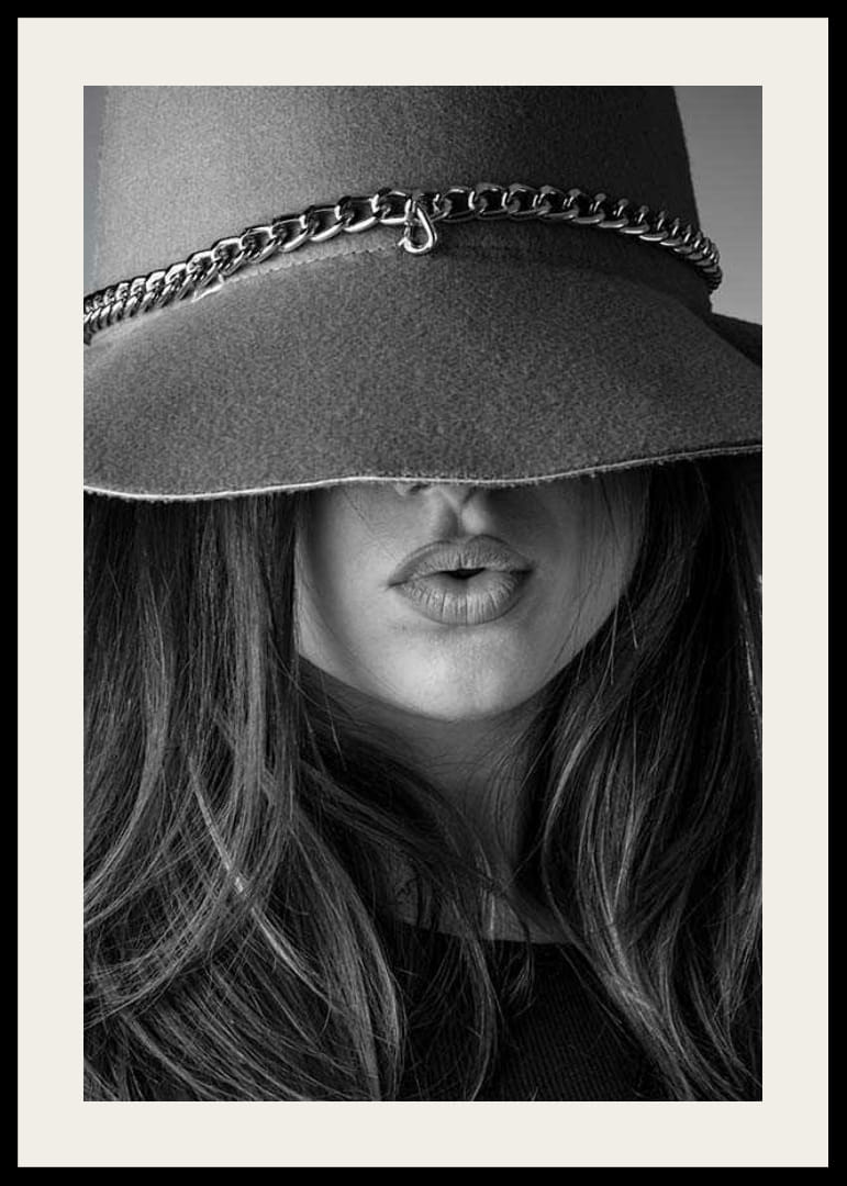 Egy hosszú hajú, telt ajkú fiatal nő közeli képe, akit részben egy nagy, láncdíszes filckalap takar. Tekintetét a kalap eltakarja, ami stílusos és grafikus hatást kelt. A fekete-fehér kompozíció modern hangulatot kölcsönöz a poszternek, és divatos környezetbe illik.