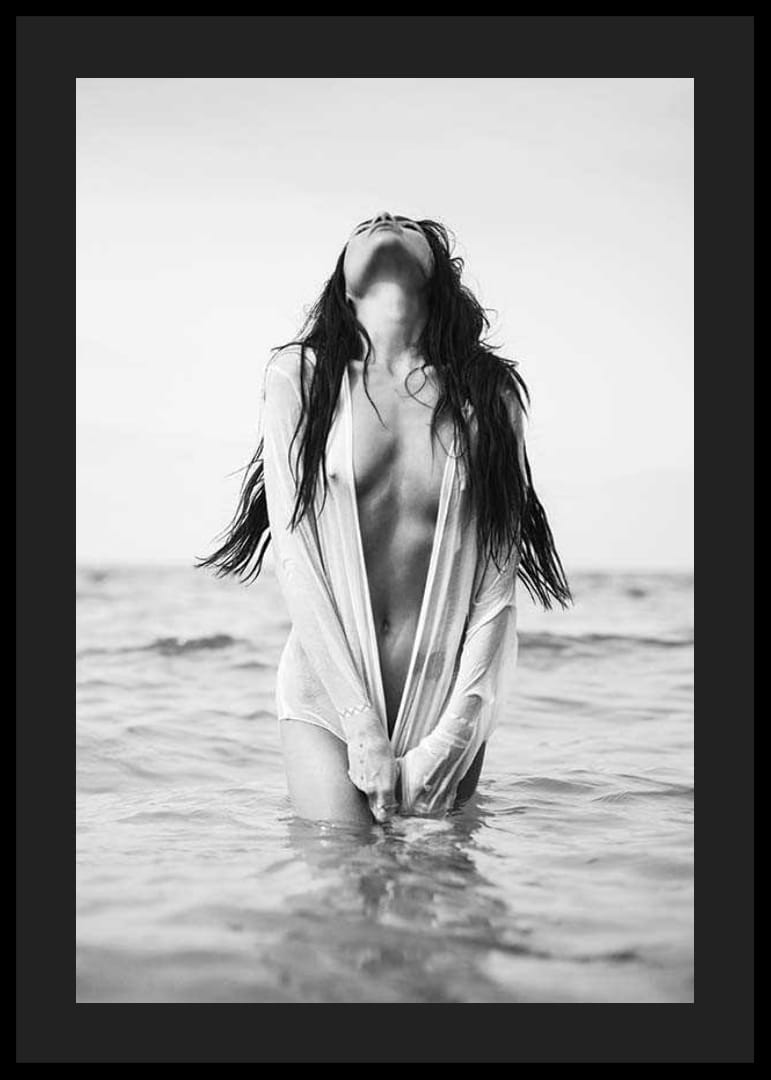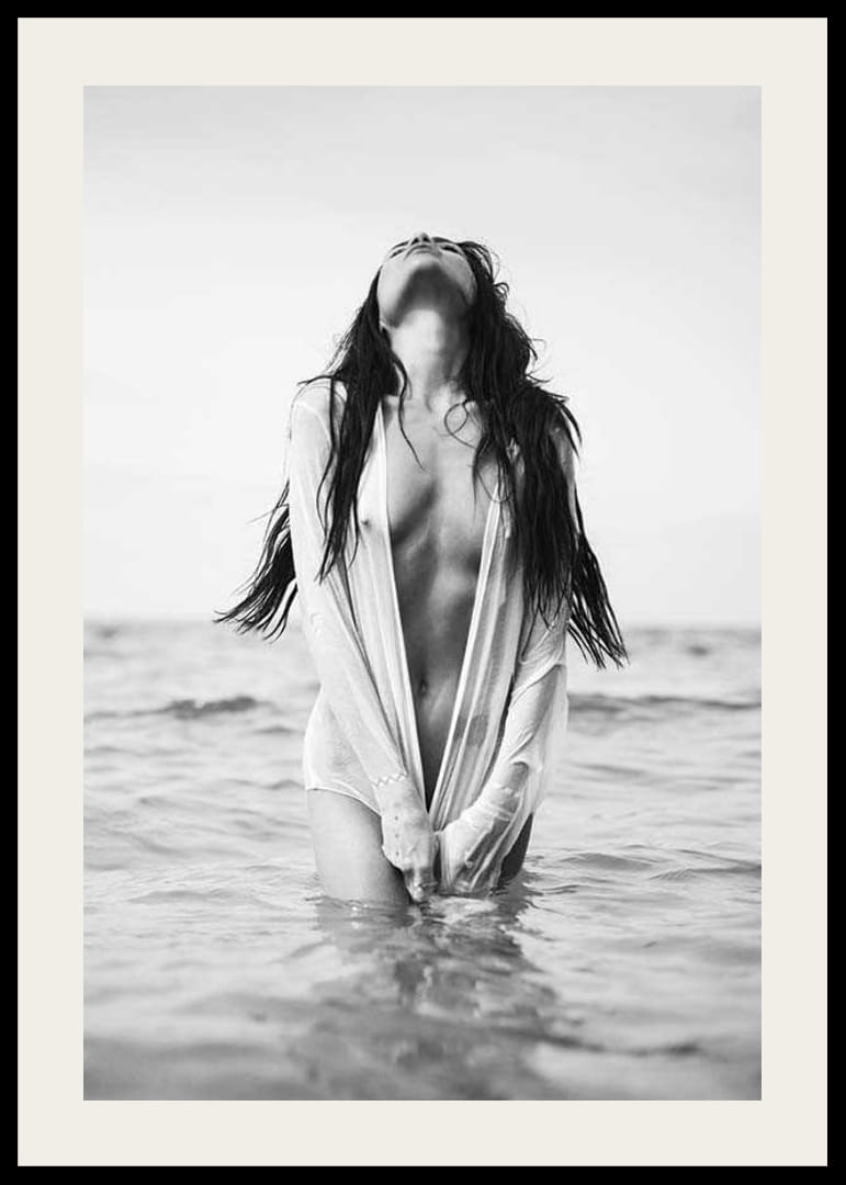 Egy hosszú, vizes hajú fiatal nő áll, felsőtestét felemelve, fejét hátrabillentve a víz szélén. Nyitott, vékony inget visel, amely kiemeli a fekete-fehér motívum művészi kifejezését. A víz és a lágy vonalak kombinációja modern megjelenést kölcsönöz a poszternek, és könnyen elhelyezhető mind a hálószobákban, mind a nappalikban.