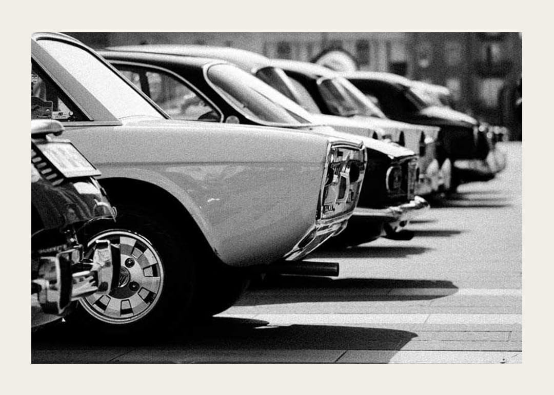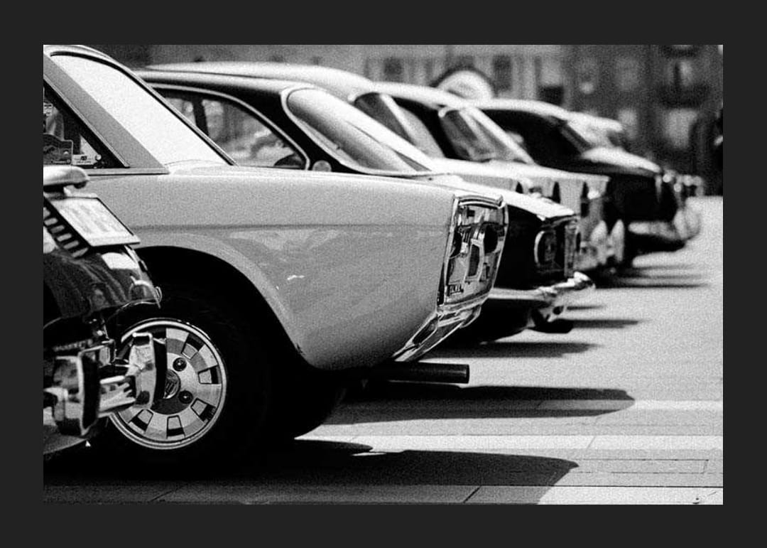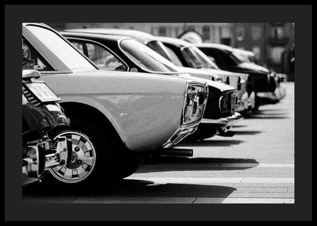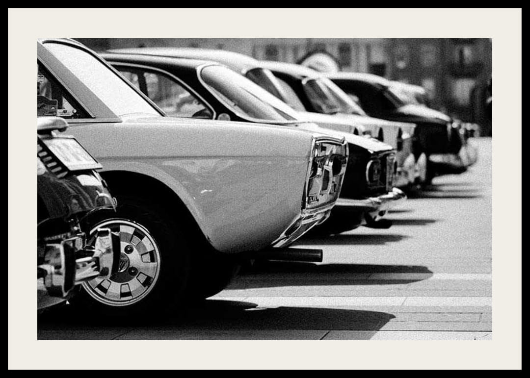 Több klasszikus autó hátulja sorakozik egy parkolóban egy fekete-fehér fényképen, éles kontrasztokkal és korabeli hangulattal. A festék tükröződései és a határozott vonalak retrospektív kifejezést kölcsönöznek a motívumnak. Ez a poszter tökéletes garázsba, nappaliba vagy dolgozószobába, ahol érdeklődnek az autók iránt.