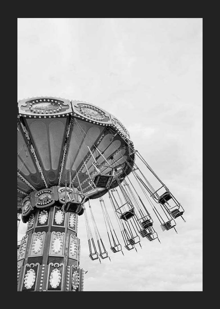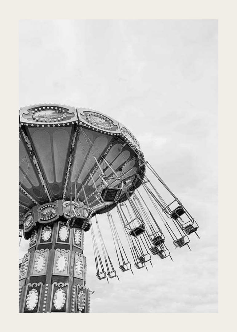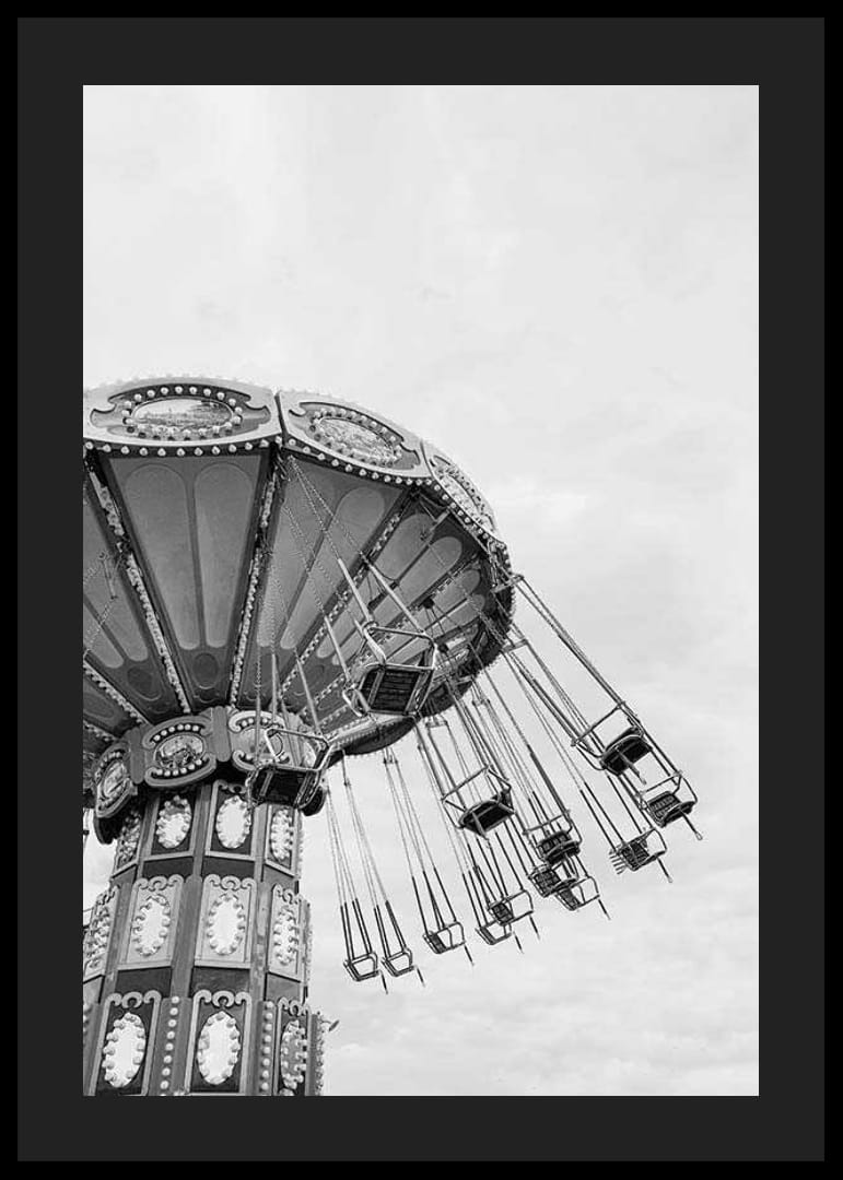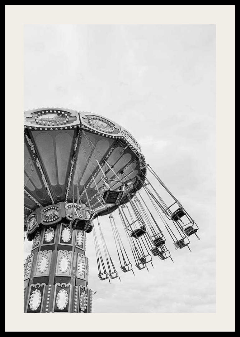 Egy klasszikus láncfűrész fekete-fehér közeli képe ragyogó égbolt előtt. Az üres hinták és a dekoratív szerkezet nosztalgikus hangulatot kölcsönöznek a motívumnak. A letisztult részletek és az egyszerű háttér kombinációja ezt a posztert nappaliba, dolgozószobába vagy hálószobába illő kiegészítővé teszi.
