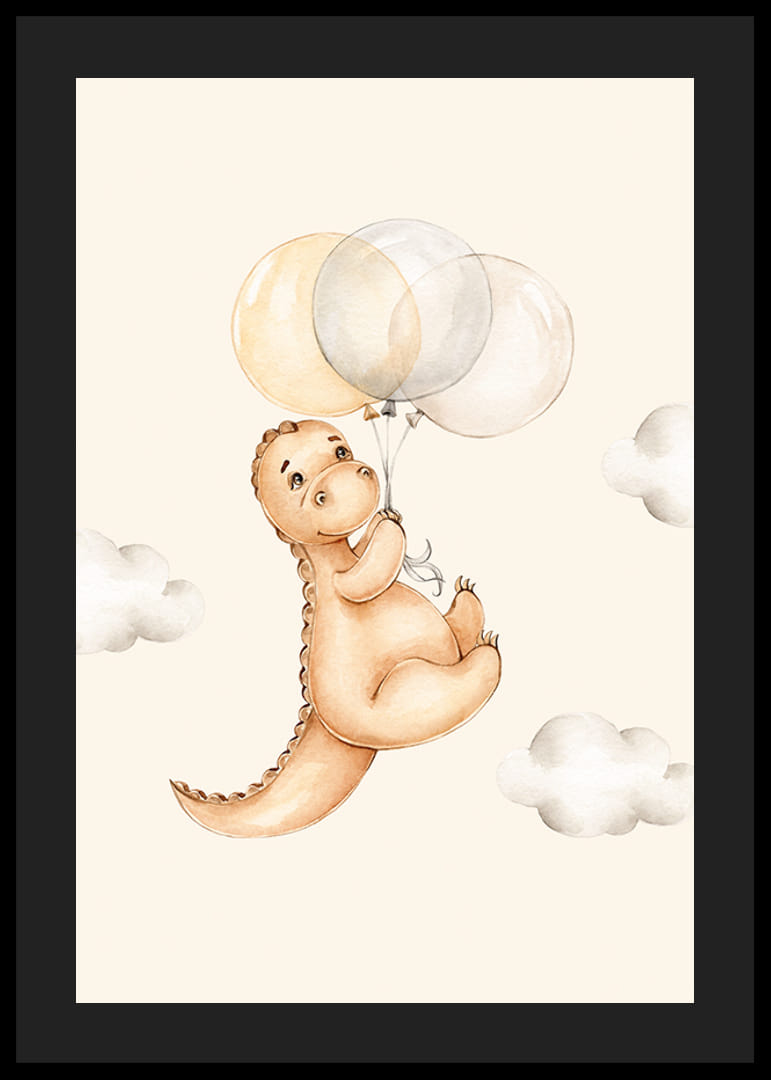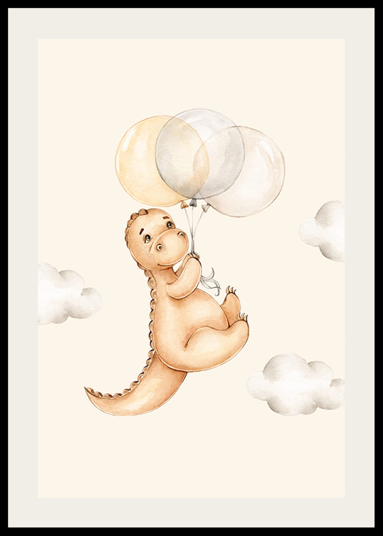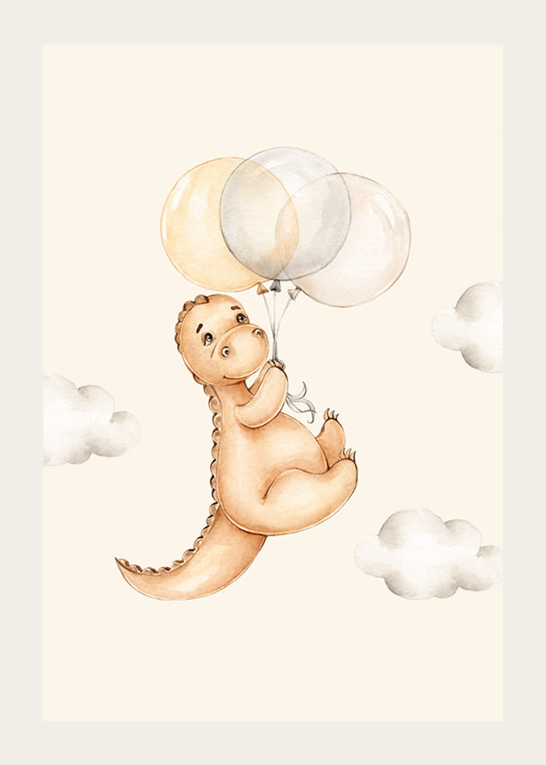 A motívum egy rajzfilm világosbarna dinoszauruszból áll, amely magasan repül a bolyhos fehér felhők között, melyet három tompa bézs és szürke árnyalatú lufi emel fel. A homokszínű háttér nyugodt benyomást kelt, az illusztráció pedig lágy akvarell elemekkel rendelkezik. Egy játékos poszter, amely melegséget és fantáziát visz a gyerekszobába.