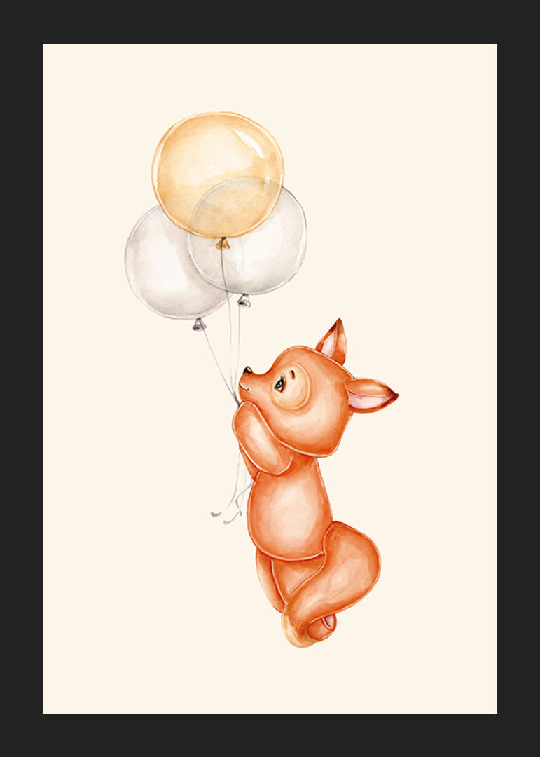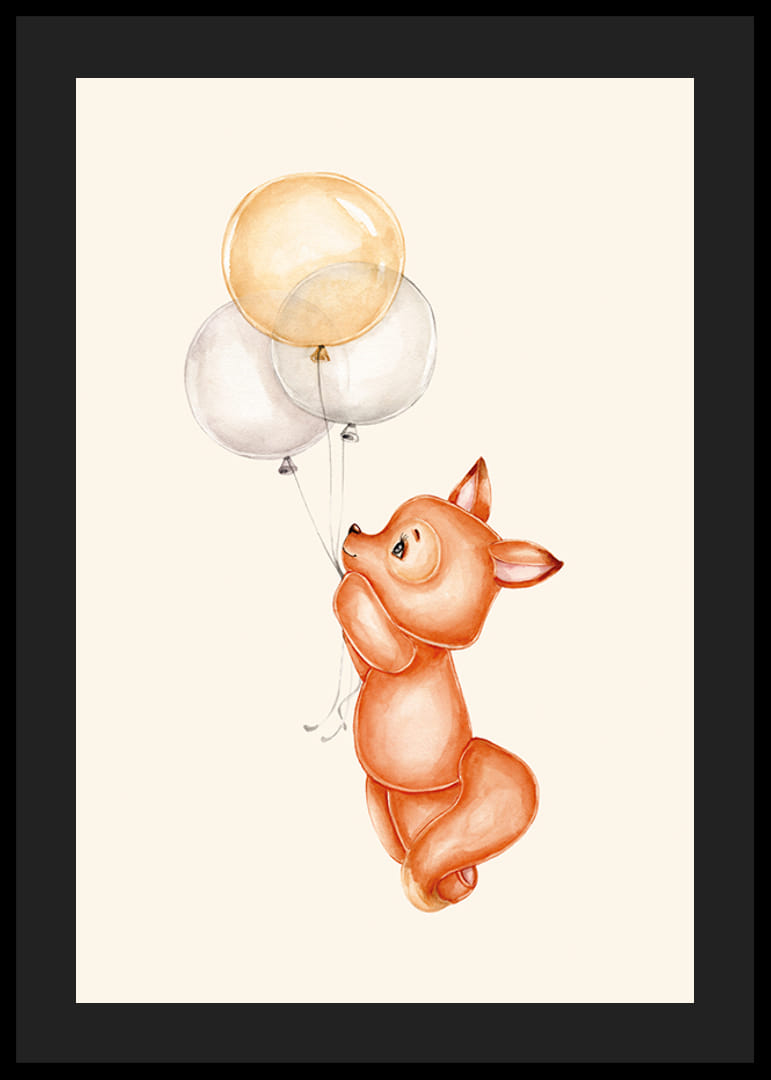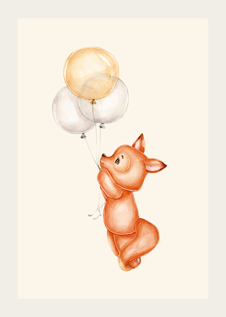 Egy lágy narancssárga árnyalatú apró róka három sárga és fehér lebegő lufit tart világos homokszínű háttér előtt. A játékos akvarell illusztráció könnyed hangulatot teremt és barátságos kifejezést kölcsönöz. Ez a poszter jól illik a gyerekszobákba, és meleg, hívogató hangulatot teremt a belső térben.