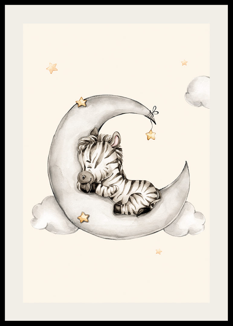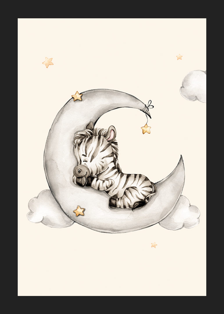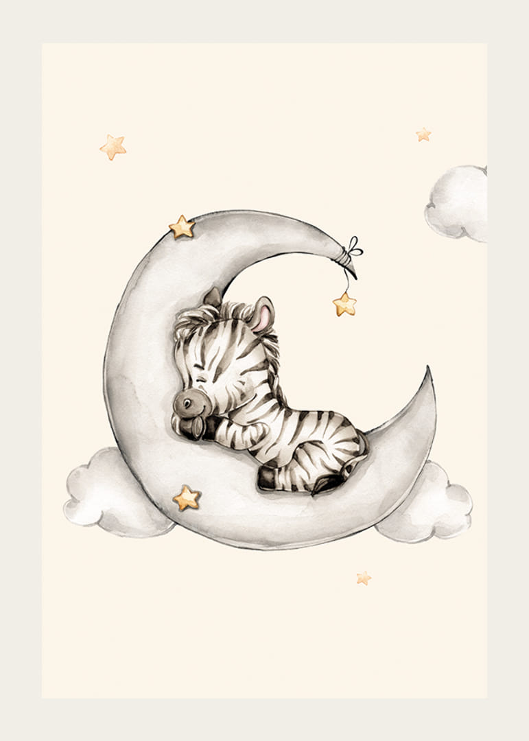 A motívum közepén egy kis zebra csukott szemmel pihen egy szürkésfehér holdsarlón. A hold körül lágy felhők és diszkrét sárga árnyalatú csillagok láthatók a világos homokszínű háttér előtt. Ez az akvarell stílusú poszter nyugodt és hívogató hangulatot teremt, és kiválóan alkalmas dekorációnak egy gyerekszobában.