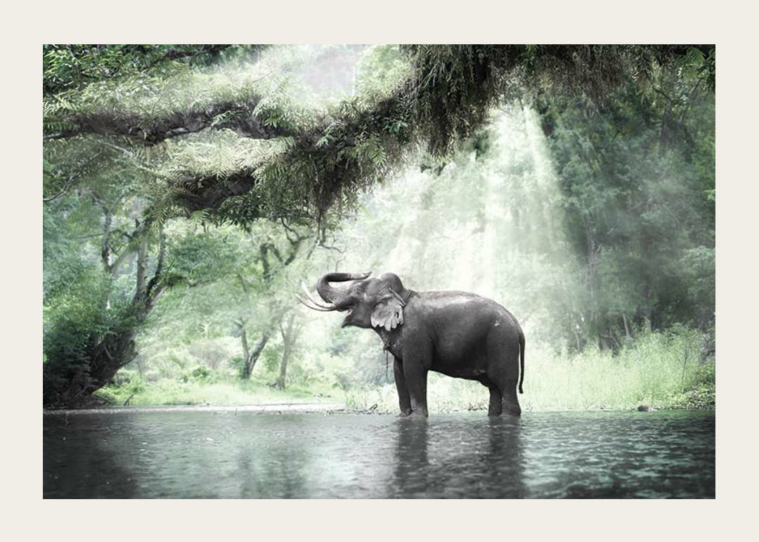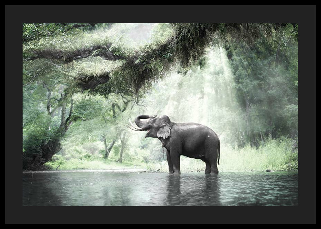 Egy fenséges elefánt áll egy sekély vízben, buja, zöld dzsungel veszi körül. A napsugarak átszűrődnek a sűrű lombkoronákon, megvilágítva az állatot és a nyugodt vizet. Részletesen kidolgozott fotóposzter természetes zöld és szürke tónusokkal, amelyek nyugodt benyomást keltenek, és nappaliba, előszobába vagy dolgozószobába is alkalmasak.
