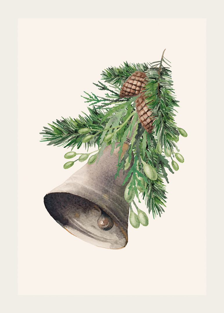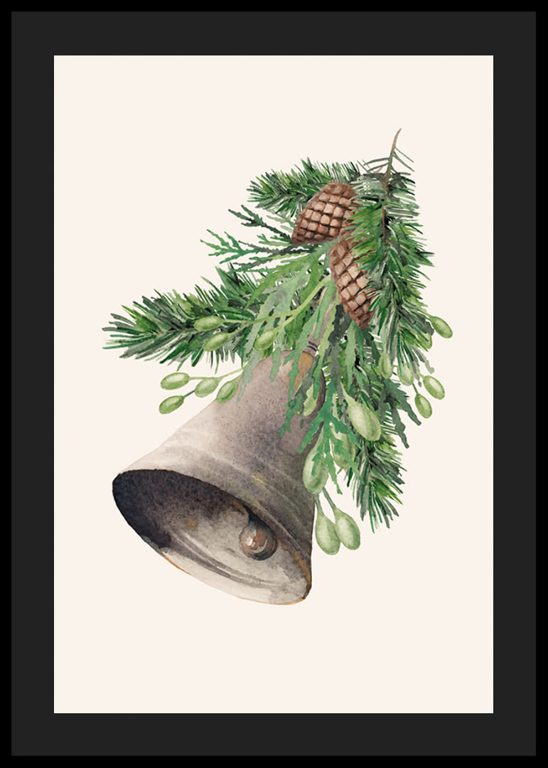 A poszter motívuma egy kézzel festett, akvarell stílusú karácsonyi harang, zöld lucfenyőágakkal, tobozokkal és apró olívazöld levelekkel díszítve, világos homokszínű alapon. A lágy színpaletta és a természetes hatás stílusos kiegészítője lehet otthonodnak télen vagy karácsony előtt.