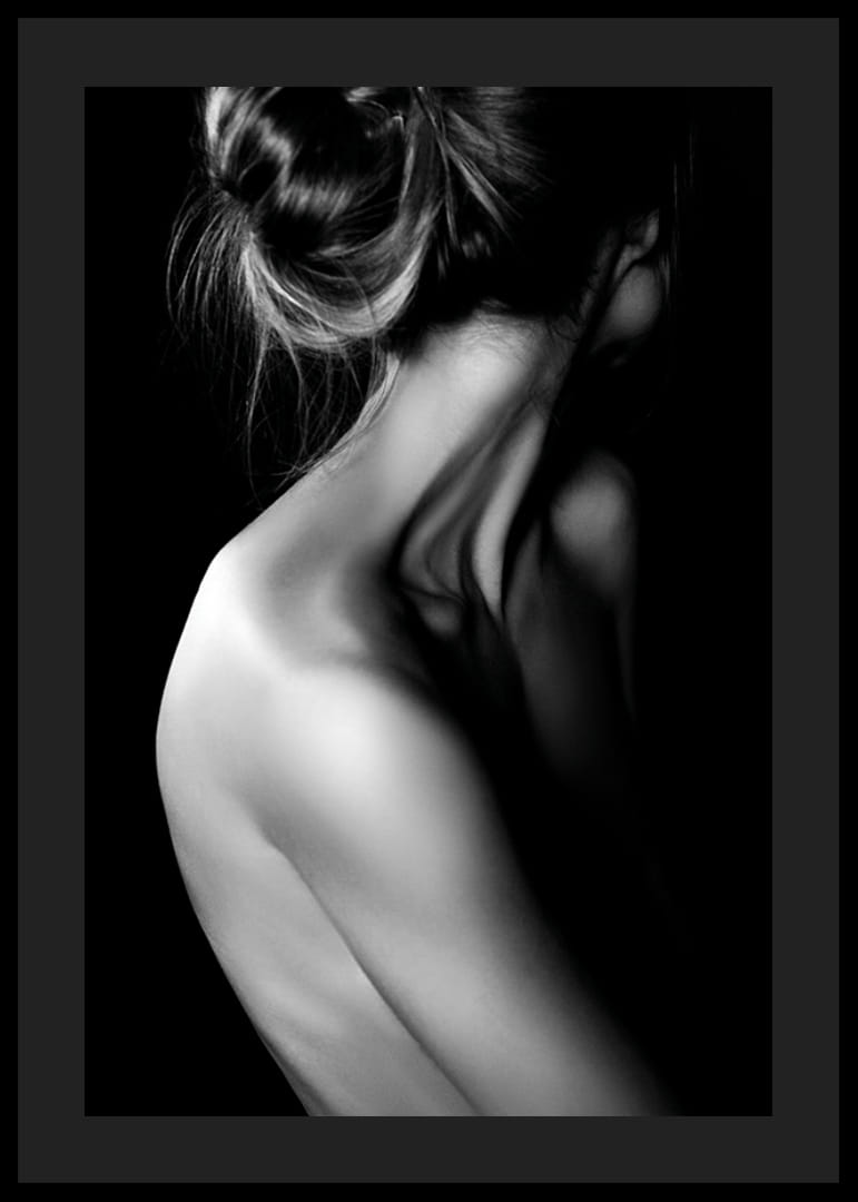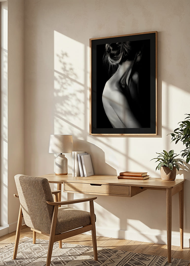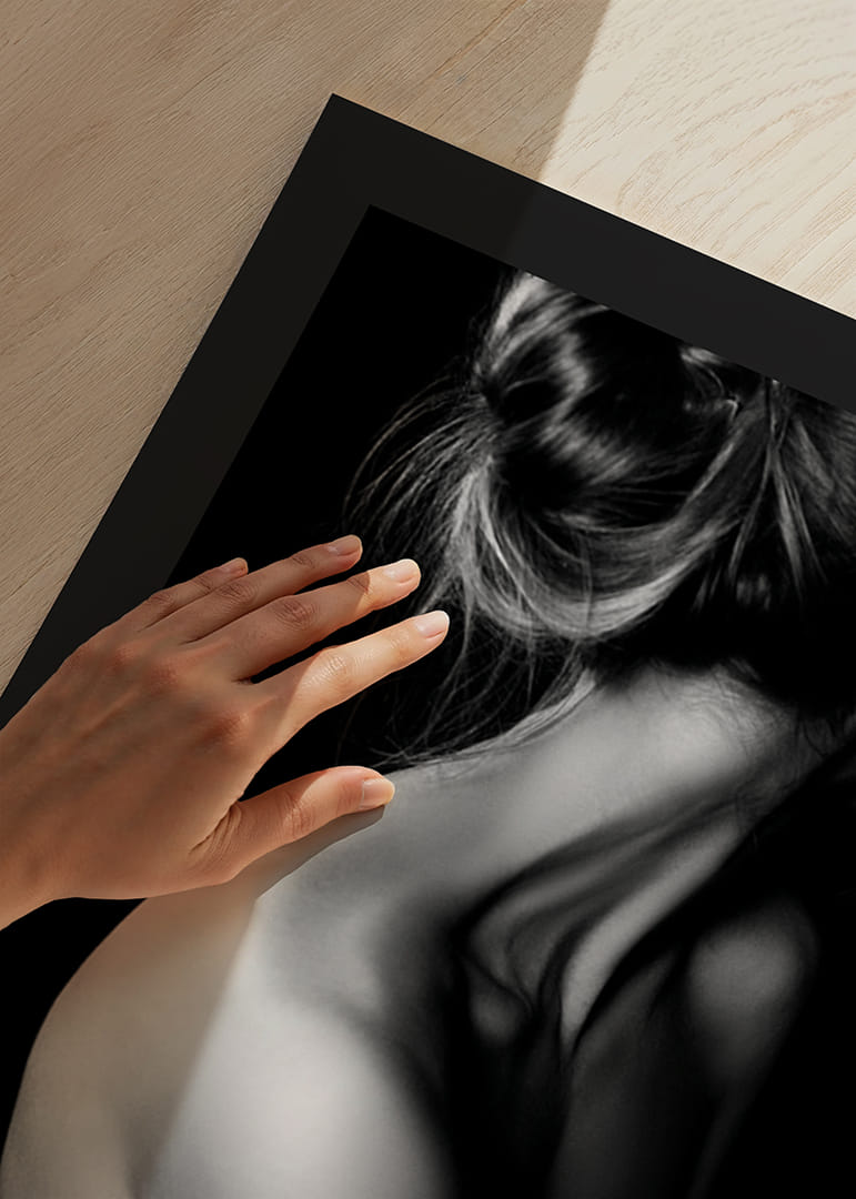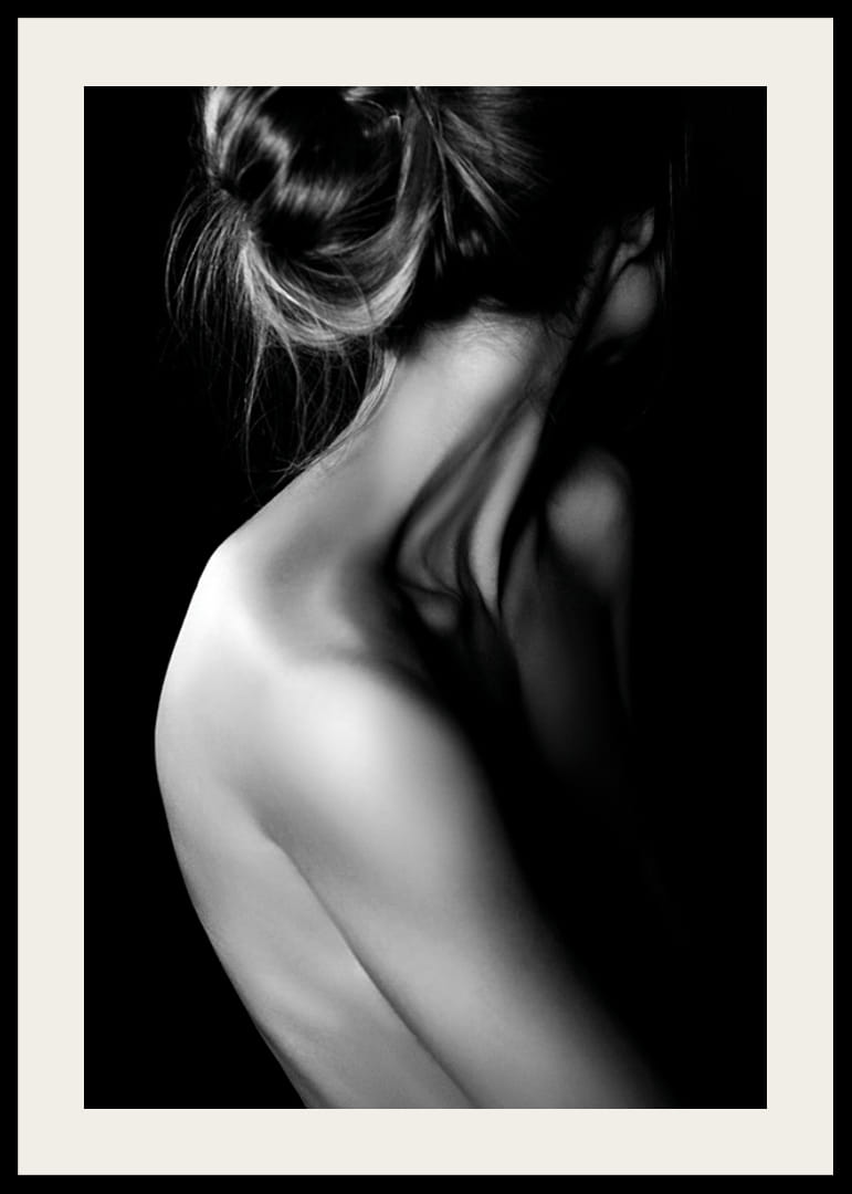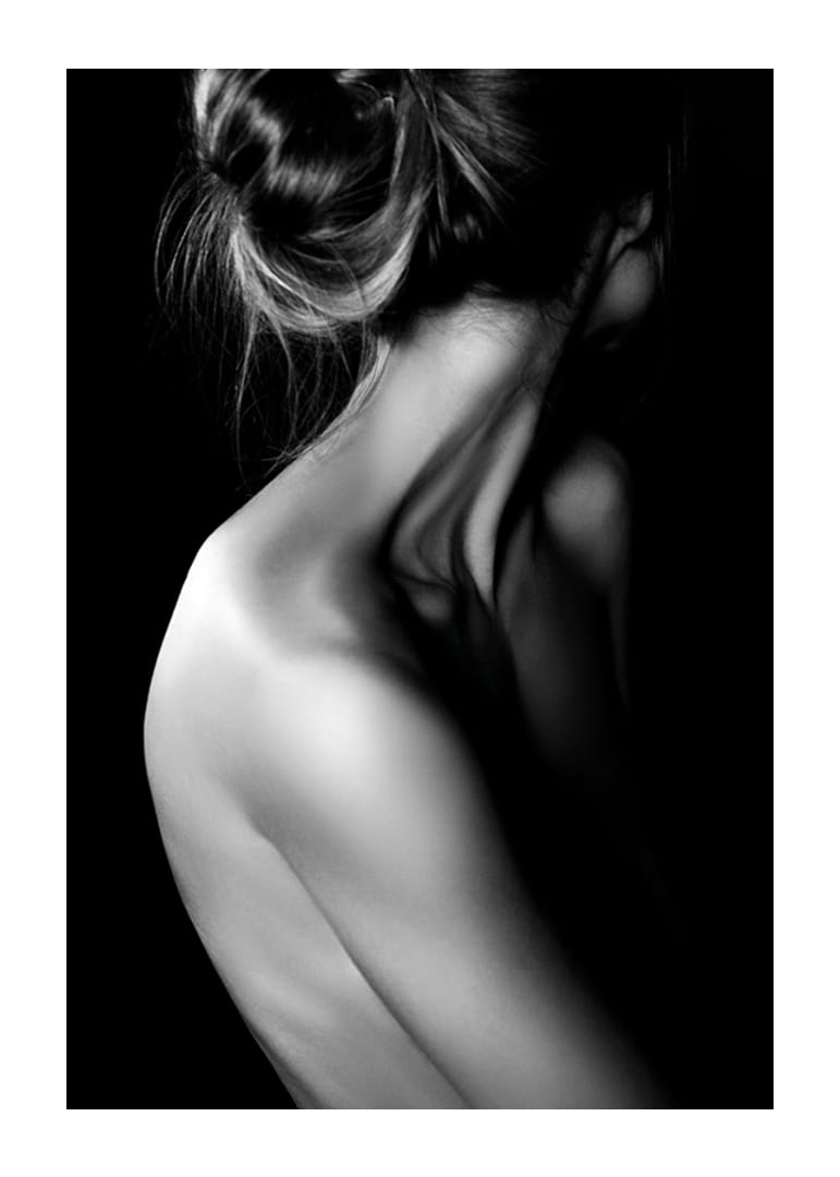 Egy sötét háttér előtt ábrázolt, feltűzött hajjal és elfordított arccal rendelkező nő sziluettje. A fény kiemeli a nyak és a vállak vonalait egy fekete-fehér kompozícióban. A motívum stílusos és visszafogott kifejezésmódot kölcsönöz, a poszter pedig modern hangulatot kölcsönöz például egy hálószobának vagy nappalinak.