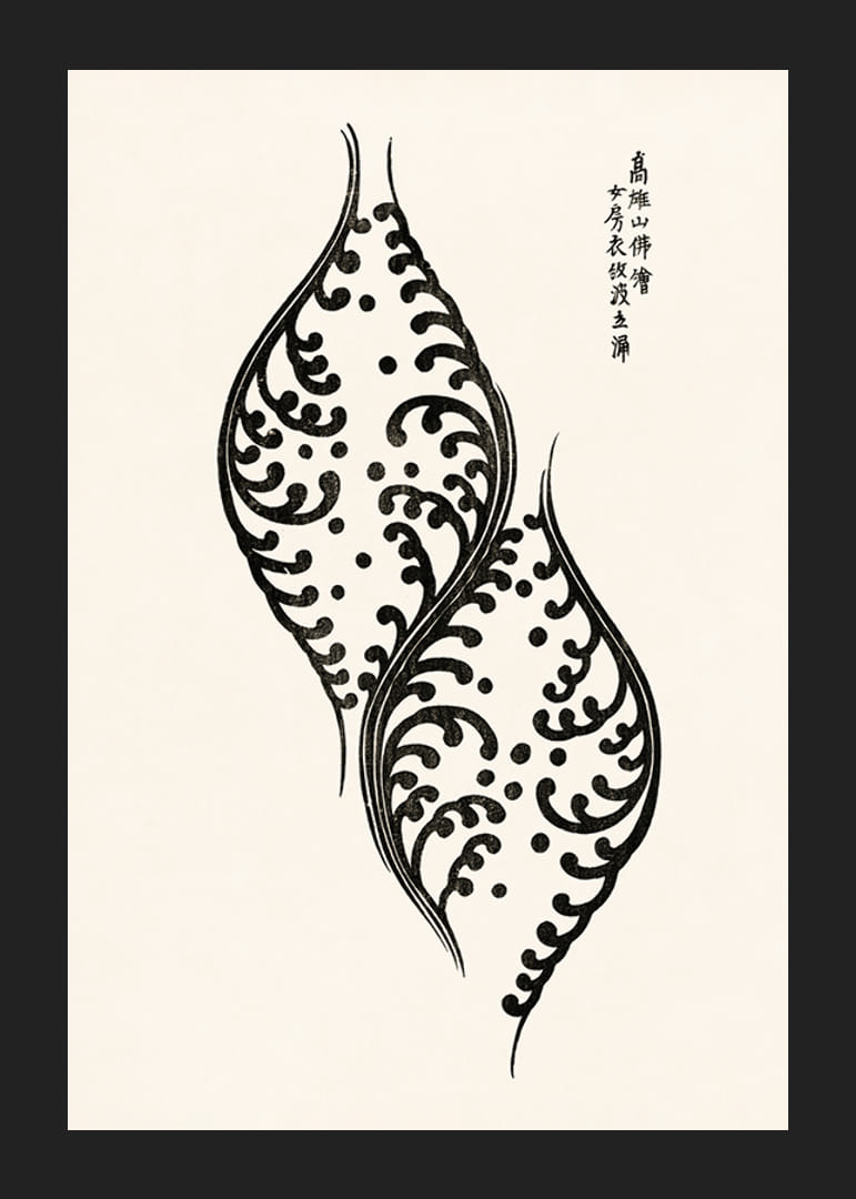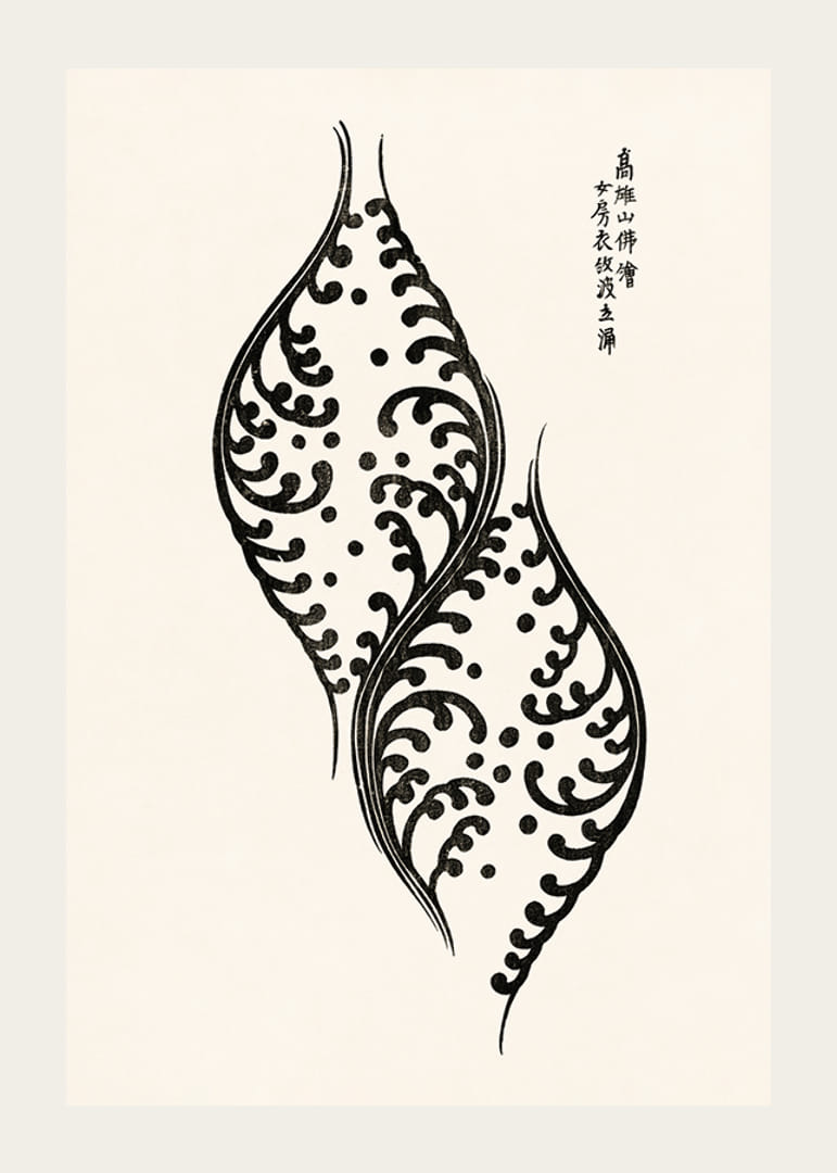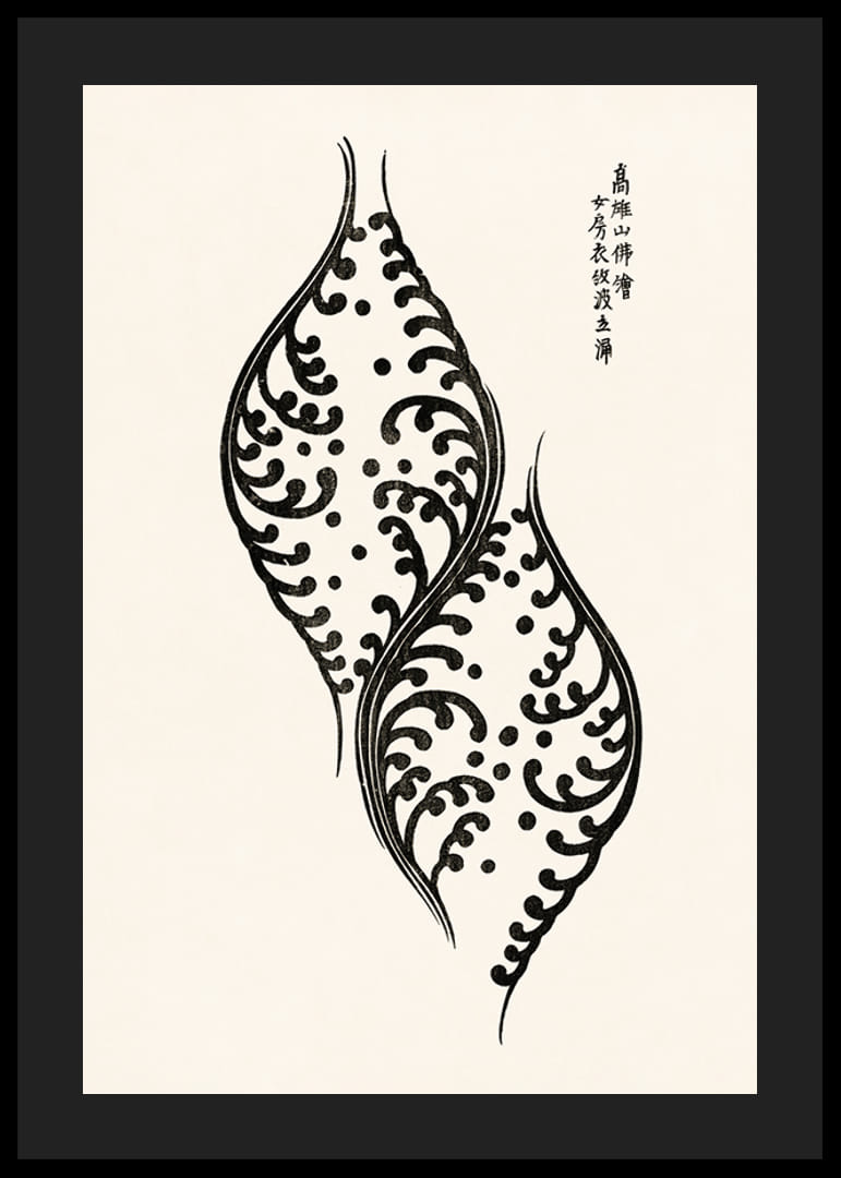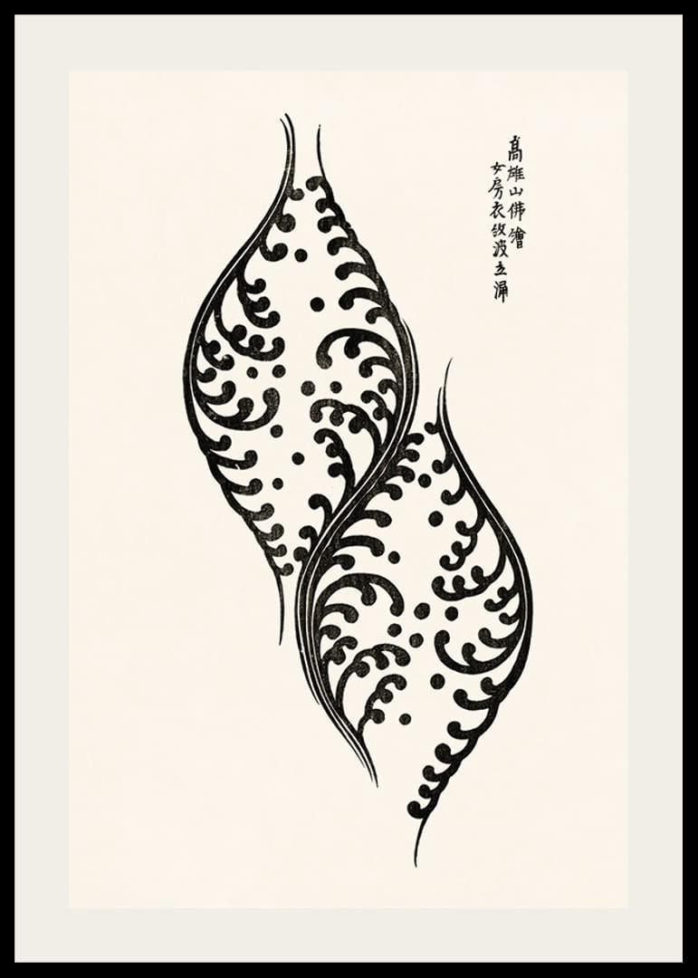 Két stilizált, fekete-fehér levélforma organikus, hullámzó mintákkal jelenik meg világos bézs háttér előtt. Jobbra fent japán kalligráfia látható. A grafikai tervezés időtlen és légies hangulatot kölcsönöz a poszternek, így diszkrét, mégis kifejező hatású mind a nappaliban, mind a munkahelyen.