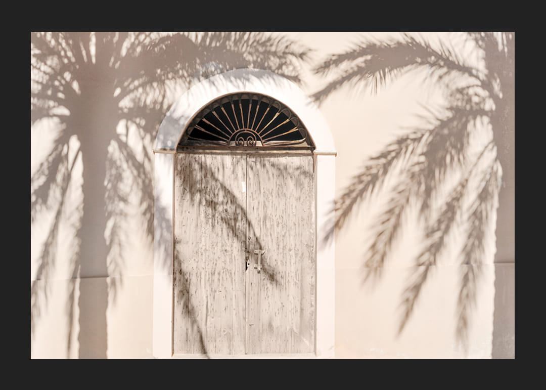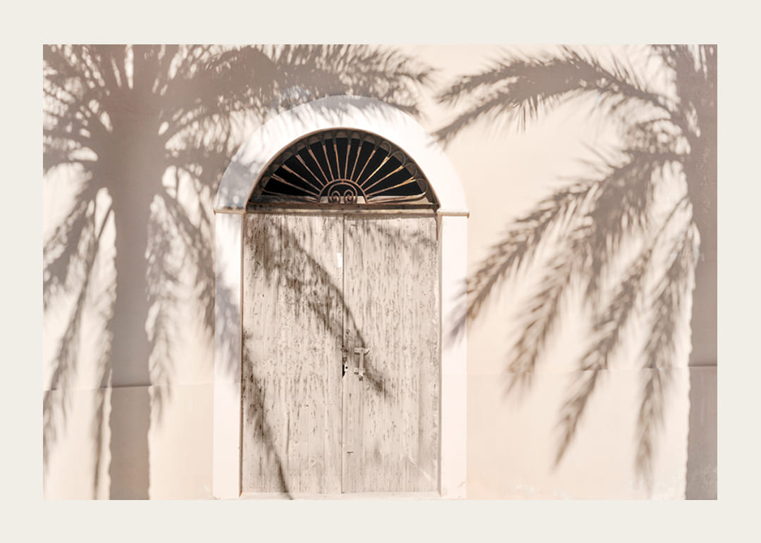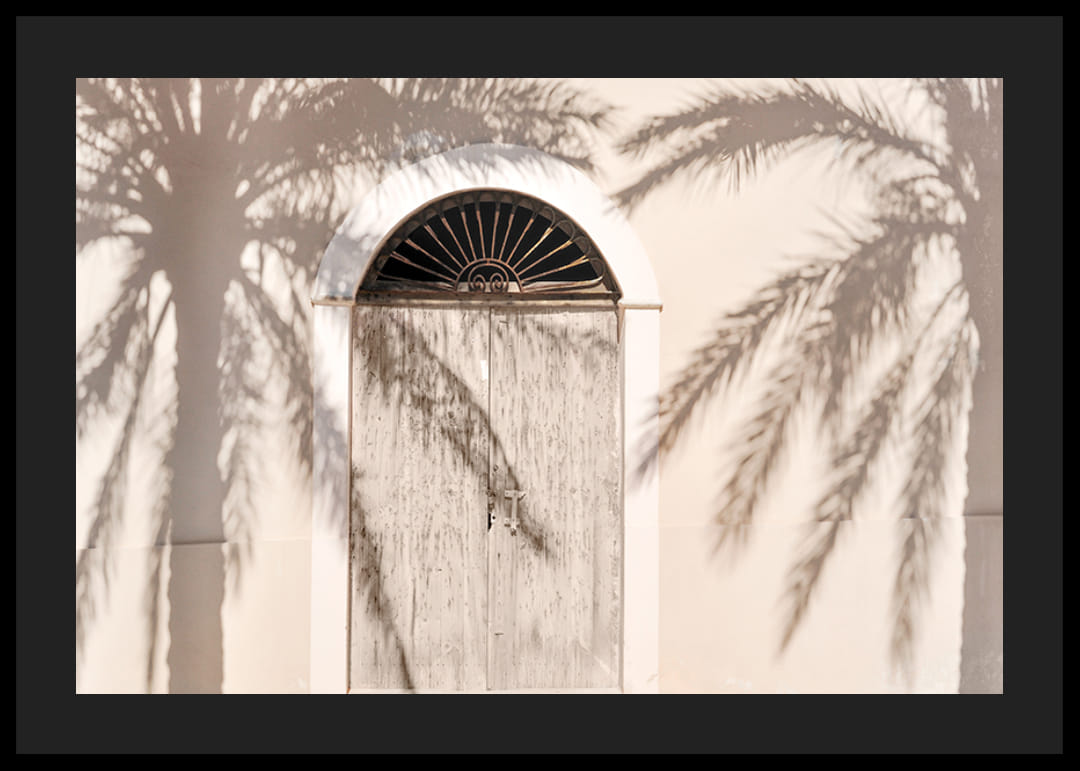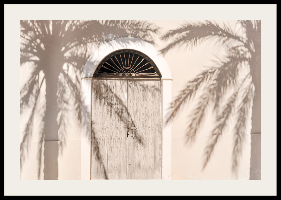 A napsütötte, gyönyörűen lekerekített tetejű fa kaput a pálmafák lágy árnyékai borítják a világos homlokzatra. A világos bézs és homokszínű tónusok dominálnak a motívumon, meleg, nyárias hangulatot kölcsönözve a poszternek. Ez a fénykép nyugodt részlete lehet egy hálószobának, előszobának vagy nappalinak, nyugodt hangulatot teremtve.
