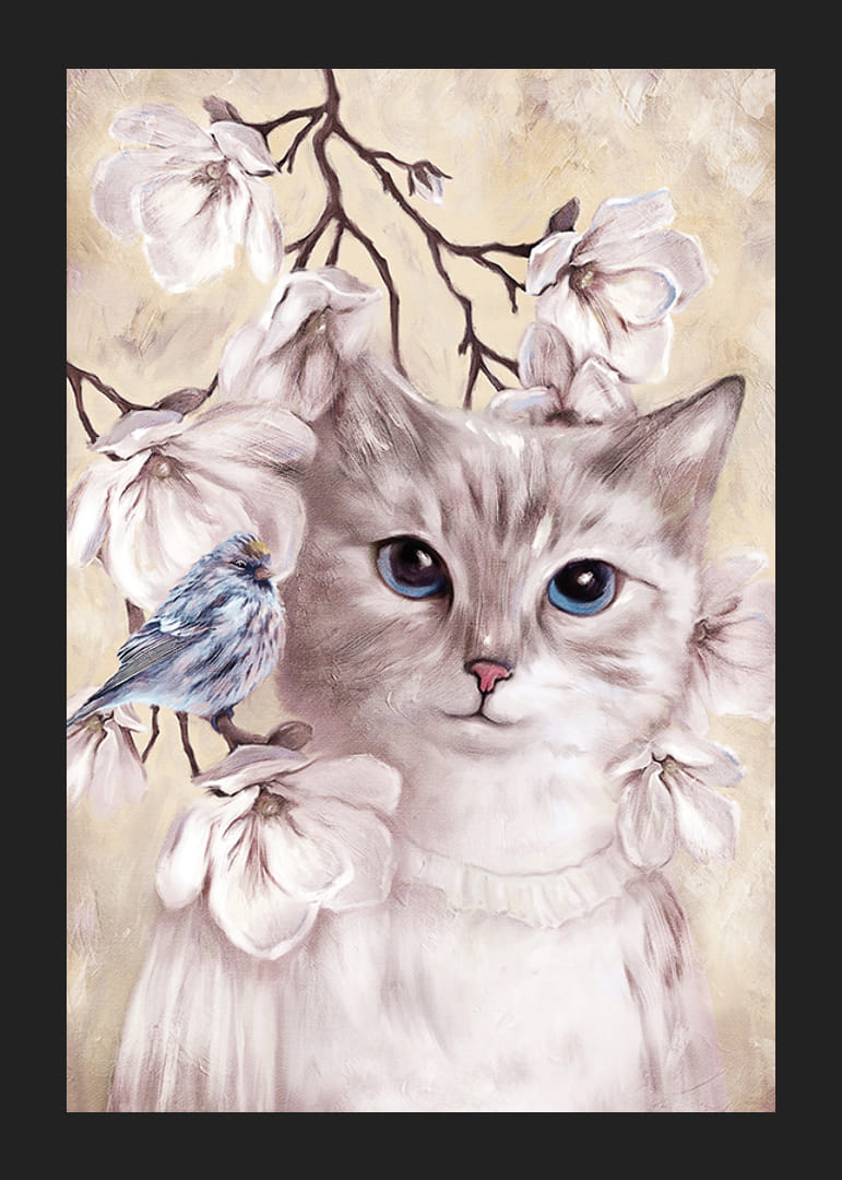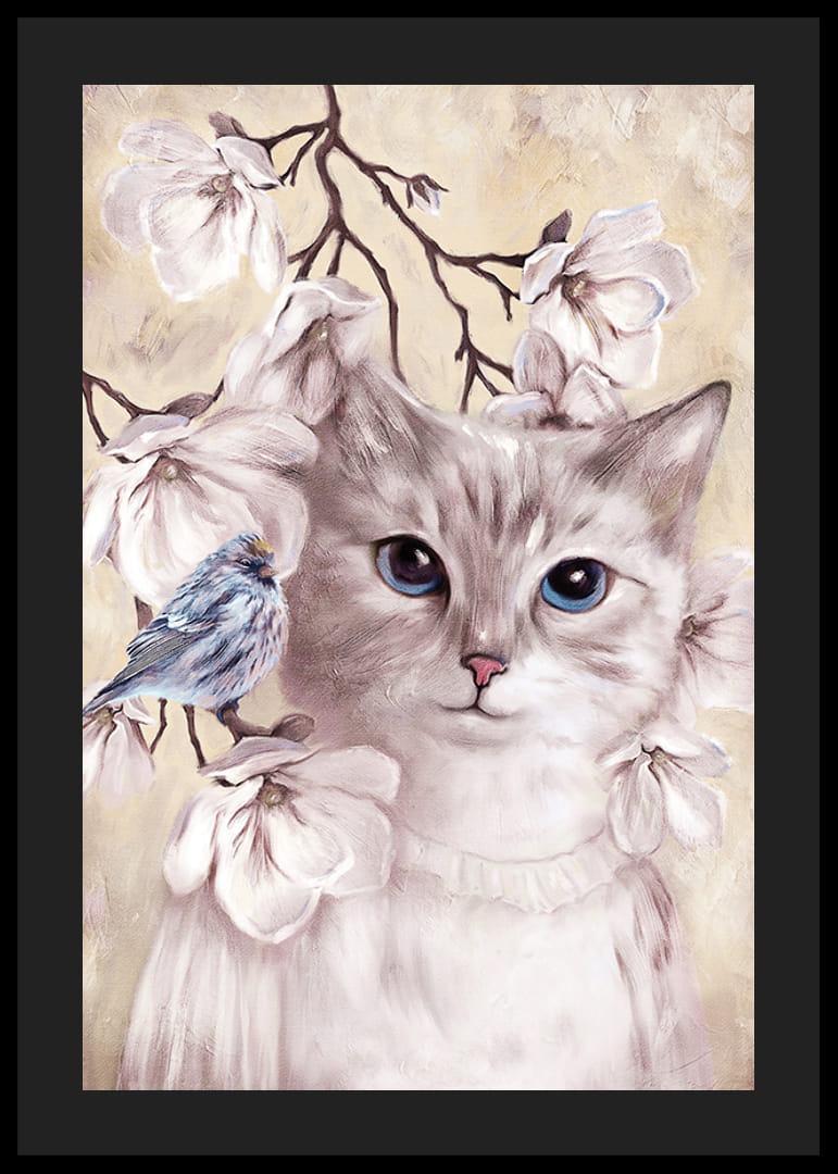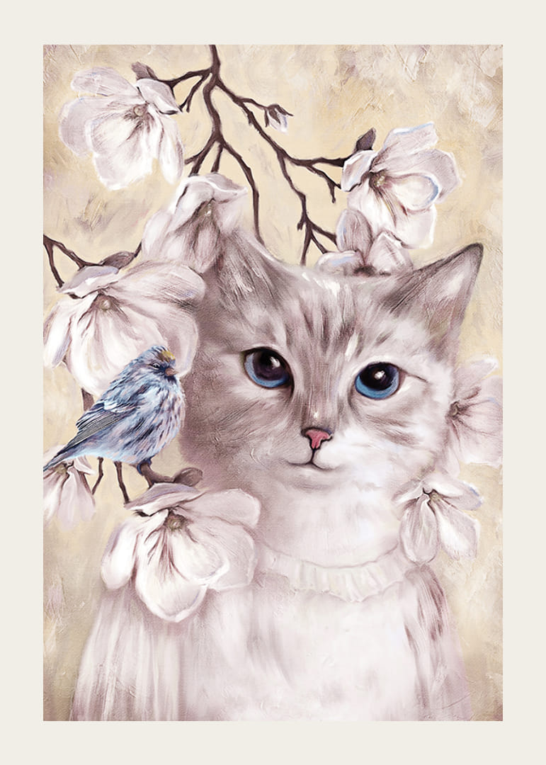 Egy lágyan illusztrált, nagy kék szemű macska jelenik meg fehér virágok és vékony ágak között. Egy apró kék madár ül az egyik ágon, kiegészítve a nyugodt motívumot. A visszafogott bézs háttér megerősíti a harmonikus érzést. A motívum játékos, mégis stílusos hangulatot kölcsönöz, és különösen alkalmas gyerekszobákba poszterként.