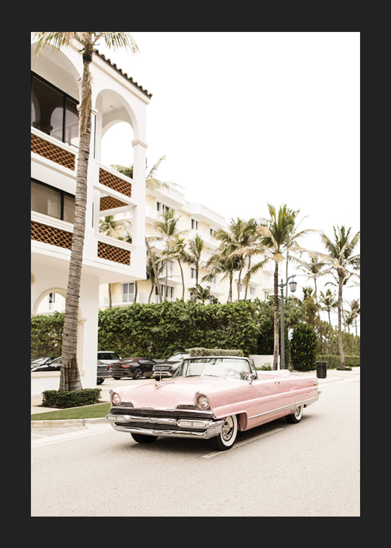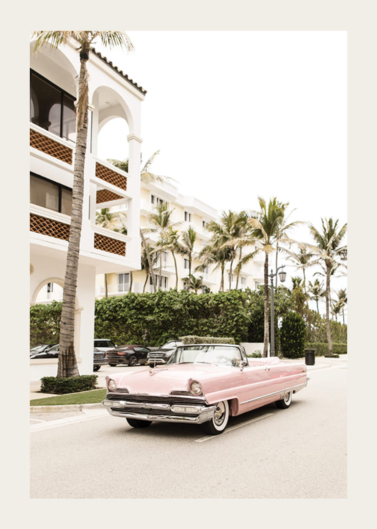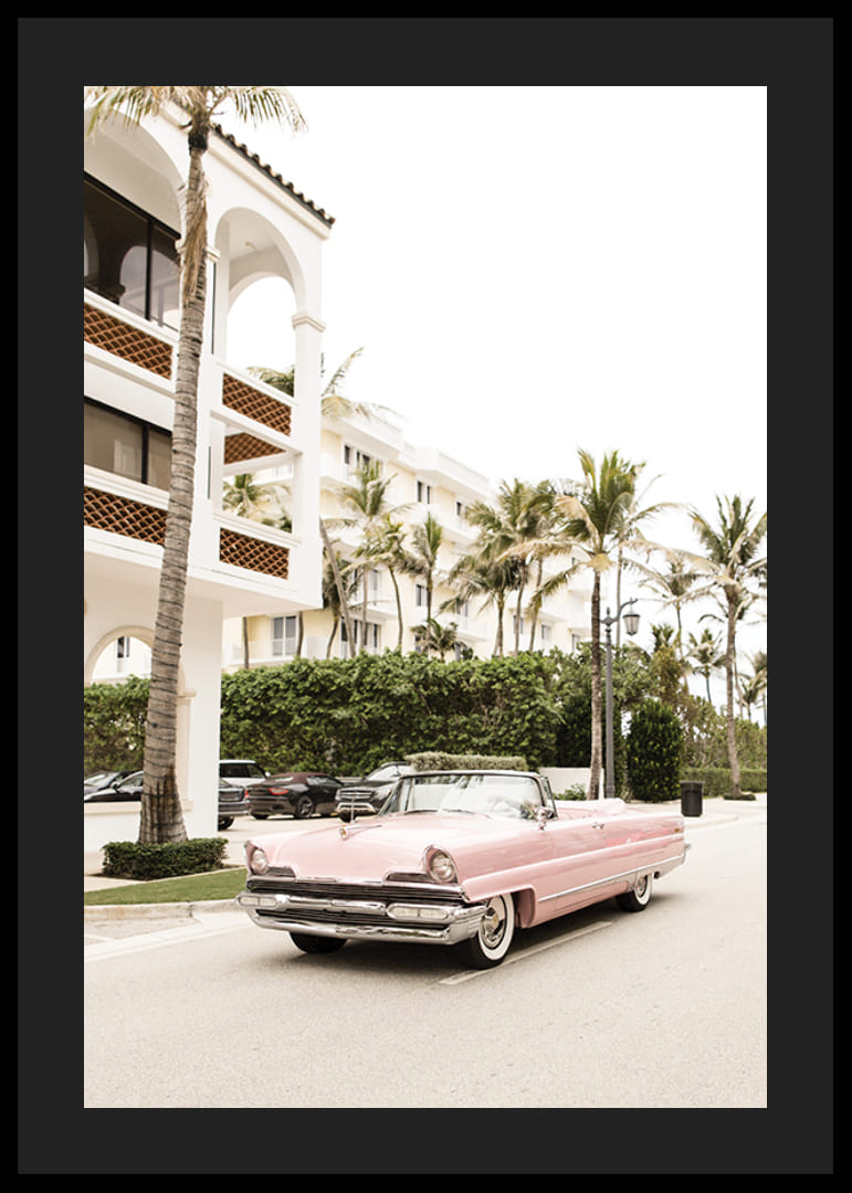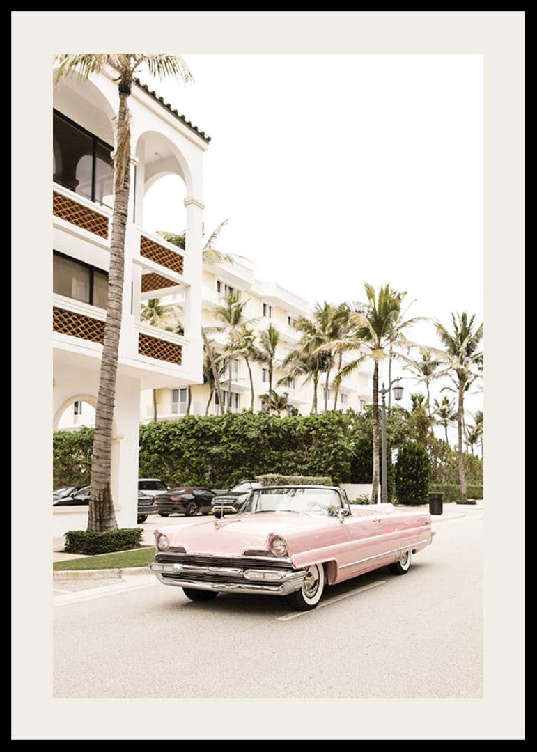 Egy klasszikus, rózsaszín, 1950-es évekbeli amerikai kabrió parkol egy széles utcán, magas pálmafákkal és elegáns, világos épületekkel körülvéve. A motívumot világos és meleg tónusok uralják, retró hangulatot kölcsönözve a poszternek. Jól illik például egy nappaliba vagy egy előszobába.