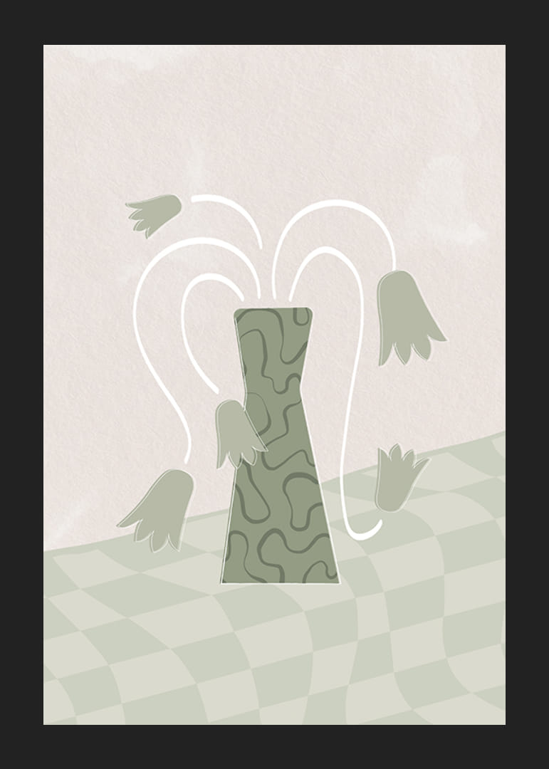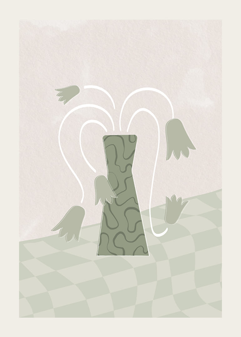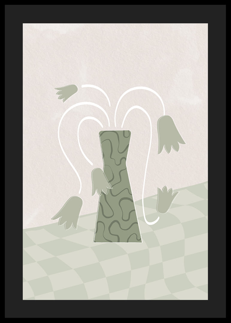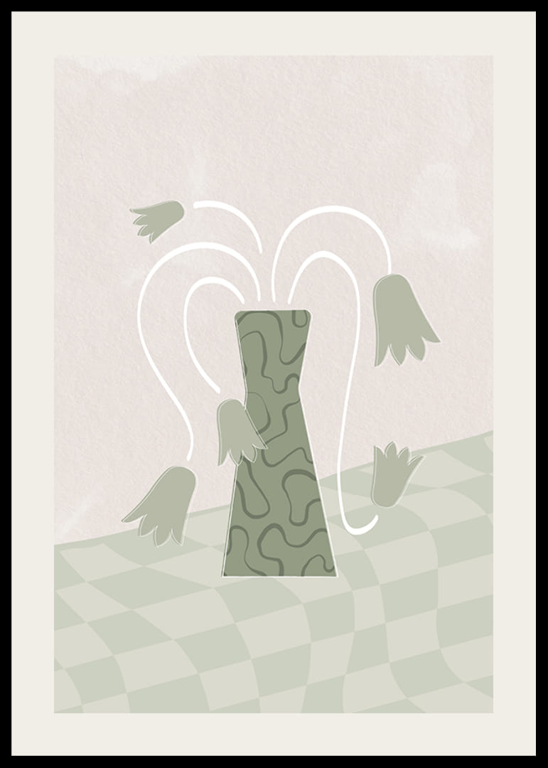 A poszter motívuma egy zöld, absztrakt formájú, hullámzó mintázatú váza, amelyből stilizált matt zöld tulipánok hajlanak kifelé vékony fehér vonalak mentén. A kockás alsó felület grafikus benyomást kelt, míg a világos háttér egyszerűséget teremt. A poszter modern, nyugodt környezetbe illik.