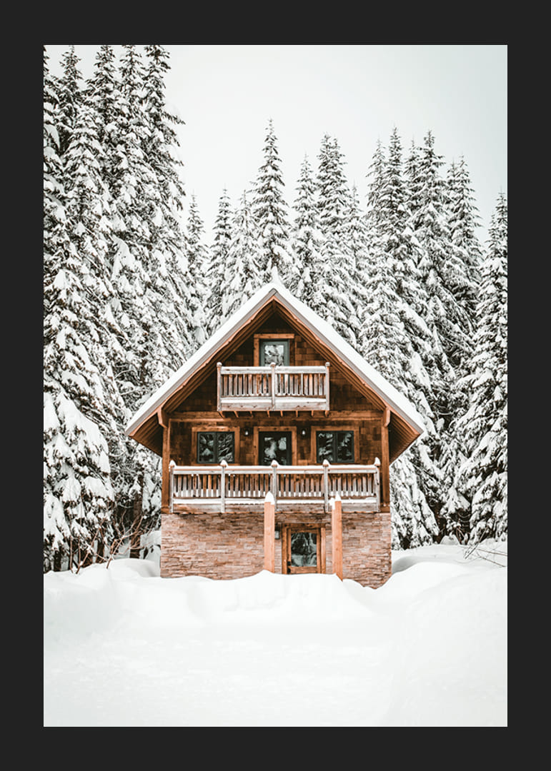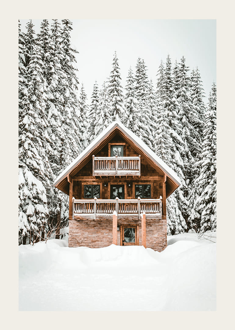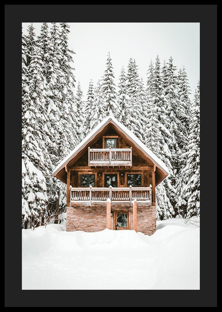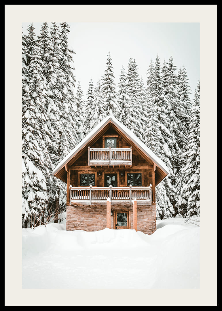 Egy klasszikus faház áll egy hófödte táj közepén, magas fenyőfák keretezik, melyek ágait vastag fehér hó borítja. A fa homlokzat meleg színe kontrasztban áll a világos háttérrel. Ez a poszter határozott télies jelleget kölcsönöz, amely a moderntől a rusztikus környezetig mindenbe illik.