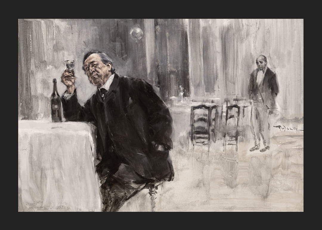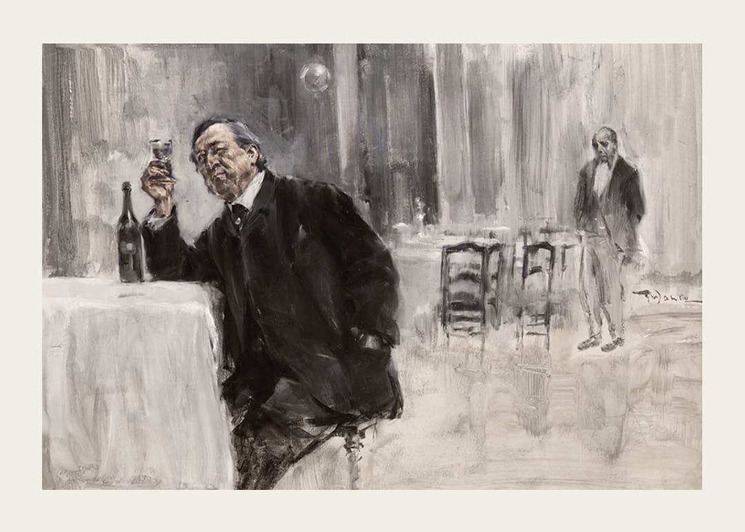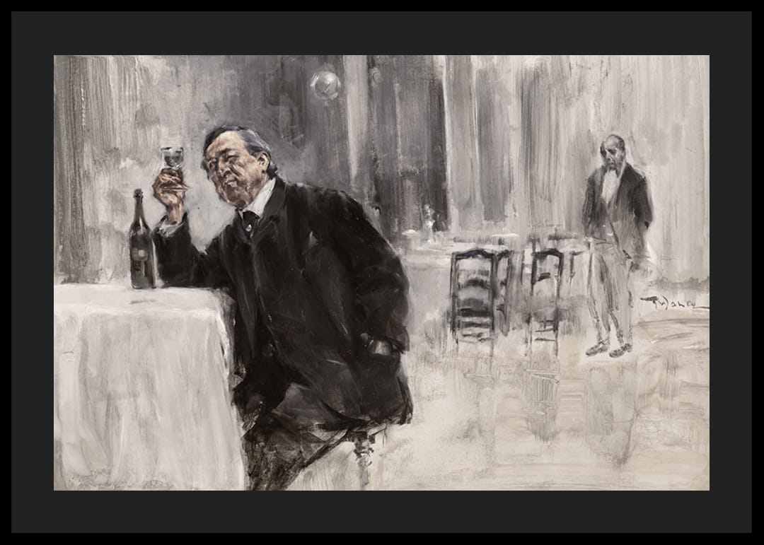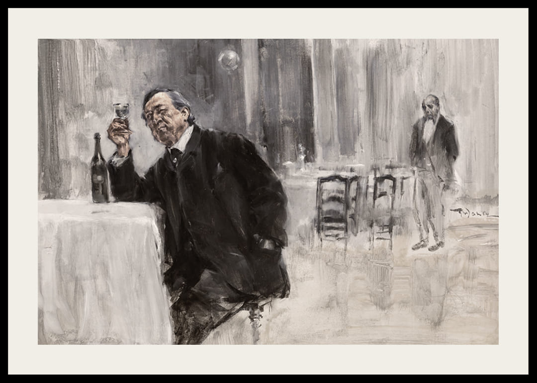 Poszter Friedrich Wahle német művész "Öl Auf Holzplatte" festményével 1883-ból. Friedrich Wahle, gyakran "Der Weinkennernek" nevezett, a kor egyik vezető borértője és kritikusa volt, és egy új típusú borkóstolót dolgozott ki. ahol éles szaglás és ízérzékelés segítségével azonosította a bor aromáját és ízét. Leghíresebb könyve a "Der Weinkenner", amelyet 1891-ben írt. A könyvben a boriparról, a bor előállításáról és kémiai összetételéről adott ismereteket. Művészként Wahle leginkább borfestményeiről ismert. Művészi tevékenységének nagy részét borosüvegeket, poharakat és más, az úgynevezett bor- és ételkultúrához kapcsolódó elemeket ábrázoló festmények megalkotásának szentelte. Munkásságának sajátos stílusa van, amely egyesíti a részletes és élénk színezést a borhoz kapcsolódó részletek iránti érdeklődéssel.