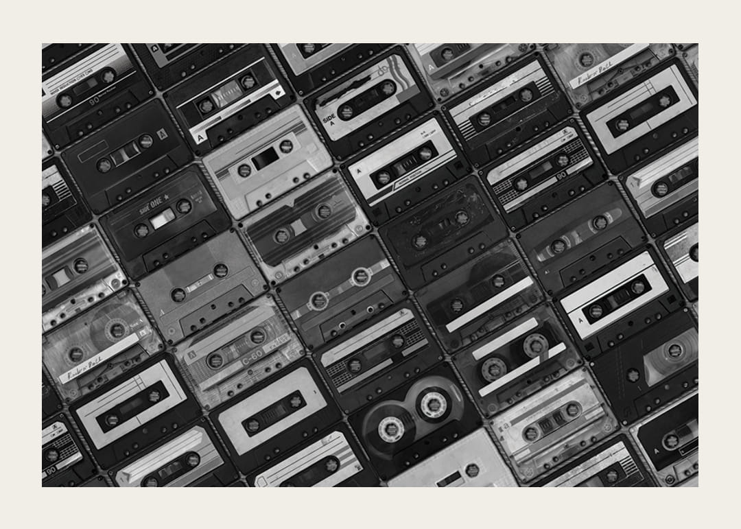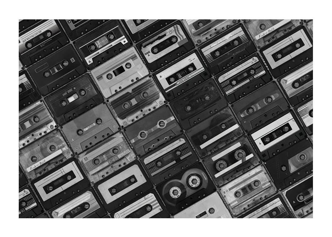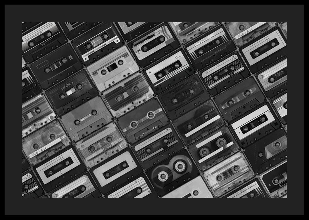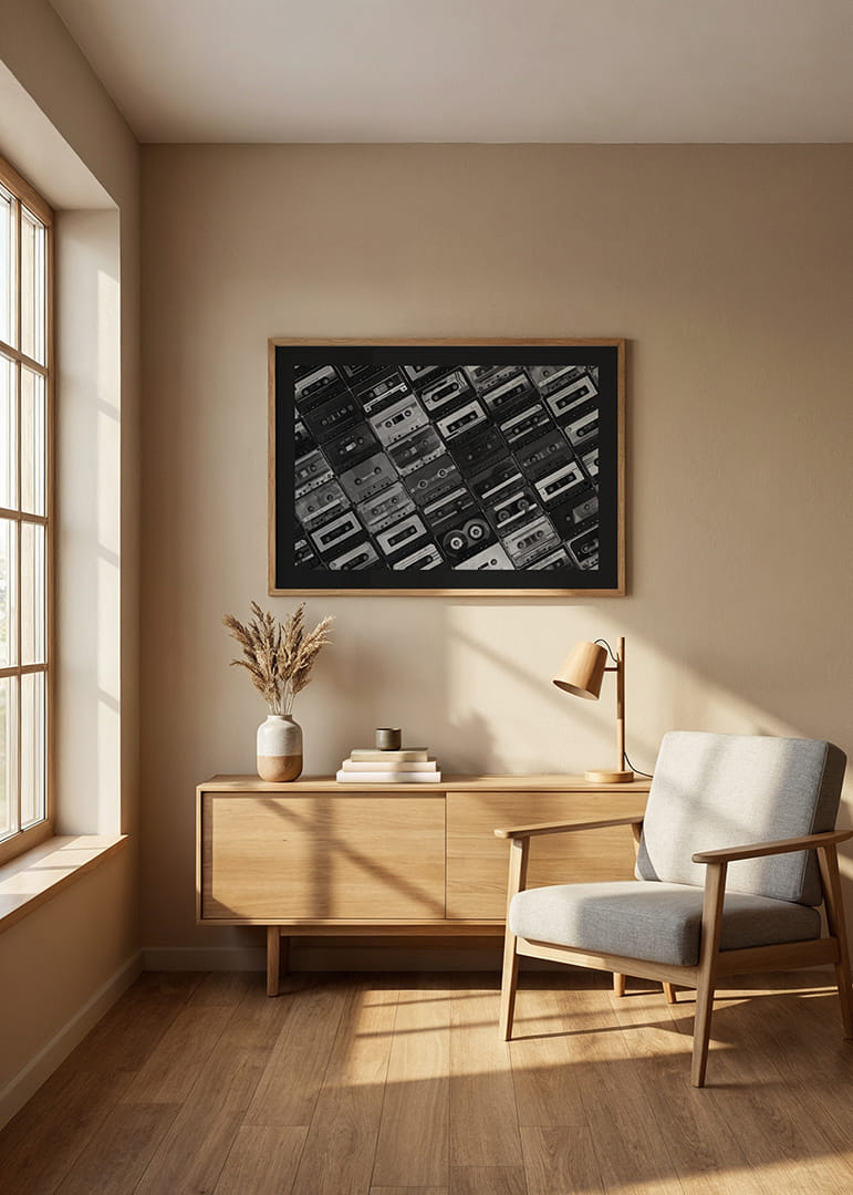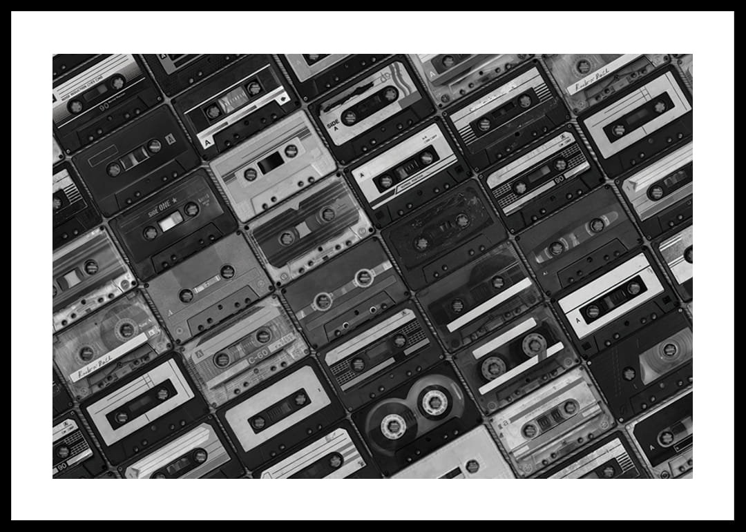 A klasszikus magnókazetták különféle változatai szigorú kockás mintázatban borítják a teljes felületet. A fekete-fehér fényképezés határozott vintage és nosztalgikus hangulatot kölcsönöz, minden kazetta egyedi részletekkel és feliratokkal rendelkezik. Ez a poszter tökéletes zeneszobákba vagy modern, retró stílusú nappalikba.