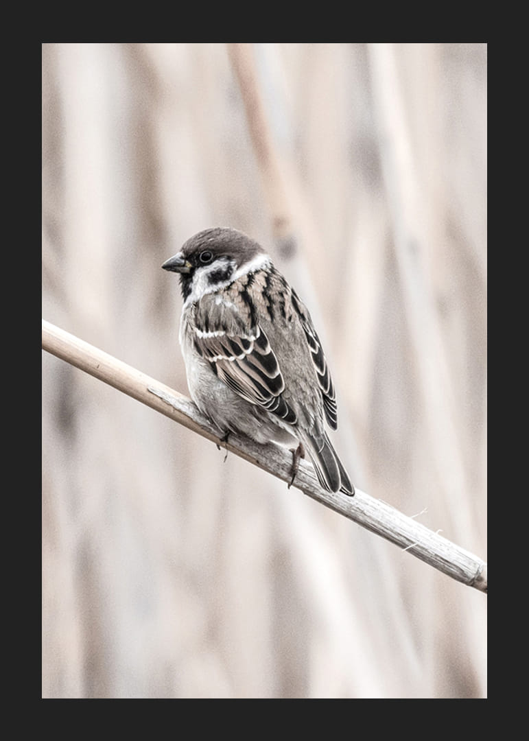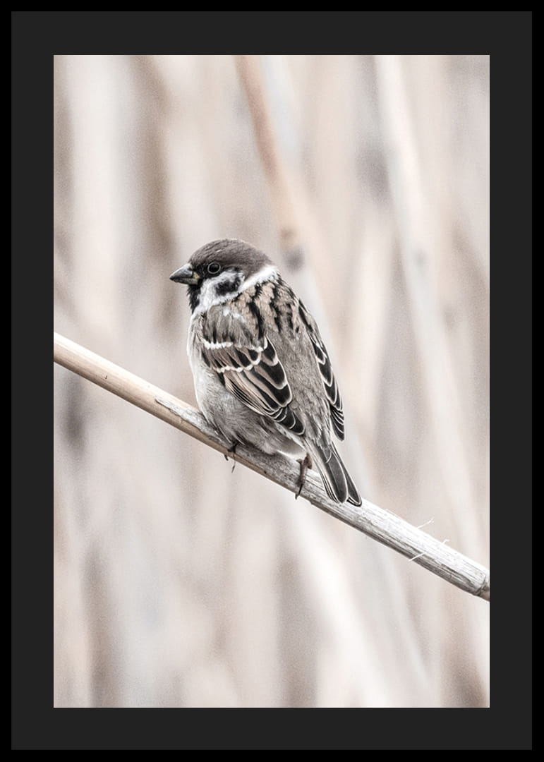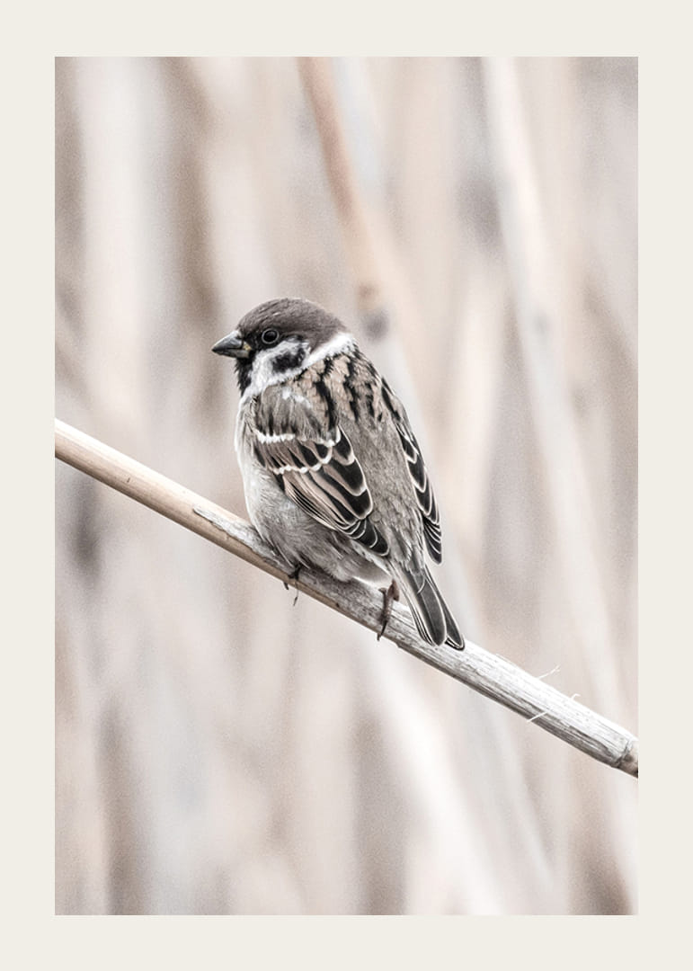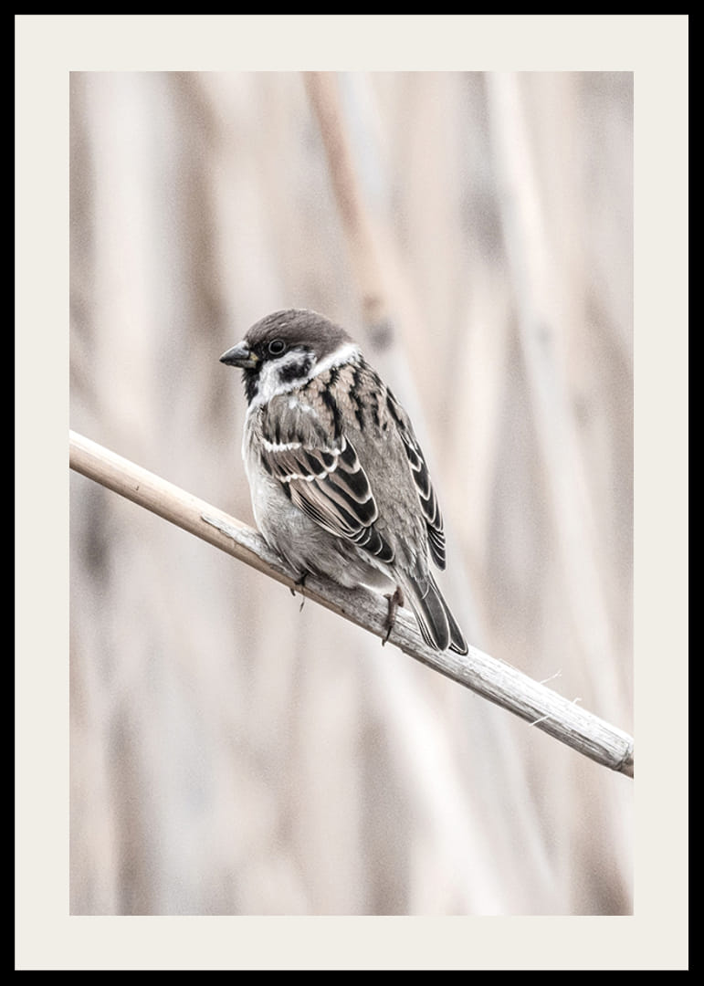 Egy pinty ül egy karcsú ágon elmosódott, világos bézs háttér előtt. A részletesen kidolgozott barna és szürke árnyalatú tollazat tisztán kitűnik, a motívum pedig békés benyomást kelt. Ez a poszter természetes hangulatot teremt, és ugyanolyan jól mutat a folyosón, mint a dolgozószobában vagy a nappaliban.