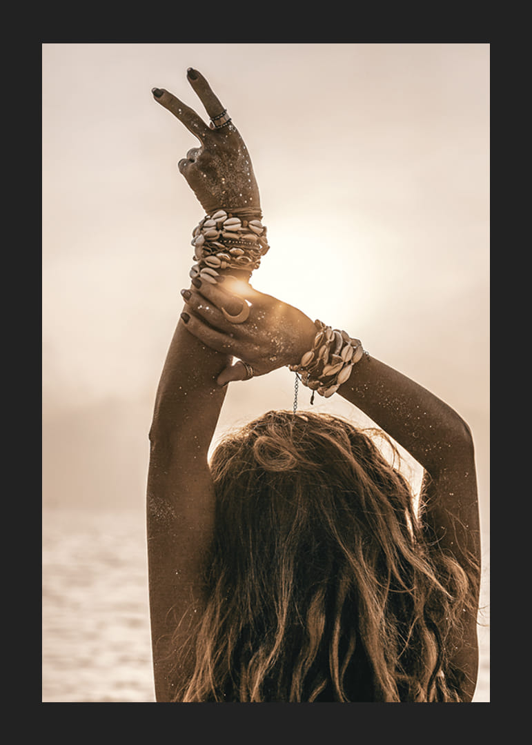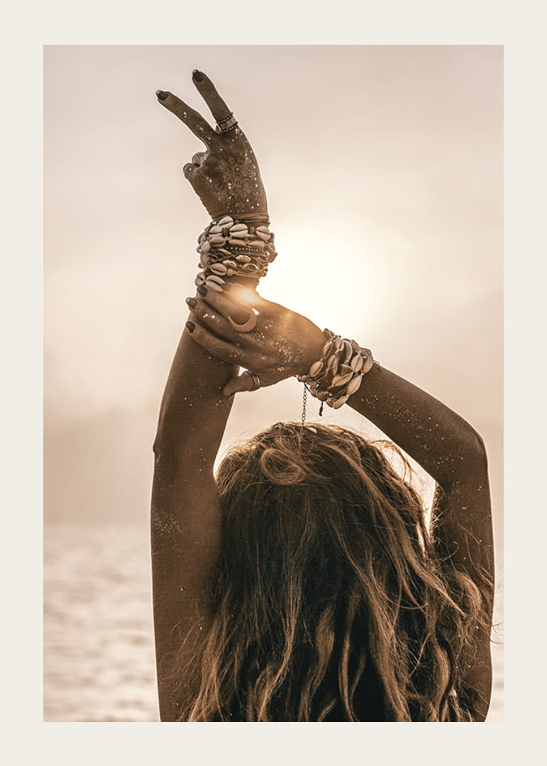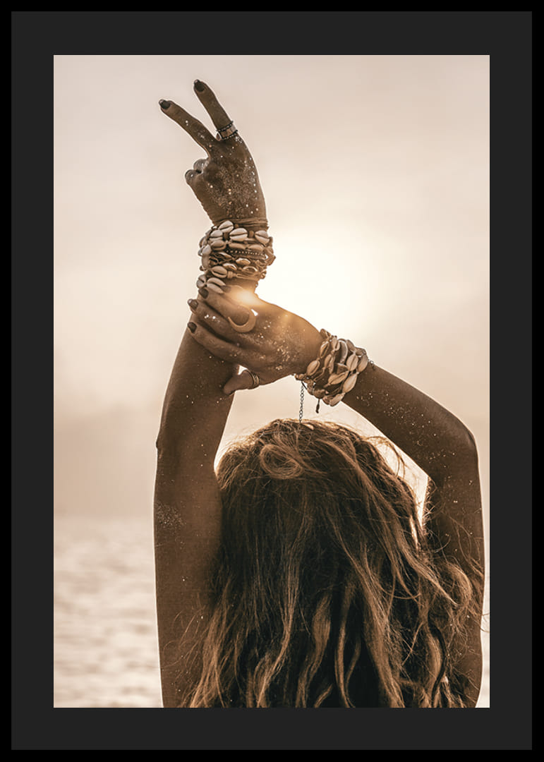 Több kagyló- és gyöngykarkötővel ellátott karok nyúlnak a nap felé, előtérben hosszú, hullámos haj és homokszínű bőr látható. A hátteret lágyan elmosja a tenger és a meleg ellenfény, ami hosszan tartó nyári hangulatot teremt. Ez a poszter laza, bohém hangulatot kölcsönöz mind a hálószobának, mind a nappalinak.