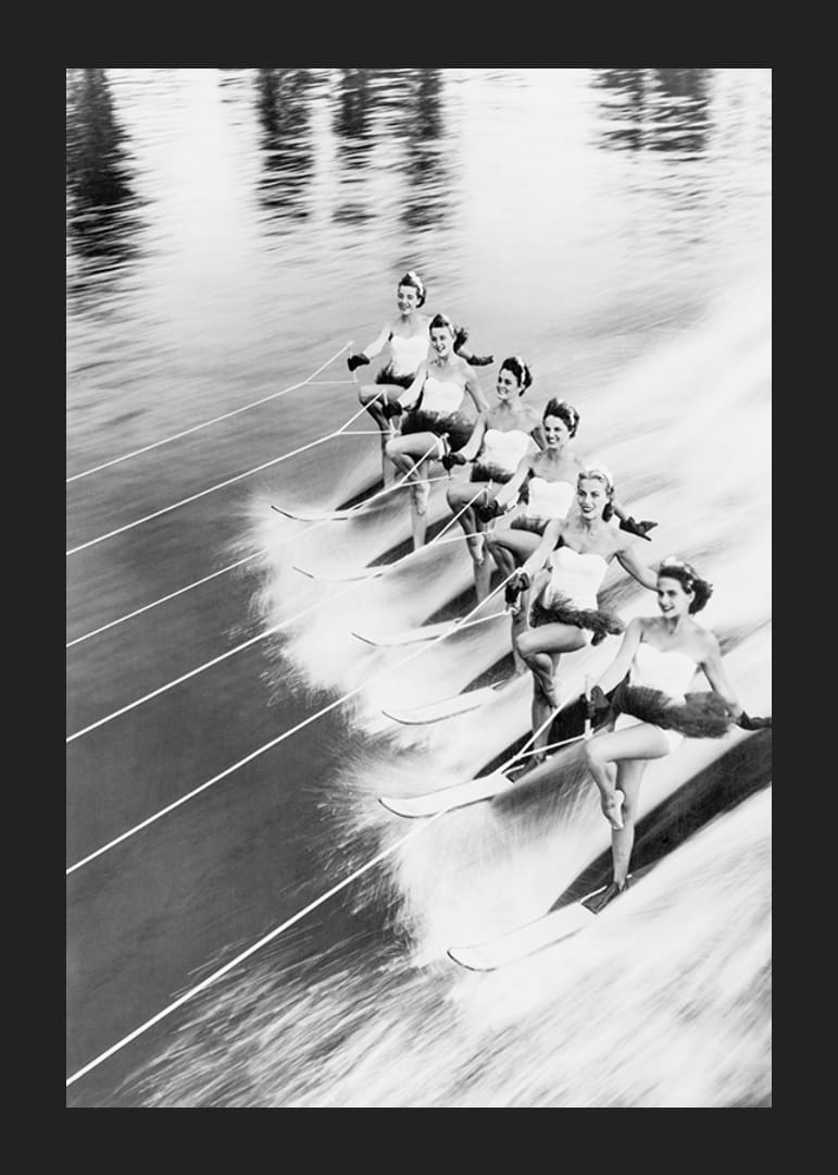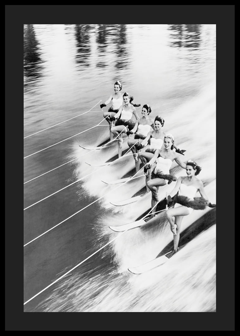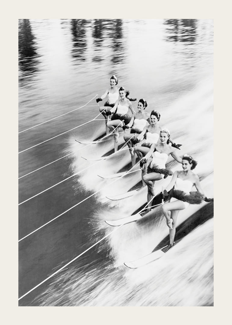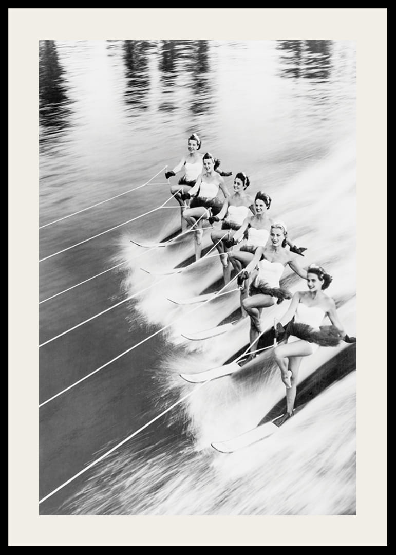 Hat fürdőruhás és kesztyűs nő egyenletes alakzatban vízisíel a vízen, klasszikus fekete-fehér stílusban a 20. század közepéről. A vízpermet dinamikát teremt a kompozícióban és tükrözi a mozgást. Egy retró ihletésű poszter, amely energiát és időtlen karaktert kölcsönöz mind a nappalinak, mind az irodai környezetnek.
