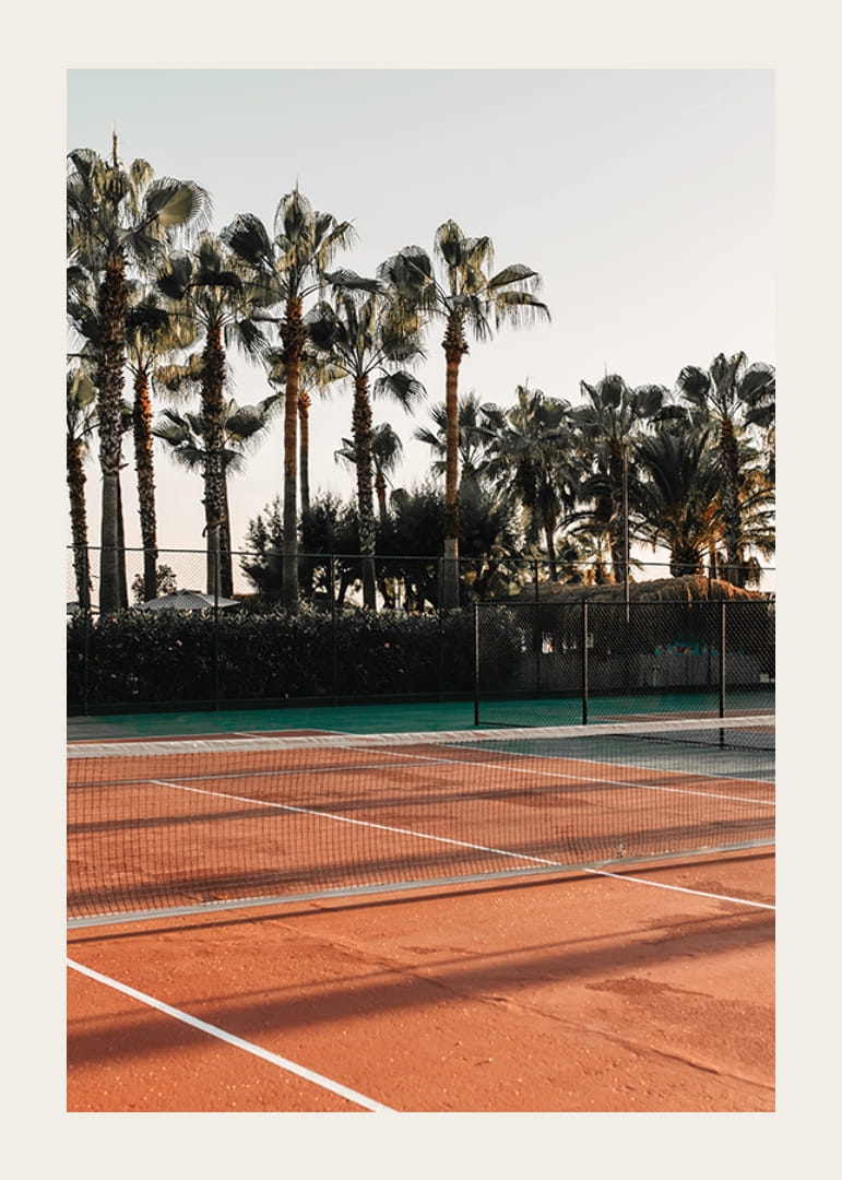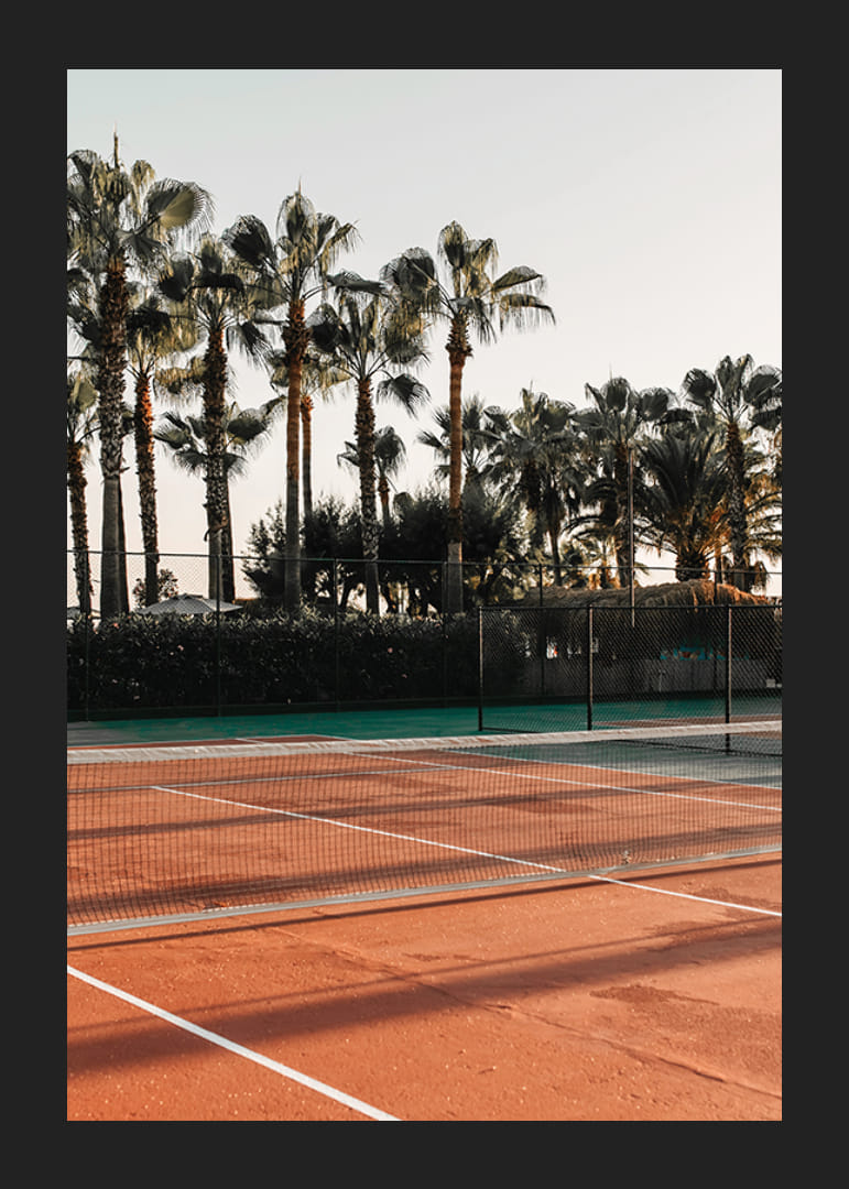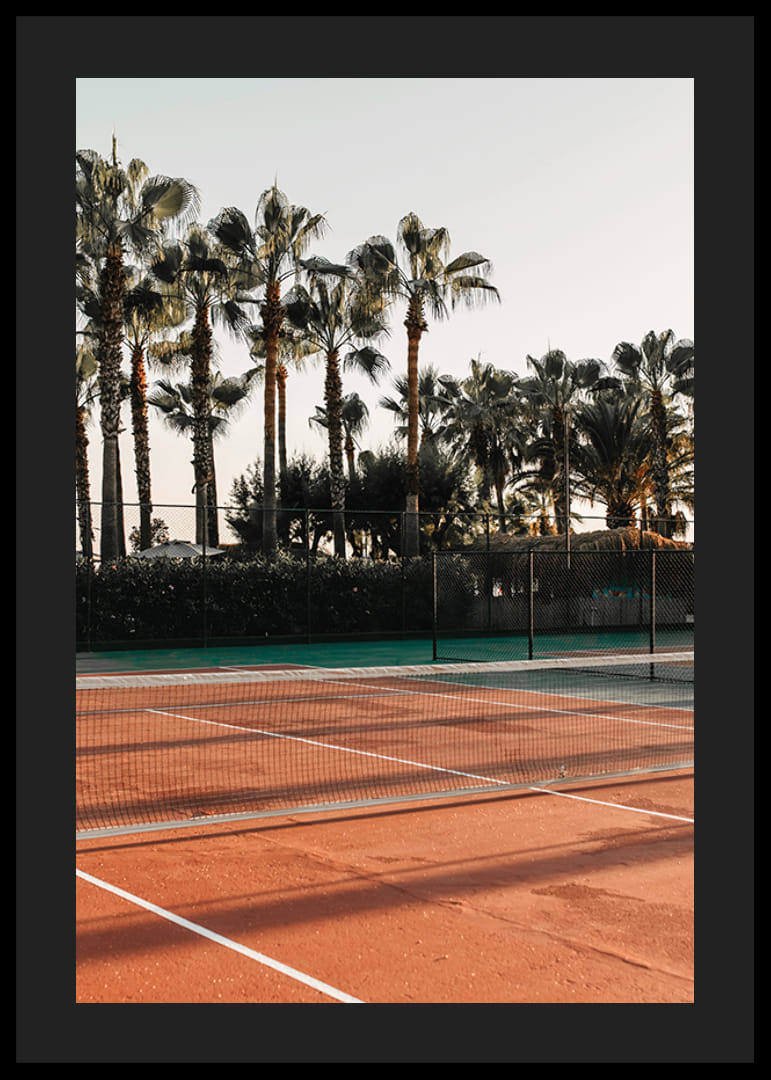 A nap egy vörösesbarna felületű teniszpályára süt, ahol magas pálmafák árnyékai vetülnek a pályára. A háttérben egy kerítés és sűrű növényzet látható, éles kontrasztot alkotva a ragyogó égbolttal. Ez a poszter a nyaralás és a szabadtéri sportok hangulatát kelti, és nappaliba és előszobába egyaránt alkalmas.