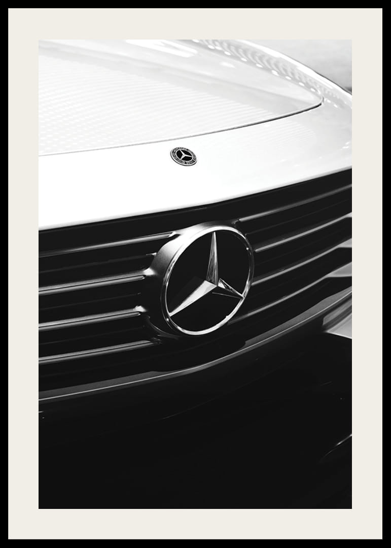 Egy Mercedes-Benz elejéről készült fekete-fehér közeli kép, ahol a klasszikus csillag embléma jól kiemelkedik a hűtőrács vízszintes vonalaiból. A fémes felületek és árnyékok kontrasztja stílusos megjelenést kölcsönöz a motívumnak. Jól illik garázsba, irodába vagy modern szobai részletként, és érdekes poszterként szolgál az autórajongók számára.