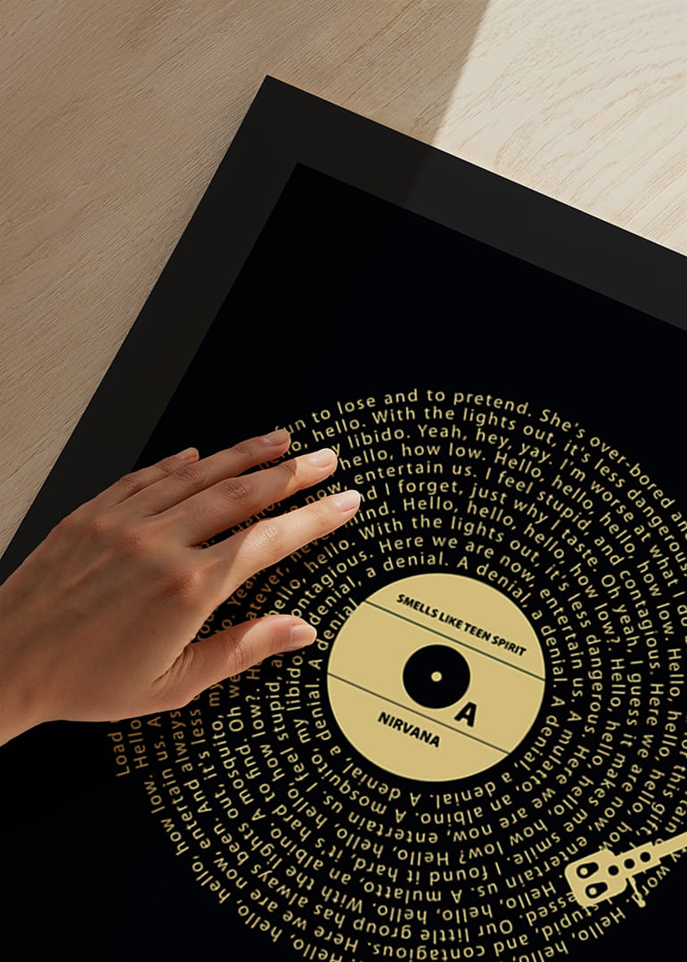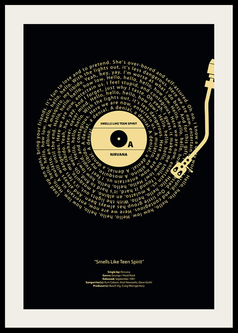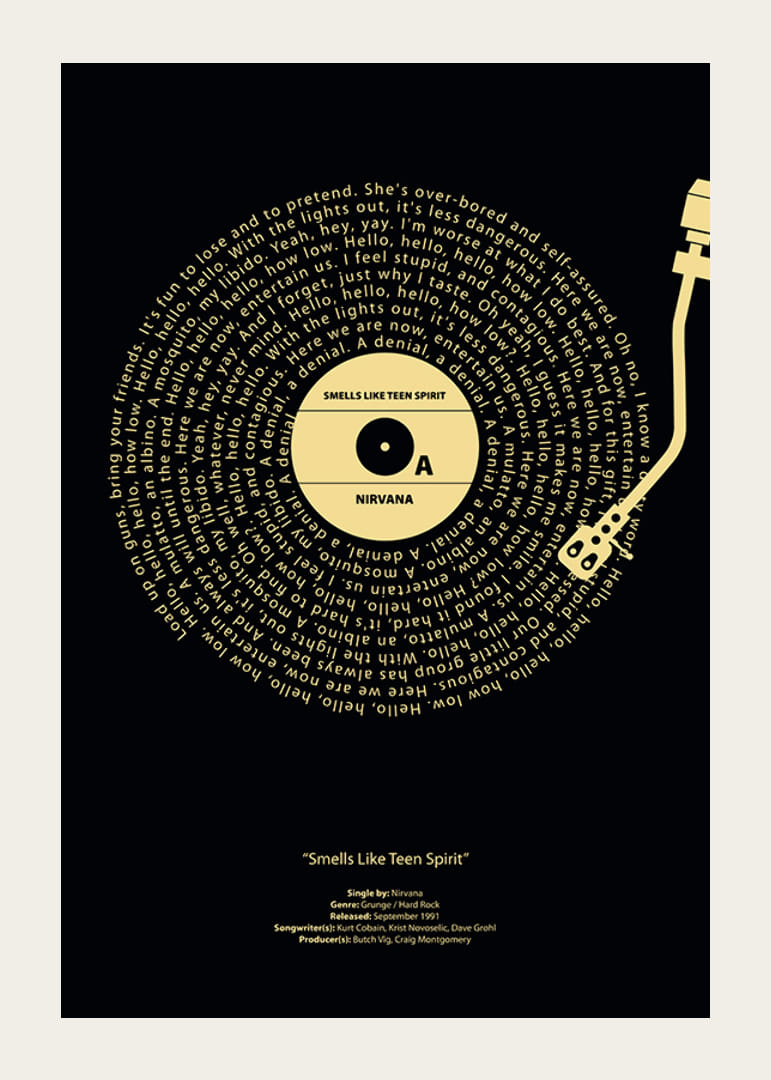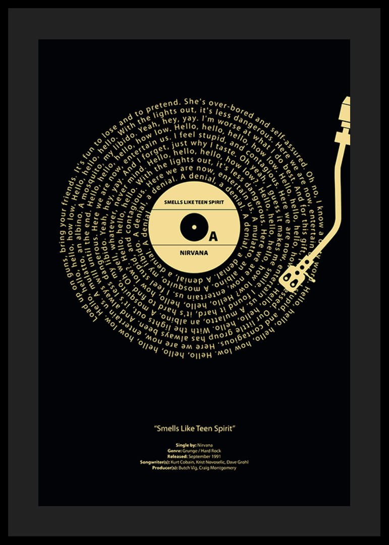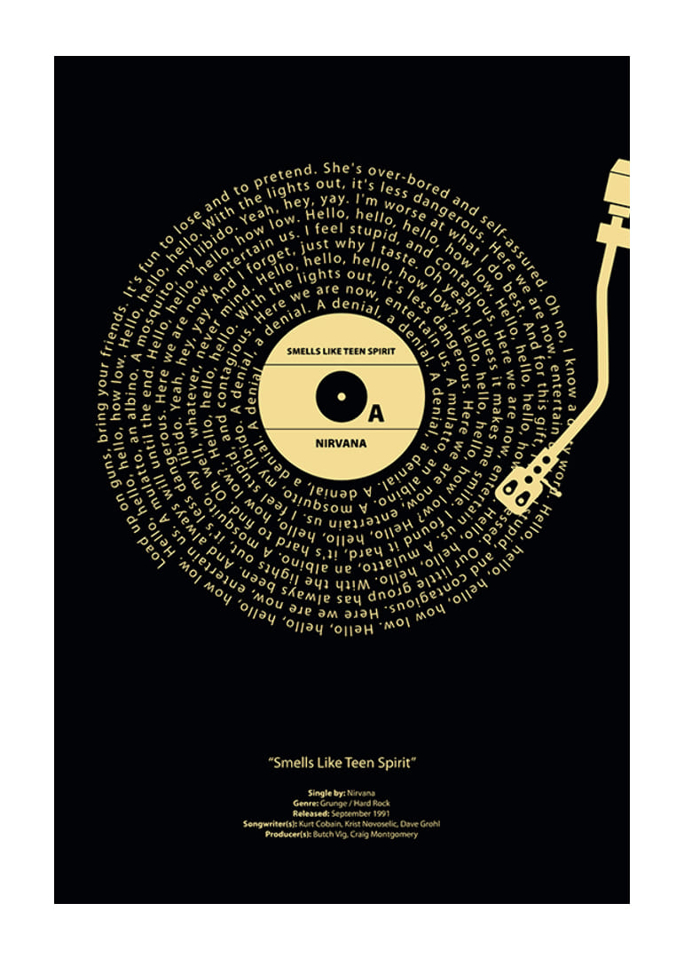 A motívum egy stilizált bakelitlemez, amelyen a Nirvana „Smells Like Teen Spirit” című számának dalszövege körökben elhelyezett számokhoz hasonlóan van kialakítva. A fekete háttér előtt elhelyezett sárga betűk és részletek tiszta, grafikus hatást keltenek. Ez a poszter retró hangulatú és attitűddel jól illik mind a zeneszobákba, mind a nappalikba.